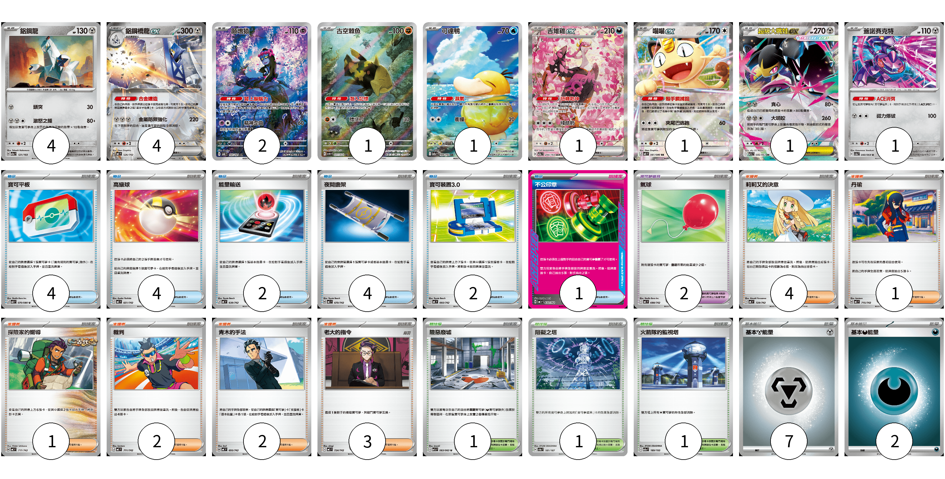 牌組構築方案 以此牌組為基礎新構築牌組 顯示卡面 顯示列表 寶可夢卡(16) 4 4 2 1 1 1 1 1 1 寶可夢道具(2) 2 物品卡(17) 4 4 2 4 2 1 支援者卡(13) 4 1 1 2 2 3 競技場卡(3) 1 1 1 能量卡(9) 7 2 寶可夢卡(16) 卡牌名稱 張數 卡牌名稱 張數 鋁鋼龍 M2a 121/193 04 鋁鋼橋龍ex MC 526/742 04 願增猿 SV6 107/101 02 古空棘魚 SV5K 077/071 01 可達鴨 M2a 199/193 01 吉雉雞ex M2a 244/193 01 喵喵ex M3 061/080 01 超級大嘴娃ex M1L 046/063 01 蓋諾賽克特 SV6a 040/064 01 寶可夢道具(2) 卡牌名稱 張數 卡牌名稱 張數 氣球 MC 688/742 02 物品卡(17) 卡牌名稱 張數 卡牌名稱 張數 寶可平板 M3 070/080 04 高級球 MC 651/742 04 能量輸送 MC 639/742 02 夜間擔架 MC 670/742 04 寶可裝置3.0 MC 660/742 02 不公印章 MC 633/742 01 支援者卡(13) 卡牌名稱 張數 卡牌名稱 張數 莉莉艾的決意 MC 729/742 04 丹瑜 MC 715/742 01 探險家的嚮導 MC 717/742 01 裁判 MC 711/742 02 青木的手法 MC 695/742 02 老大的指令 MC 724/742 03 競技場卡(3) 卡牌名稱 張數 卡牌名稱 張數 險惡廢墟 M1L 063/063 01 阻礙之塔 SV8a 181/187 01 火箭隊的監視塔 M2a 189/193 01 能量卡(9) 卡牌名稱 張數 卡牌名稱 張數 基本【鋼】能量 MC MET 07 基本【惡】能量 MC DAR 02 以此牌組為基礎新構築牌組 牌組編碼 HNfBba-MMrCWr-wTNytW copy 列印牌組單 牌組編碼已複製 分享至SNS