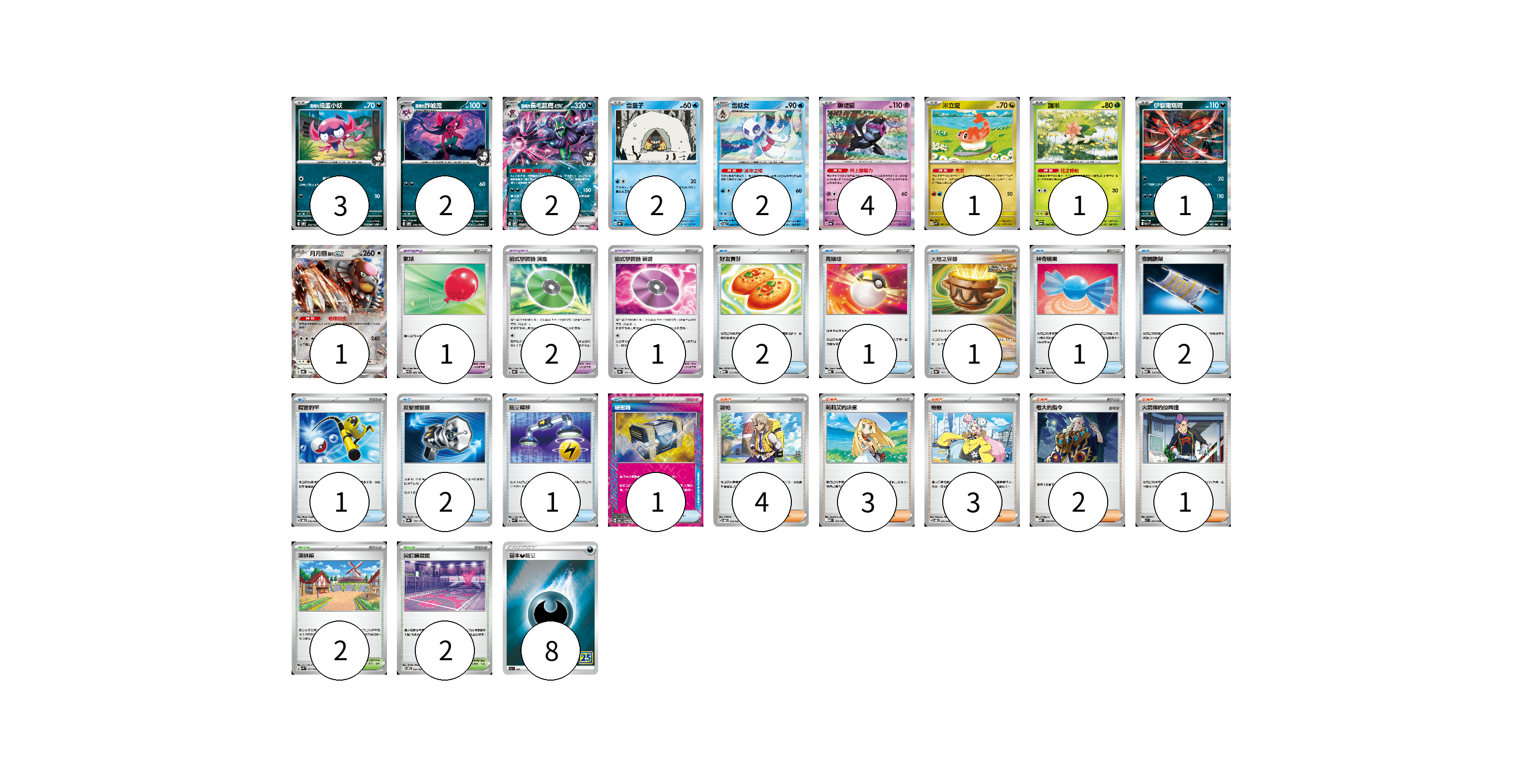 牌組構築方案 以此牌組為基礎新構築牌組 顯示卡面 顯示列表 寶可夢卡(19) 3 2 2 2 2 4 1 1 1 1 寶可夢道具(4) 1 2 1 物品卡(12) 2 1 1 1 2 1 2 1 1 支援者卡(13) 4 3 3 2 1 競技場卡(4) 2 2 能量卡(8) 8 寶可夢卡(19) 卡牌名稱 張數 卡牌名稱 張數 <瑪俐的>搗蛋小妖 SVOM 005/021 03 <瑪俐的>詐唬魔 SVOM 006/021 02 <瑪俐的>長毛巨魔ex SVOM 007/021 02 雪童子 SV8a 037/187 02 雪妖女 SV6 033/101 02 願增猿 SV8a 075/187 04 米立龍 SVK 002/042 01 謝米 SV9a 006/063 01 伊裴爾塔爾 M1L 040/063 01 月月熊 赫月ex SV8a 134/187 01 寶可夢道具(4) 卡牌名稱 張數 卡牌名稱 張數 氣球 SV11B 082/086 01 招式學習器 演進 SV8a 160/187 02 招式學習器 衰退 SV8a 161/187 01 物品卡(12) 卡牌名稱 張數 卡牌名稱 張數 好友寶芬 MBD 013/022 02 高級球 MBD 014/022 01 大地之容器 SV8a 143/187 01 神奇糖果 MBG 013/022 01 夜間擔架 MBD 016/022 02 厲害釣竿 SVOD 010/020 01 反擊捕捉器 SV8a 139/187 02 能量轉移 SVK 008/042 01 秘密箱 SV6 092/101 01 支援者卡(13) 卡牌名稱 張數 卡牌名稱 張數 派帕 SVOD 018/020 04 莉莉艾的決意 MBD 021/022 03 奇樹 SVOD 016/020 03 老大的指令 MBD 020/022 02 火箭隊的拉姆達 SV10 094/098 01 競技場卡(4) 卡牌名稱 張數 卡牌名稱 張數 深缽鎮 SVK 039/042 02 尖釘鎮道館 SVOM 021/021 02 能量卡(8) 卡牌名稱 張數 卡牌名稱 張數 基本惡能量 S8a DAR 08 以此牌組為基礎新構築牌組 牌組編碼 HRygkx-vTSSjM-LyHBuj copy 列印牌組單 牌組編碼已複製 分享至SNS