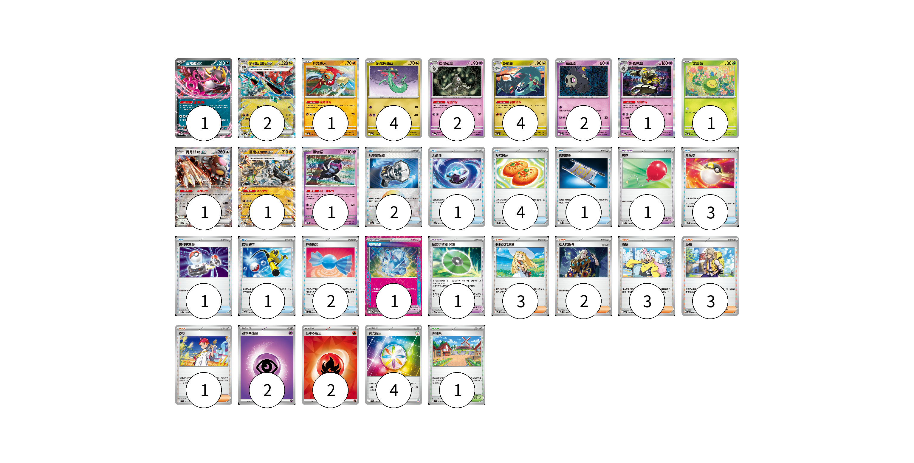 牌組構築方案 以此牌組為基礎新構築牌組 顯示卡面 顯示列表 寶可夢卡(21) 1 2 1 4 2 4 2 1 1 1 1 1 寶可夢道具(2) 1 1 物品卡(16) 2 1 4 1 1 3 1 1 2 支援者卡(12) 3 2 3 3 1 競技場卡(1) 1 能量卡(8) 2 2 4 寶可夢卡(21) 卡牌名稱 張數 卡牌名稱 張數 吉雉雞ex SVOM 009/021 01 多龍巴魯托ex SV8a 120/187 02 摔角鷹人 SV8a 084/187 01 多龍梅西亞 SV8a 118/187 04 彷徨夜靈 SV8a 065/187 02 多龍奇 SV8a 119/187 04 夜巡靈 SV8a 064/187 02 黑夜魔靈 SV8a 066/187 01 含羞苞 SV8a 001/187 01 月月熊 赫月ex SV8a 134/187 01 厄鬼椪 礎石面具ex SV8a 091/187 01 願增猿 SV8a 075/187 01 寶可夢道具(2) 卡牌名稱 張數 卡牌名稱 張數 璀璨結晶 SV8a 152/187 01 招式學習器 演進 SVK 025/042 01 物品卡(16) 卡牌名稱 張數 卡牌名稱 張數 反擊捕捉器 SV8a 139/187 02 太晶珠 SV8a 145/187 01 好友寶芬 SV8a 147/187 04 夜間擔架 MBD 016/022 01 氣球 MBD 018/022 01 高級球 MBD 014/022 03 寶可夢交替 MBG 015/022 01 厲害釣竿 SVOD 010/020 01 神奇糖果 SVOD 013/020 02 支援者卡(12) 卡牌名稱 張數 卡牌名稱 張數 莉莉艾的決意 MBD 021/022 03 老大的指令 MBG 021/022 02 奇樹 SVOD 016/020 03 派帕 SVOD 018/020 03 赤松 SV8a 163/187 01 競技場卡(1) 卡牌名稱 張數 卡牌名稱 張數 深缽鎮 SVK 039/042 01 能量卡(8) 卡牌名稱 張數 卡牌名稱 張數 基本【超】能量 MBD PSY 02 基本【火】能量 SVQL FIR 02 夜光能量 SV4a 190/190 04 以此牌組為基礎新構築牌組 牌組編碼 HUpjhX-aencMX-gtIRuw copy 列印牌組單 牌組編碼已複製 分享至SNS