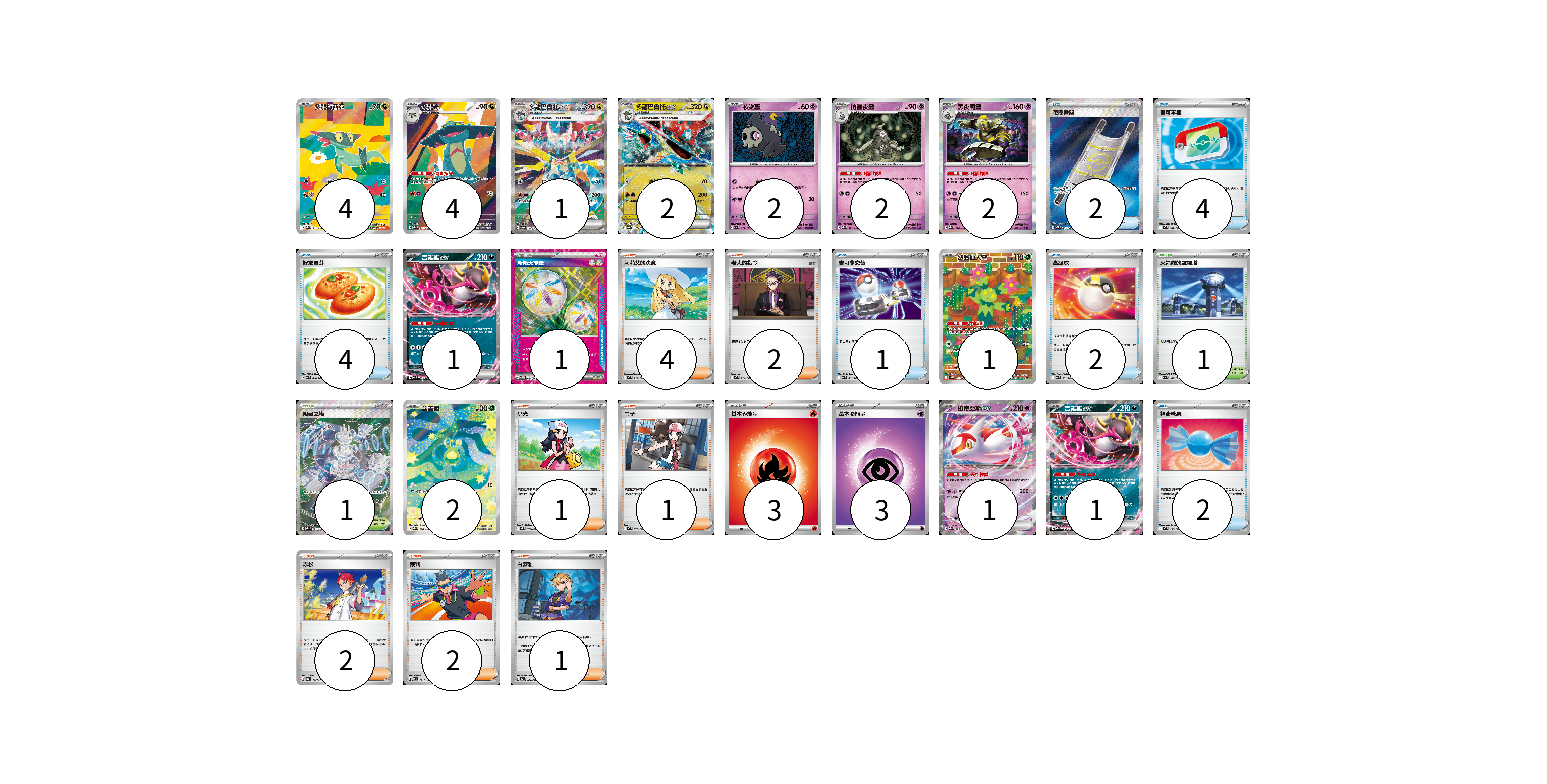 牌組構築方案 以此牌組為基礎新構築牌組 顯示卡面 顯示列表 寶可夢卡(23) 4 4 1 2 2 2 2 1 1 2 1 1 物品卡(15) 2 4 4 1 2 2 支援者卡(13) 4 2 1 1 2 2 1 競技場卡(2) 1 1 能量卡(7) 1 3 3 寶可夢卡(23) 卡牌名稱 張數 卡牌名稱 張數 多龍梅西亞 M2a 211/193 04 多龍奇 M2a 212/193 04 多龍巴魯托ex SV8a 221/187 01 多龍巴魯托ex SV8a 120/187 02 夜巡靈 M2a 072/193 02 彷徨夜靈 M2a 073/193 02 黑夜魔靈 M2a 074/193 02 吉雉雞ex MC 489/742 01 沙鈴仙人掌 SV9 101/100 01 含羞苞 M2a 196/193 02 拉帝亞斯ex M2a 075/193 01 吉雉雞ex M2a 114/193 01 物品卡(15) 卡牌名稱 張數 卡牌名稱 張數 夜間擔架 M1L 083/063 02 寶可平板 MC 662/742 04 好友寶芬 MC 648/742 04 寶可夢交替 MC 663/742 01 高級球 MC 651/742 02 神奇糖果 MC 655/742 02 支援者卡(13) 卡牌名稱 張數 卡牌名稱 張數 莉莉艾的決意 MC 729/742 04 老大的指令 MC 724/742 02 小光 M2 077/080 01 鬥子 MC 718/742 01 赤松 SV8a 163/187 02 裁判 MC 711/742 02 白蕾雅 MC 722/742 01 競技場卡(2) 卡牌名稱 張數 卡牌名稱 張數 火箭隊的監視塔 M2a 189/193 01 阻礙之塔 M2a 222/193 01 能量卡(7) 卡牌名稱 張數 卡牌名稱 張數 新衝天能量 SV5K 071/071 01 基本【火】能量 MC FIR 03 基本【超】能量 MC PSY 03 以此牌組為基礎新構築牌組 牌組編碼 HVcMhZ-QjIjzF-UgCmdc copy 列印牌組單 牌組編碼已複製 分享至SNS
