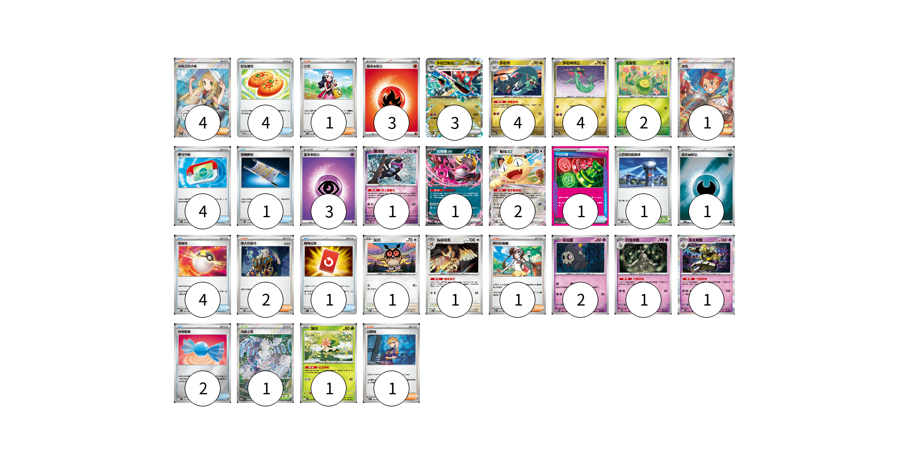 牌組構築方案 以此牌組為基礎新構築牌組 顯示卡面 顯示列表 寶可夢卡(24) 3 4 4 2 1 1 2 1 1 2 1 1 1 物品卡(17) 4 4 1 1 4 1 2 支援者卡(10) 4 1 1 2 1 1 競技場卡(2) 1 1 能量卡(7) 3 3 1 寶可夢卡(24) 卡牌名稱 張數 卡牌名稱 張數 多龍巴魯托ex MC 548/742 03 多龍奇 M2a 133/193 04 多龍梅西亞 M2a 132/193 04 含羞苞 M2a 011/193 02 願增猿 M2a 081/193 01 吉雉雞ex MC 489/742 01 喵喵ex M3 061/080 02 咕咕 MC 572/742 01 貓頭夜鷹 MC 573/742 01 夜巡靈 MC 308/742 02 彷徨夜靈 M2a 073/193 01 黑夜魔靈 M2a 074/193 01 謝米 M2a 012/193 01 物品卡(17) 卡牌名稱 張數 卡牌名稱 張數 好友寶芬 SVTG 011/019 04 寶可平板 M3 070/080 04 夜間擔架 MBD 016/022 01 不公印章 MC 633/742 01 高級球 MC 651/742 04 特殊紅牌 M4 072/083 01 神奇糖果 MC 655/742 02 支援者卡(10) 卡牌名稱 張數 卡牌名稱 張數 莉莉艾的決意 M1L 086/063 04 小光 M2 077/080 01 赤松 SV7 123/102 01 老大的指令 MBD 020/022 02 鳴依的勉勵 M3 075/080 01 白蕾雅 MC 722/742 01 競技場卡(2) 卡牌名稱 張數 卡牌名稱 張數 火箭隊的監視塔 M2a 189/193 01 阻礙之塔 M2a 222/193 01 能量卡(7) 卡牌名稱 張數 卡牌名稱 張數 基本【火】能量 M-P FIR 03 基本【超】能量 MBD PSY 03 基本【惡】能量 MC DAR 01 以此牌組為基礎新構築牌組 牌組編碼 HYGRWw-NPnzRQ-etlVCK copy 列印牌組單 牌組編碼已複製 分享至SNS