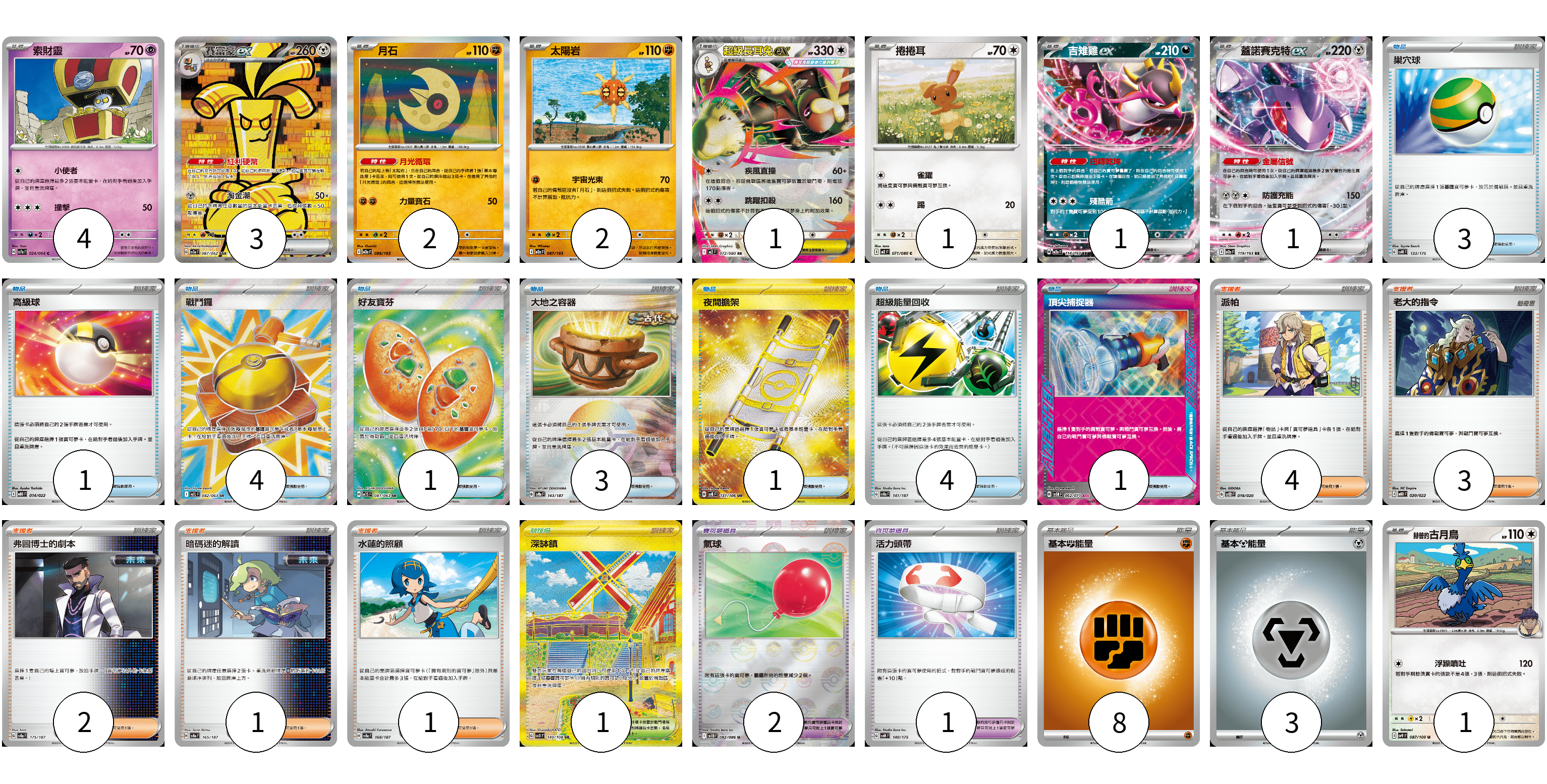 牌組構築方案 以此牌組為基礎新構築牌組 顯示卡面 顯示列表 寶可夢卡(16) 4 3 2 2 1 1 1 1 1 寶可夢道具(3) 2 1 物品卡(18) 3 1 4 1 3 1 4 1 支援者卡(11) 4 3 2 1 1 競技場卡(1) 1 能量卡(11) 8 3 寶可夢卡(16) 卡牌名稱 張數 卡牌名稱 張數 索財靈 SV7a 024/064 04 賽富豪ex SV3a 087/062 03 月石 M2a 086/193 02 太陽岩 M2a 087/193 02 超級長耳兔ex M2 072/080 01 捲捲耳 M2 071/080 01 吉雉雞ex M2a 114/193 01 蓋諾賽克特ex M2a 119/193 01 赫普的古月鳥 SV9 087/100 01 寶可夢道具(3) 卡牌名稱 張數 卡牌名稱 張數 氣球 SV11B 082/086 02 活力頭帶 SVM 140/175 01 物品卡(18) 卡牌名稱 張數 卡牌名稱 張數 巢穴球 SVM 133/175 03 高級球 MBD 014/022 01 戰鬥鑼 M1L 082/063 04 好友寶芬 M1S 081/063 01 大地之容器 SV8a 143/187 03 夜間擔架 SV8 137/106 01 超級能量回收 SV8a 141/187 04 頂尖捕捉器 SV5M 062/071 01 支援者卡(11) 卡牌名稱 張數 卡牌名稱 張數 派帕 SVOD 018/020 04 老大的指令 MBD 020/022 03 弗圖博士的劇本 SV8a 175/187 02 暗碼迷的解讀 SV8a 165/187 01 水蓮的照顧 SV8a 168/187 01 競技場卡(1) 卡牌名稱 張數 卡牌名稱 張數 深缽鎮 SV3 140/108 01 能量卡(11) 卡牌名稱 張數 卡牌名稱 張數 基本【鬥】能量 M-P FIG 08 基本【鋼】能量 M-P MET 03 以此牌組為基礎新構築牌組 牌組編碼 HbWdyY-nplgrk-fHtEIl copy 列印牌組單 牌組編碼已複製 分享至SNS