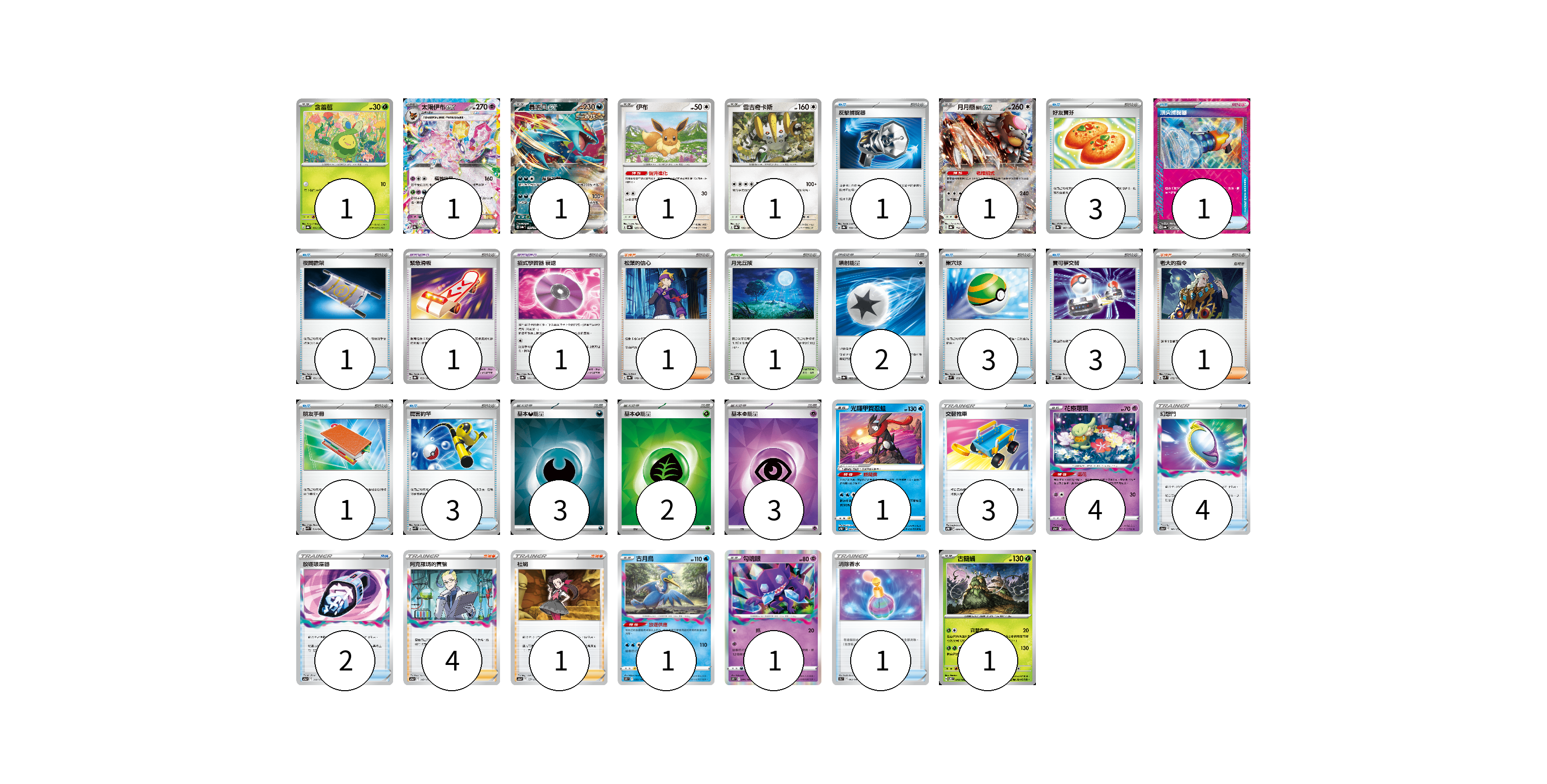 牌組構築方案 以此牌組為基礎新構築牌組 顯示卡面 顯示列表 寶可夢卡(14) 1 1 1 1 1 1 1 4 1 1 1 寶可夢道具(2) 1 1 物品卡(26) 1 3 1 1 3 3 1 3 3 4 2 1 支援者卡(7) 1 1 4 1 競技場卡(1) 1 能量卡(10) 2 3 2 3 寶可夢卡(14) 卡牌名稱 張數 卡牌名稱 張數 含羞苞 SV8a 001/187 01 太陽伊布ex SV8a 063/187 01 轟鳴月ex SV8a 101/187 01 伊布 SV8a 125/187 01 雷吉奇卡斯 SV8a 132/187 01 月月熊 赫月ex SV8a 134/187 01 光輝甲賀忍蛙 SVTG 002/019 01 花療環環 S12a 064/172 04 古月鳥 S11 033/100 01 勾魂眼 S11 044/100 01 古簡蝸 SV8 010/106 01 寶可夢道具(2) 卡牌名稱 張數 卡牌名稱 張數 緊急滑板 SV8a 153/187 01 招式學習器 衰退 SV8a 161/187 01 物品卡(26) 卡牌名稱 張數 卡牌名稱 張數 反擊捕捉器 SV8a 139/187 01 好友寶芬 SV8a 147/187 03 頂尖捕捉器 SV8a 148/187 01 夜間擔架 SV8a 151/187 01 巢穴球 SVM 133/175 03 寶可夢交替 SVM 136/175 03 朋友手冊 SVK 014/042 01 厲害釣竿 SVK 011/042 03 交替推車 SVTR 009/021 03 幻想門 S12a 141/172 04 放逐吸塵器 S12a 144/172 02 消除香水 S9a 063/067 01 支援者卡(7) 卡牌名稱 張數 卡牌名稱 張數 松葉的信心 SV8a 178/187 01 老大的指令 SVM 172/175 01 阿克羅瑪的實驗 S12a 148/172 04 杜娟 S12a 157/172 01 競技場卡(1) 卡牌名稱 張數 卡牌名稱 張數 月光丘陵 SV8a 183/187 01 能量卡(10) 卡牌名稱 張數 卡牌名稱 張數 噴射能量 SV8a 185/187 02 基本【惡】能量 SVK DAR 03 基本【草】能量 SVK GRA 02 基本【超】能量 SVK PSY 03 以此牌組為基礎新構築牌組 牌組編碼 HcqqYF-LjjYDD-nkSLEA copy 列印牌組單 牌組編碼已複製 分享至SNS