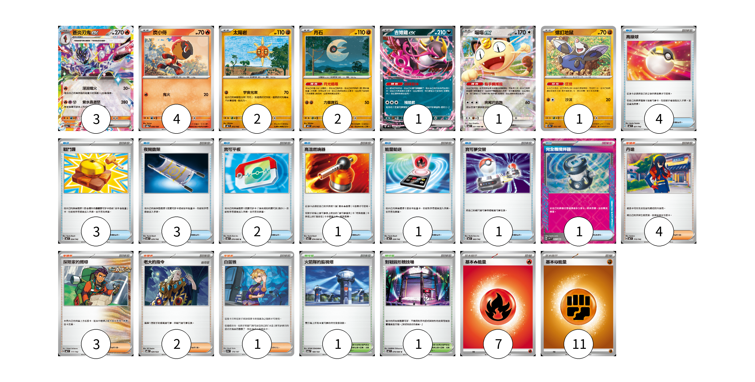 牌組構築方案 以此牌組為基礎新構築牌組 顯示卡面 顯示列表 寶可夢卡(14) 3 4 2 2 1 1 1 物品卡(16) 4 3 3 2 1 1 1 1 支援者卡(10) 4 3 2 1 競技場卡(2) 1 1 能量卡(18) 7 11 寶可夢卡(14) 卡牌名稱 張數 卡牌名稱 張數 蒼炎刃鬼ex M2a 031/193 03 炭小侍 M2a 030/193 04 太陽岩 MC 372/742 02 月石 MC 371/742 02 吉雉雞ex MC 489/742 01 喵喵ex M3 061/080 01 螺釘地鼠 SV8a 083/187 01 物品卡(16) 卡牌名稱 張數 卡牌名稱 張數 高級球 MC 651/742 04 戰鬥鑼 MC 654/742 03 夜間擔架 MC 670/742 03 寶可平板 M3 070/080 02 高溫燃燒器 M2 074/080 01 能量輸送 MC 639/742 01 寶可夢交替 MC 663/742 01 完全體攪拌器 SVK 017/042 01 支援者卡(10) 卡牌名稱 張數 卡牌名稱 張數 丹瑜 MC 715/742 04 探險家的嚮導 MC 717/742 03 老大的指令 MBD 020/022 02 白蕾雅 SV8a 176/187 01 競技場卡(2) 卡牌名稱 張數 卡牌名稱 張數 火箭隊的監視塔 M2a 189/193 01 對戰圓形競技場 M2 079/080 01 能量卡(18) 卡牌名稱 張數 卡牌名稱 張數 基本【火】能量 MC FIR 07 基本【鬥】能量 MC FIG 11 以此牌組為基礎新構築牌組 牌組編碼 HdUKlu-wsodpY-bFVpjH copy 列印牌組單 牌組編碼已複製 分享至SNS