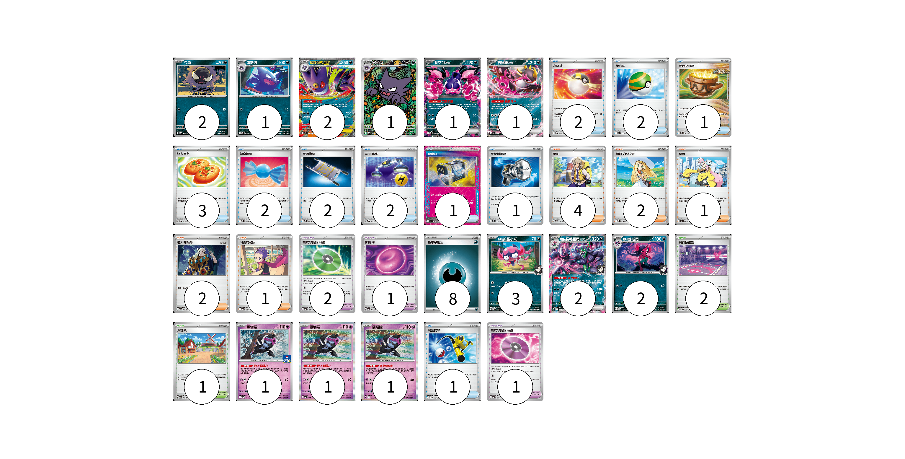 牌組構築方案 以此牌組為基礎新構築牌組 顯示卡面 顯示列表 寶可夢卡(18) 2 1 2 1 1 1 3 2 2 1 1 1 寶可夢道具(4) 2 1 1 物品卡(17) 2 2 1 3 2 2 2 1 1 1 支援者卡(10) 4 2 1 2 1 競技場卡(3) 2 1 能量卡(8) 8 寶可夢卡(18) 卡牌名稱 張數 卡牌名稱 張數 鬼斯 MBG 001/022 02 鬼斯通 MBG 002/022 01 超級耿鬼ex MBG 003/022 02 鬼斯通 MBG 023/022 01 桃歹郎ex MBG 009/022 01 吉雉雞ex SV6a 038/064 01 <瑪俐的>搗蛋小妖 SVOM 005/021 03 <瑪俐的>長毛巨魔ex SVOM 007/021 02 <瑪俐的>詐唬魔 SVOM 006/021 02 願增猿 M-P 014/M-P 01 願增猿 SV8a 075/187 01 願增猿 SV6 055/101 01 寶可夢道具(4) 卡牌名稱 張數 卡牌名稱 張數 招式學習器 演進 SV8a 160/187 02 鎖鏈糬 SV8a 154/187 01 招式學習器 衰退 SV8a 161/187 01 物品卡(17) 卡牌名稱 張數 卡牌名稱 張數 高級球 MBD 014/022 02 巢穴球 SVM 133/175 02 大地之容器 SV8a 143/187 01 好友寶芬 MBD 013/022 03 神奇糖果 MBG 013/022 02 夜間擔架 MBD 016/022 02 能量轉移 SVM 127/175 02 秘密箱 SV6 092/101 01 反擊捕捉器 SV8a 139/187 01 厲害釣竿 SVOD 010/020 01 支援者卡(10) 卡牌名稱 張數 卡牌名稱 張數 派帕 SVOD 018/020 04 莉莉艾的決意 MBD 021/022 02 奇樹 SVOD 016/020 01 老大的指令 MBD 020/022 02 阿杏的秘招 SV8a 166/187 01 競技場卡(3) 卡牌名稱 張數 卡牌名稱 張數 尖釘鎮道館 SVOM 021/021 02 深缽鎮 SVK 039/042 01 能量卡(8) 卡牌名稱 張數 卡牌名稱 張數 基本【惡】能量 MBG DAR 08 以此牌組為基礎新構築牌組 牌組編碼 HdnpkP-nUvgIP-CrsgMS copy 列印牌組單 牌組編碼已複製 分享至SNS