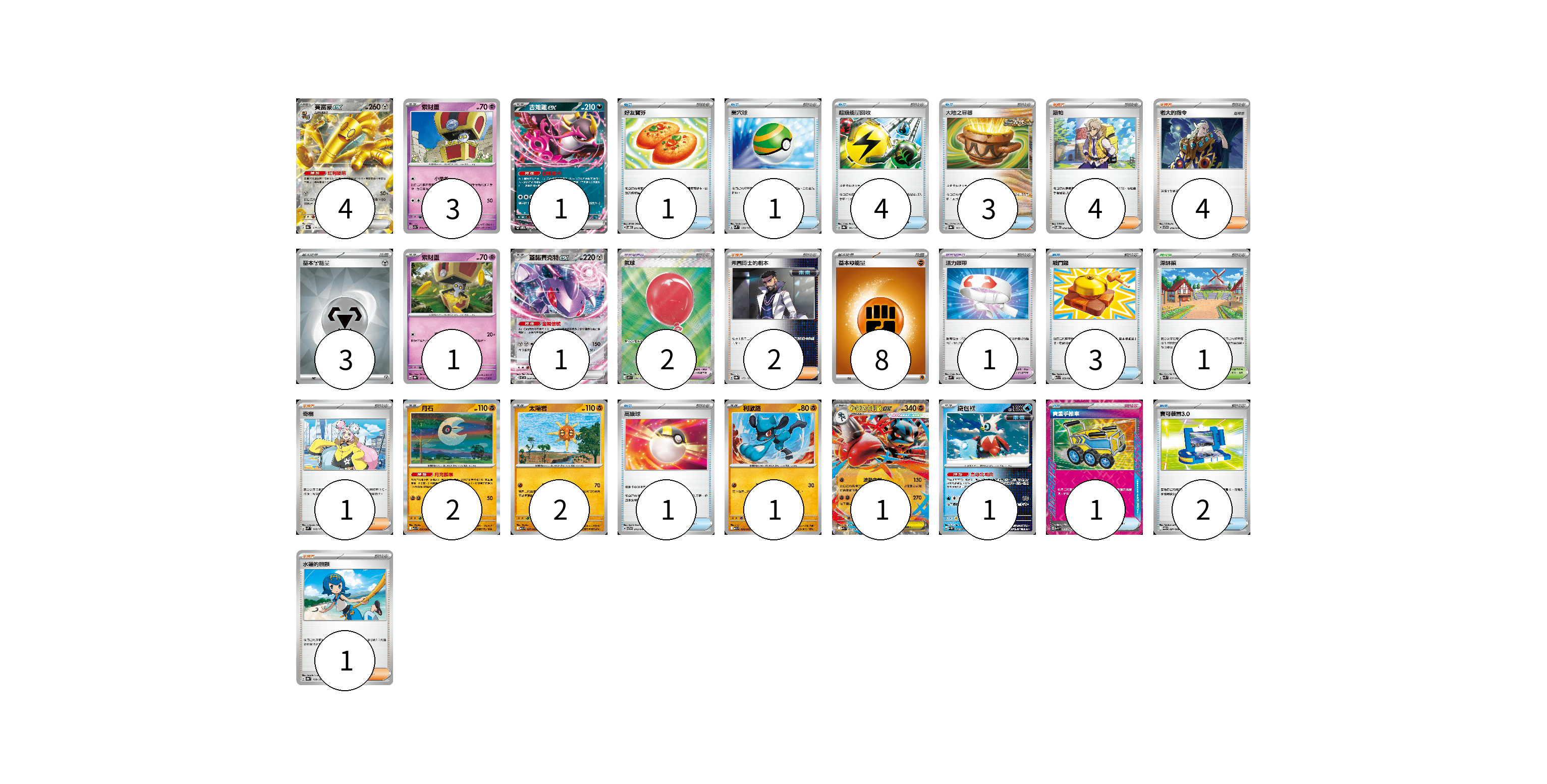 牌組構築方案 以此牌組為基礎新構築牌組 顯示卡面 顯示列表 寶可夢卡(17) 4 3 1 1 1 2 2 1 1 1 寶可夢道具(3) 2 1 物品卡(16) 1 1 4 3 3 1 1 2 支援者卡(12) 4 4 2 1 1 競技場卡(1) 1 能量卡(11) 3 8 寶可夢卡(17) 卡牌名稱 張數 卡牌名稱 張數 賽富豪ex SV8a 117/187 04 索財靈 SV7a 024/064 03 吉雉雞ex SVOM 009/021 01 索財靈 SV8a 073/187 01 蓋諾賽克特ex SV11B 069/086 01 月石 M1L 026/063 02 太陽岩 M1L 027/063 02 利歐路 M1L 028/063 01 超級路卡利歐ex M1L 029/063 01 鐵包袱 SV4M 020/066 01 寶可夢道具(3) 卡牌名稱 張數 卡牌名稱 張數 氣球 M1L 084/063 02 活力頭帶 SVM 140/175 01 物品卡(16) 卡牌名稱 張數 卡牌名稱 張數 好友寶芬 SVOD 011/020 01 巢穴球 SVM 133/175 01 超級能量回收 SV8a 141/187 04 大地之容器 SV8a 143/187 03 戰鬥鑼 M1L 059/063 03 高級球 SVTG 013/019 01 貴重手推車 SVK 020/042 01 寶可裝置3.0 SV11B 081/086 02 支援者卡(12) 卡牌名稱 張數 卡牌名稱 張數 派帕 SVOD 018/020 04 老大的指令 SVTG 019/019 04 弗圖博士的劇本 SV8a 175/187 02 奇樹 SVM 160/175 01 水蓮的照顧 SV8a 168/187 01 競技場卡(1) 卡牌名稱 張數 卡牌名稱 張數 深缽鎮 SVK 039/042 01 能量卡(11) 卡牌名稱 張數 卡牌名稱 張數 基本【鋼】能量 SVOD MET 03 基本【鬥】能量 M-P FIG 08 以此牌組為基礎新構築牌組 牌組編碼 HeDkhq-SneIOs-EIbpHn copy 列印牌組單 牌組編碼已複製 分享至SNS