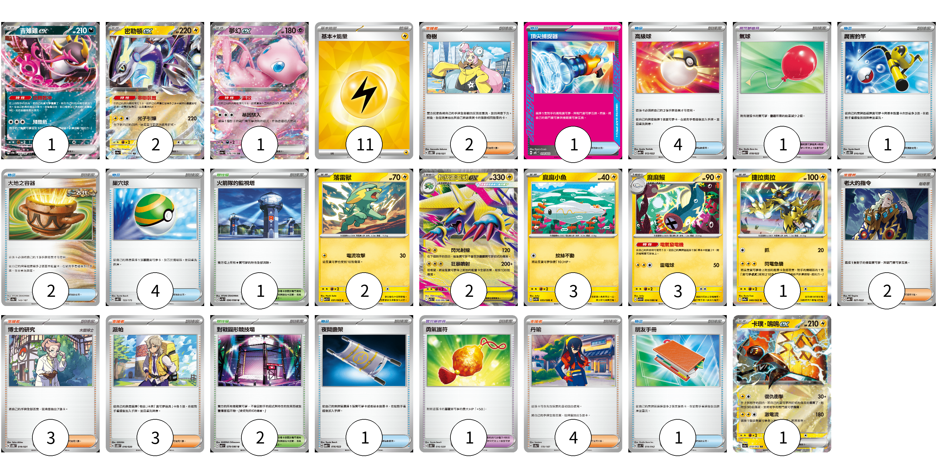 牌組構築方案 以此牌組為基礎新構築牌組 顯示卡面 顯示列表 寶可夢卡(16) 1 2 1 2 2 3 3 1 1 寶可夢道具(1) 1 物品卡(15) 1 4 1 1 2 4 1 1 支援者卡(14) 2 2 3 3 4 競技場卡(3) 1 2 能量卡(11) 11 寶可夢卡(16) 卡牌名稱 張數 卡牌名稱 張數 吉雉雞ex SV8a 104/187 01 密勒頓ex SV4a 071/190 02 夢幻ex SV4a 076/190 01 落雷獸 M1S 031/063 02 超級雷電獸ex M1S 032/063 02 麻麻小魚 SV11B 033/086 03 麻麻鰻 SV11B 034/086 03 捷拉奧拉 SV9a 040/063 01 卡璞・鳴鳴ex SV3a 019/062 01 寶可夢道具(1) 卡牌名稱 張數 卡牌名稱 張數 勇氣護符 SVEM 016/020 01 物品卡(15) 卡牌名稱 張數 卡牌名稱 張數 頂尖捕捉器 MBG 014/022 01 高級球 MBG 012/022 04 氣球 MBD 018/022 01 厲害釣竿 SVOD 010/020 01 大地之容器 SV8a 143/187 02 巢穴球 SVM 133/175 04 夜間擔架 MBD 016/022 01 朋友手冊 SVK 014/042 01 支援者卡(14) 卡牌名稱 張數 卡牌名稱 張數 奇樹 SVOM 018/021 02 老大的指令 MBG 021/022 02 博士的研究 SVOM 019/021 03 派帕 SVOD 018/020 03 丹瑜 SV8a 170/187 04 競技場卡(3) 卡牌名稱 張數 卡牌名稱 張數 火箭隊的監視塔 SV10 096/098 01 對戰圓形競技場 M2 079/080 02 能量卡(11) 卡牌名稱 張數 卡牌名稱 張數 基本【雷】能量 SVQP LIG 11 以此牌組為基礎新構築牌組 牌組編碼 HeTNUw-jIBtNY-bmXeQv copy 列印牌組單 牌組編碼已複製 分享至SNS