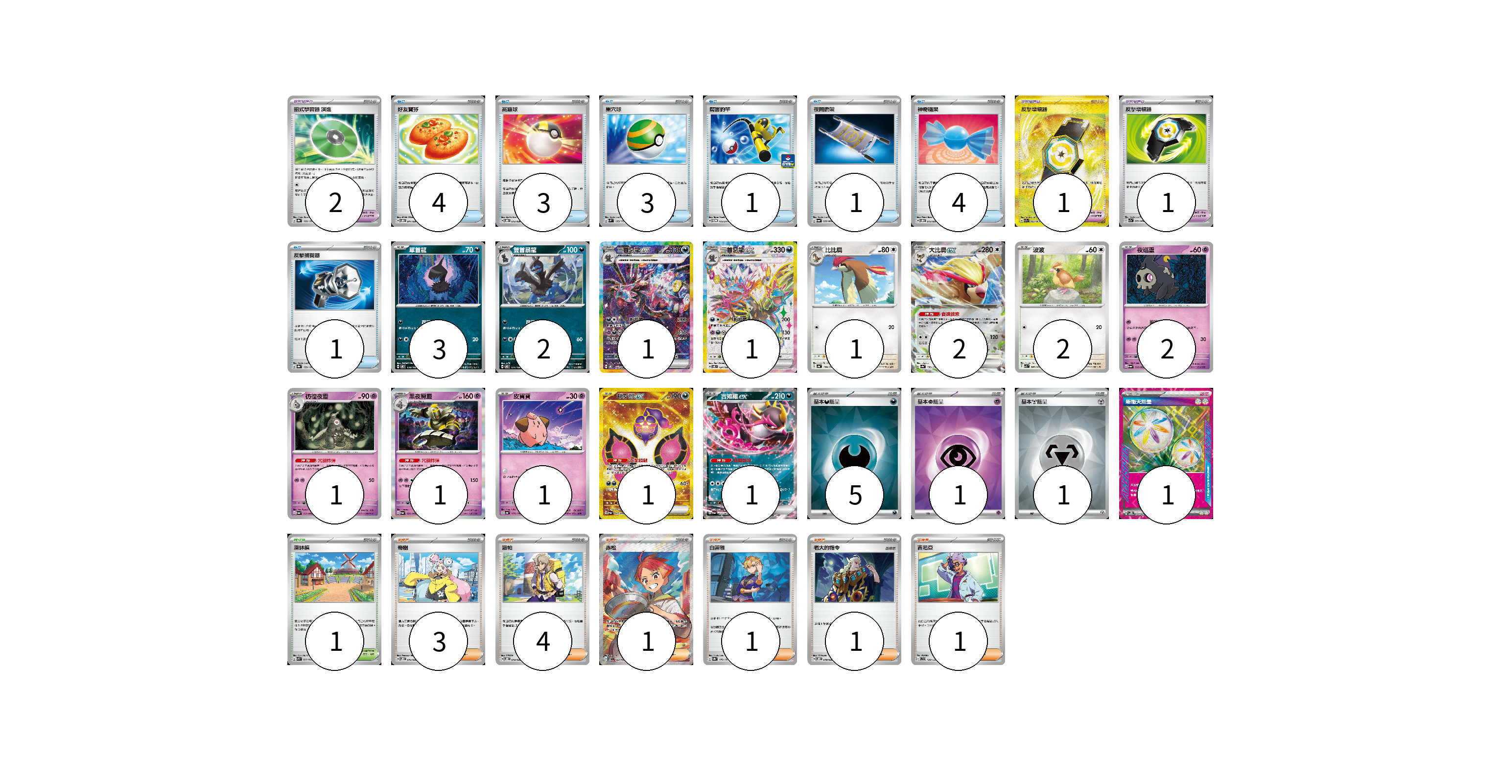 牌組構築方案 以此牌組為基礎新構築牌組 顯示卡面 顯示列表 寶可夢卡(19) 3 2 1 1 1 2 2 2 1 1 1 1 1 寶可夢道具(4) 2 1 1 物品卡(17) 4 3 3 1 1 4 1 支援者卡(11) 3 4 1 1 1 1 競技場卡(1) 1 能量卡(8) 5 1 1 1 寶可夢卡(19) 卡牌名稱 張數 卡牌名稱 張數 單首龍 SV8 070/106 03 雙首暴龍 SV8 071/106 02 三首惡龍ex SV8 133/106 01 三首惡龍ex SV8 124/106 01 比比鳥 SV4a 138/190 01 大比鳥ex SV4a 139/190 02 波波 SV3 087/108 02 夜巡靈 SV6a 018/064 02 彷徨夜靈 SV6a 019/064 01 黑夜魔靈 SV6a 020/064 01 皮寶寶 SV4a 077/190 01 桃歹郎ex SV6a 092/064 01 吉雉雞ex SV6a 038/064 01 寶可夢道具(4) 卡牌名稱 張數 卡牌名稱 張數 招式學習器 演進 SV8a 160/187 02 反擊增幅器 SV7a 093/064 01 反擊增幅器 SV7a 059/064 01 物品卡(17) 卡牌名稱 張數 卡牌名稱 張數 好友寶芬 SVOD 011/020 04 高級球 SVOD 012/020 03 巢穴球 SVM 133/175 03 厲害釣竿 SV-P 112/SV-P 01 夜間擔架 SV6a 056/064 01 神奇糖果 SVOD 013/020 04 反擊捕捉器 SV8a 139/187 01 支援者卡(11) 卡牌名稱 張數 卡牌名稱 張數 奇樹 SVOD 016/020 03 派帕 SVOD 018/020 04 赤松 SV7 123/102 01 白蕾雅 SV8a 176/187 01 老大的指令 SVOD 019/020 01 吉尼亞 SVD 129/139 01 競技場卡(1) 卡牌名稱 張數 卡牌名稱 張數 深缽鎮 SVK 039/042 01 能量卡(8) 卡牌名稱 張數 卡牌名稱 張數 基本【惡】能量 SVOM DAR 05 基本【超】能量 SVOD PSY 01 基本【鋼】能量 SVOD MET 01 新衝天能量 SV5K 071/071 01 以此牌組為基礎新構築牌組 牌組編碼 HgppEY-nKrRHY-loOAYx copy 列印牌組單 牌組編碼已複製 分享至SNS