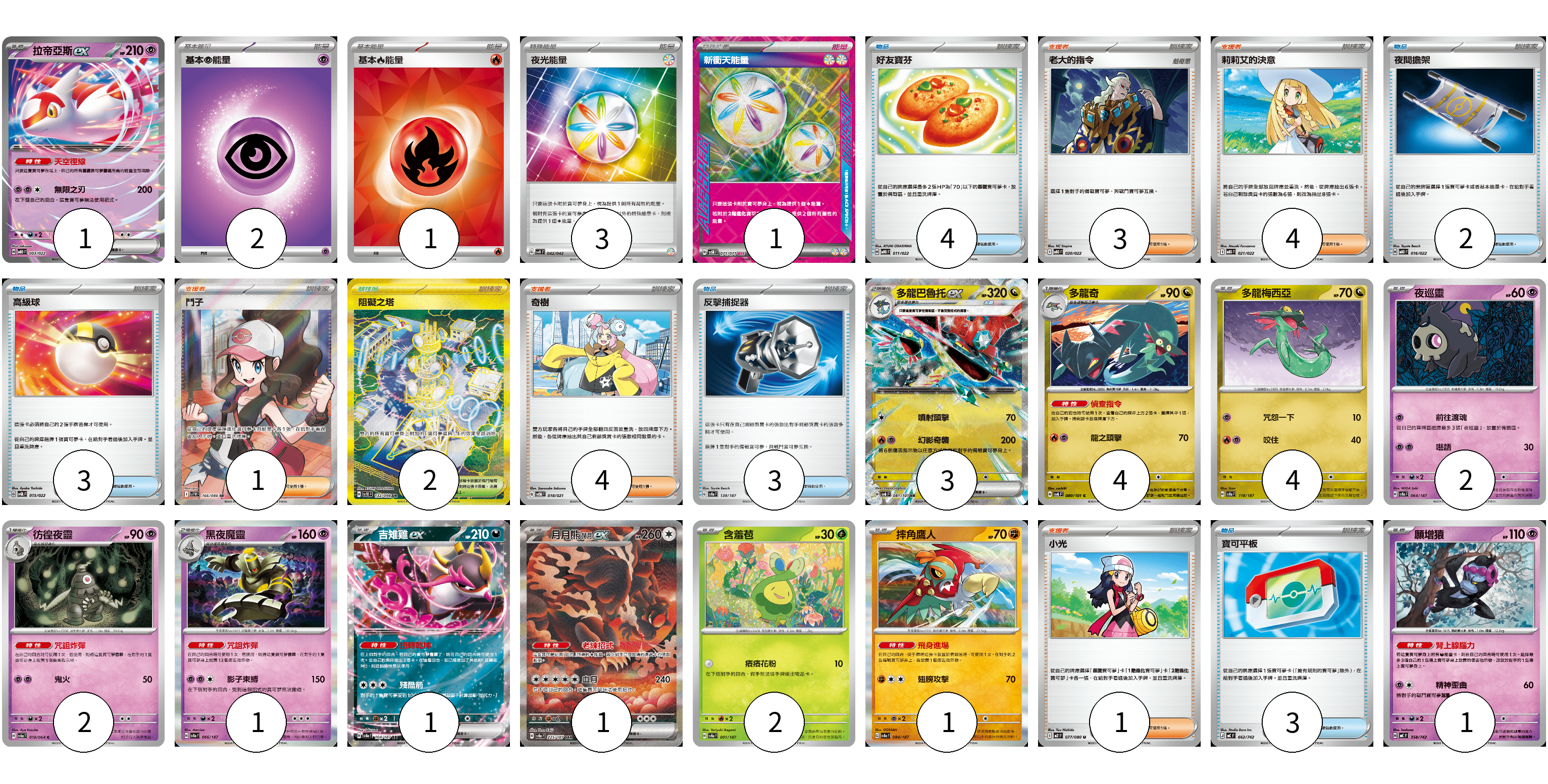 牌組構築方案 以此牌組為基礎新構築牌組 顯示卡面 顯示列表 寶可夢卡(23) 1 3 4 4 2 2 1 1 1 2 1 1 物品卡(15) 4 2 3 3 3 支援者卡(13) 3 4 1 4 1 競技場卡(2) 2 能量卡(7) 2 1 3 1 寶可夢卡(23) 卡牌名稱 張數 卡牌名稱 張數 拉帝亞斯ex MBD 003/022 01 多龍巴魯托ex SV6 081/101 03 多龍奇 SV6 080/101 04 多龍梅西亞 SV8a 118/187 04 夜巡靈 SV8a 064/187 02 彷徨夜靈 SV6a 019/064 02 黑夜魔靈 SV8a 066/187 01 吉雉雞ex SV8a 104/187 01 月月熊 赫月ex SV8a 225/187 01 含羞苞 SV8a 001/187 02 摔角鷹人 SV8a 084/187 01 願增猿 MC 358/742 01 物品卡(15) 卡牌名稱 張數 卡牌名稱 張數 好友寶芬 MBG 011/022 04 夜間擔架 MBD 016/022 02 高級球 SVQL 015/022 03 反擊捕捉器 SV8a 139/187 03 寶可平板 MC 662/742 03 支援者卡(13) 卡牌名稱 張數 卡牌名稱 張數 老大的指令 MBD 020/022 03 莉莉艾的決意 MBD 021/022 04 鬥子 SV11W 166/086 01 奇樹 SVOM 018/021 04 小光 M2 077/080 01 競技場卡(2) 卡牌名稱 張數 卡牌名稱 張數 阻礙之塔 SV10 132/098 02 能量卡(7) 卡牌名稱 張數 卡牌名稱 張數 基本【超】能量 MBD PSY 02 基本【火】能量 SVQL FIR 01 夜光能量 SVK 042/042 03 新衝天能量 SV5K 071/071 01 以此牌組為基礎新構築牌組 牌組編碼 Hgsvmj-odJIze-ABTekR copy 列印牌組單 牌組編碼已複製 分享至SNS