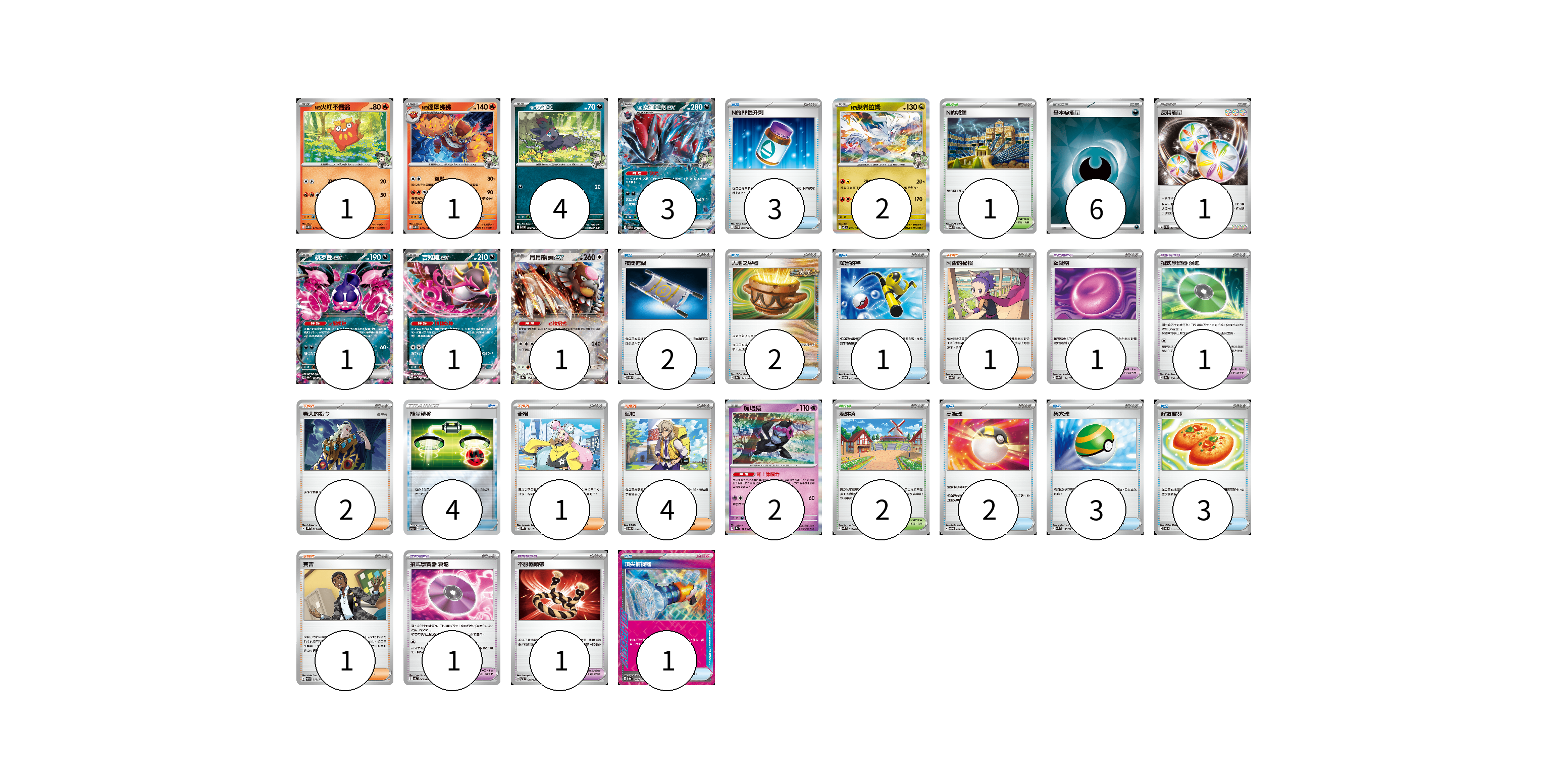牌組構築方案 以此牌組為基礎新構築牌組 顯示卡面 顯示列表 寶可夢卡(16) 1 1 4 3 2 1 1 1 2 寶可夢道具(4) 1 1 1 1 物品卡(21) 3 2 2 1 4 2 3 3 1 支援者卡(9) 1 2 1 4 1 競技場卡(3) 1 2 能量卡(7) 6 1 寶可夢卡(16) 卡牌名稱 張數 卡牌名稱 張數 N的火紅不倒翁 SV9 015/100 01 N的達摩狒狒 SV9 016/100 01 N的索羅亞 SV9 060/100 04 N的索羅亞克ex SV9 061/100 03 N的萊希拉姆 SV9 074/100 02 桃歹郎ex SV8a 105/187 01 吉雉雞ex SV8a 104/187 01 月月熊 赫月ex SV8a 134/187 01 願增猿 SV8a 075/187 02 寶可夢道具(4) 卡牌名稱 張數 卡牌名稱 張數 鎖鏈糬 SV8a 154/187 01 招式學習器 演進 SV8a 160/187 01 招式學習器 衰退 SV4K 063/066 01 不服輸頭帶 SVTL 016/021 01 物品卡(21) 卡牌名稱 張數 卡牌名稱 張數 N的PP提升劑 SV9 089/100 03 夜間擔架 SVOM 016/021 02 大地之容器 SV8a 143/187 02 厲害釣竿 SVOD 010/020 01 能量轉移 SO 017/030 04 高級球 SVOD 012/020 02 巢穴球 SVM 133/175 03 好友寶芬 SVOD 011/020 03 頂尖捕捉器 SV8a 148/187 01 支援者卡(9) 卡牌名稱 張數 卡牌名稱 張數 阿杏的秘招 SV8a 166/187 01 老大的指令 SVHK 022/022 02 奇樹 SVHK 019/022 01 派帕 SVOD 018/020 04 賽吉 SV5M 068/071 01 競技場卡(3) 卡牌名稱 張數 卡牌名稱 張數 N的城堡 SV9 097/100 01 深缽鎮 SVK 039/042 02 能量卡(7) 卡牌名稱 張數 卡牌名稱 張數 基本【惡】能量 SVK DAR 06 反轉能量 SVK 041/042 01 以此牌組為基礎新構築牌組 牌組編碼 HjZpnh-xOdIBb-gmqGlo copy 列印牌組單 牌組編碼已複製 分享至SNS