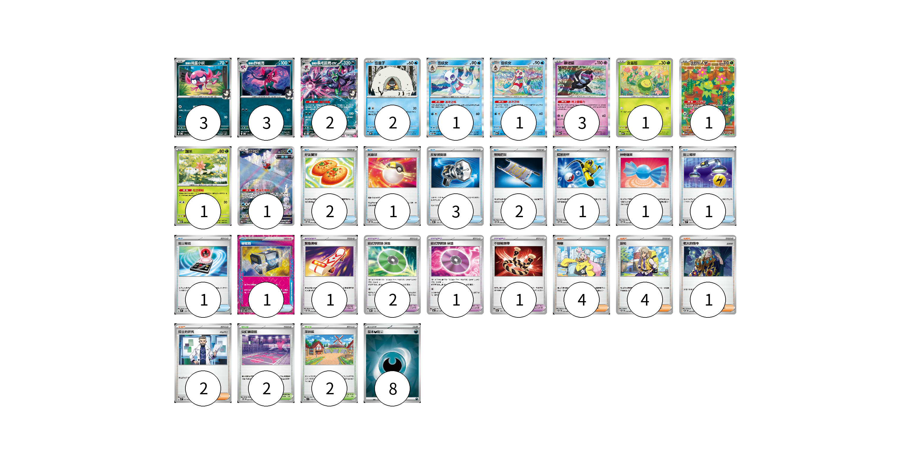 牌組構築方案 以此牌組為基礎新構築牌組 顯示卡面 顯示列表 寶可夢卡(19) 3 3 2 2 1 1 3 1 1 1 1 寶可夢道具(5) 1 2 1 1 物品卡(13) 2 1 3 2 1 1 1 1 1 支援者卡(11) 4 4 1 2 競技場卡(4) 2 2 能量卡(8) 8 寶可夢卡(19) 卡牌名稱 張數 卡牌名稱 張數 <瑪俐的>搗蛋小妖 SVOM 005/021 03 <瑪俐的>詐唬魔 SVOM 006/021 03 <瑪俐的>長毛巨魔ex SVOM 007/021 02 雪童子 SV8a 037/187 02 雪妖女 SV6 033/101 01 雪妖女 SV8a 038/187 01 願增猿 SV8a 075/187 03 含羞苞 SV8a 001/187 01 沙鈴仙人掌 SV9 101/100 01 謝米 SV9a 006/063 01 鐵包袱 SV4M 071/066 01 寶可夢道具(5) 卡牌名稱 張數 卡牌名稱 張數 緊急滑板 SVOD 015/020 01 招式學習器 演進 SV8a 160/187 02 招式學習器 衰退 SV4K 063/066 01 不服輸頭帶 SV4a 168/190 01 物品卡(13) 卡牌名稱 張數 卡牌名稱 張數 好友寶芬 SVOD 011/020 02 高級球 SVOD 012/020 01 反擊捕捉器 SV8a 139/187 03 夜間擔架 SVOM 016/021 02 厲害釣竿 SVOD 010/020 01 神奇糖果 SVOD 013/020 01 能量轉移 SVM 127/175 01 能量輸送 SVM 128/175 01 秘密箱 SV6 092/101 01 支援者卡(11) 卡牌名稱 張數 卡牌名稱 張數 奇樹 SVOD 016/020 04 派帕 SVOD 018/020 04 老大的指令 SVOD 019/020 01 博士的研究 SVK 033/042 02 競技場卡(4) 卡牌名稱 張數 卡牌名稱 張數 尖釘鎮道館 SVOM 021/021 02 深缽鎮 SV1a 070/073 02 能量卡(8) 卡牌名稱 張數 卡牌名稱 張數 基本【惡】能量 SVOM DAR 08 以此牌組為基礎新構築牌組 牌組編碼 HkOBau-GRIVJE-HfSqtc copy 列印牌組單 牌組編碼已複製 分享至SNS