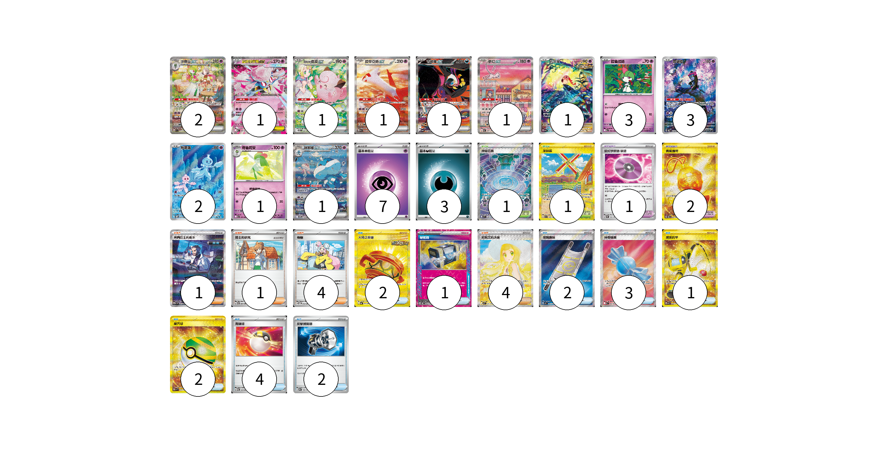 牌組構築方案 以此牌組為基礎新構築牌組 顯示卡面 顯示列表 寶可夢卡(18) 2 1 1 1 1 1 1 3 3 2 1 1 寶可夢道具(3) 1 2 物品卡(17) 2 1 2 3 1 2 4 2 支援者卡(10) 1 1 4 4 競技場卡(2) 1 1 能量卡(10) 7 3 寶可夢卡(18) 卡牌名稱 張數 卡牌名稱 張數 沙奈朵ex SV1S 101/078 02 超級蒂安希ex MBD 006/022 01 莉莉艾的皮皮ex SV9 126/100 01 拉帝亞斯ex SV7a 087/064 01 吉雉雞ex SV6a 089/064 01 夢幻ex SV2a 205/165 01 吼叫尾 SV4K 071/066 01 拉魯拉絲 M2a 069/193 03 願增猿 SV6 107/101 03 輕飄飄 SV11W 124/086 02 奇魯莉安 M1S 041/063 01 胖嘟嘟ex SV11W 170/086 01 寶可夢道具(3) 卡牌名稱 張數 卡牌名稱 張數 招式學習器 衰退 SV8a 161/187 01 勇氣護符 SV7 134/102 02 物品卡(17) 卡牌名稱 張數 卡牌名稱 張數 大地之容器 SV6a 093/064 02 秘密箱 SV6 092/101 01 夜間擔架 M1L 083/063 02 神奇糖果 M1S 082/063 03 厲害釣竿 SV2P 098/071 01 巢穴球 SV1S 107/078 02 高級球 SVQL 015/022 04 反擊捕捉器 SV8a 139/187 02 支援者卡(10) 卡牌名稱 張數 卡牌名稱 張數 弗圖博士的劇本 SV4M 091/066 01 博士的研究 SV11B 084/086 01 奇樹 SVOD 016/020 04 莉莉艾的決意 M1L 091/063 04 競技場卡(2) 卡牌名稱 張數 卡牌名稱 張數 神秘花園 M1S 086/063 01 深缽鎮 SV3 140/108 01 能量卡(10) 卡牌名稱 張數 卡牌名稱 張數 基本【超】能量 MBD PSY 07 基本【惡】能量 MBG DAR 03 以此牌組為基礎新構築牌組 牌組編碼 HlPkOo-qqFMEp-sFVeyD copy 列印牌組單 牌組編碼已複製 分享至SNS