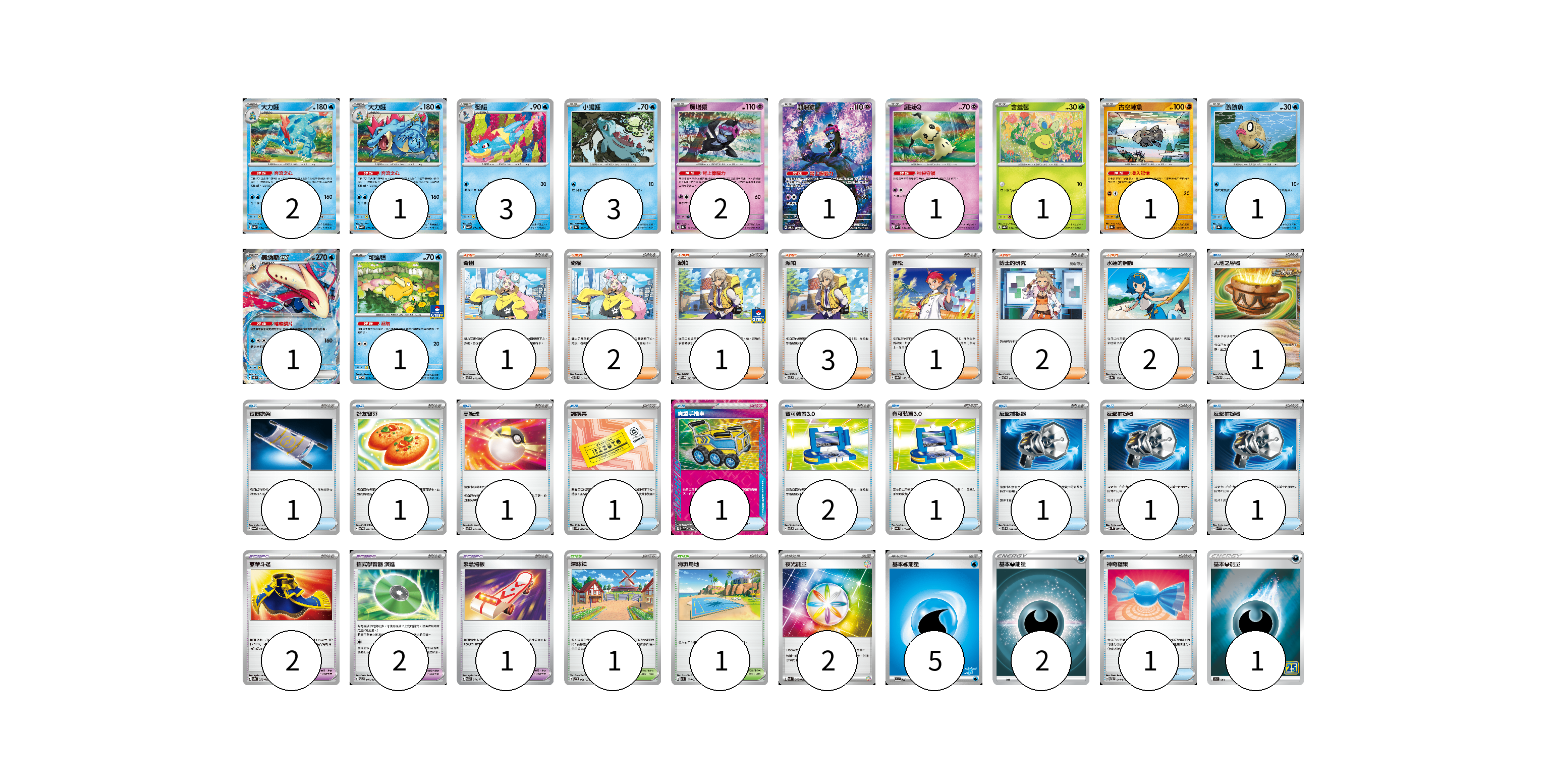牌組構築方案 以此牌組為基礎新構築牌組 顯示卡面 顯示列表 寶可夢卡(18) 2 1 3 3 2 1 1 1 1 1 1 1 寶可夢道具(5) 2 2 1 物品卡(13) 1 1 1 1 1 1 2 1 1 1 1 1 支援者卡(12) 1 2 1 3 1 2 2 競技場卡(2) 1 1 能量卡(10) 2 5 2 1 寶可夢卡(18) 卡牌名稱 張數 卡牌名稱 張數 大力鱷 SV8a 034/187 02 大力鱷 SV5K 015/071 01 藍鱷 SV5K 014/071 03 小鋸鱷 SV8a 032/187 03 願增猿 SV8a 075/187 02 願增猿 SV6 107/101 01 謎擬Q SV2P 034/071 01 含羞苞 SV8a 001/187 01 古空棘魚 SV8a 079/187 01 醜醜魚 SV8a 035/187 01 美納斯ex SV8 026/106 01 可達鴨 SV-P 220/SV-P 01 寶可夢道具(5) 卡牌名稱 張數 卡牌名稱 張數 豪華斗篷 SV3a 055/062 02 招式學習器 演進 SVTL 017/021 02 緊急滑板 SV5K 064/071 01 物品卡(13) 卡牌名稱 張數 卡牌名稱 張數 大地之容器 SVTG 010/019 01 夜間擔架 SV6a 056/064 01 好友寶芬 SVTG 011/019 01 高級球 SVTS 014/022 01 調換票 SV9 090/100 01 貴重手推車 SVK 020/042 01 寶可裝置3.0 SVTL 014/021 02 寶可裝置3.0 SVAL 015/021 01 反擊捕捉器 SVTS 009/022 01 反擊捕捉器 SV4M 059/066 01 反擊捕捉器 SVK 009/042 01 神奇糖果 SVTG 014/019 01 支援者卡(12) 卡牌名稱 張數 卡牌名稱 張數 奇樹 SVTS 018/022 01 奇樹 SVTG 017/019 02 派帕 SV-P 213/SV-P 01 派帕 SVTL 020/021 03 赤松 SV8a 163/187 01 博士的研究 SVTG 018/019 02 水蓮的照顧 SV8a 168/187 02 競技場卡(2) 卡牌名稱 張數 卡牌名稱 張數 深缽鎮 SVF 036/038 01 海灘場地 SV1S 078/078 01 能量卡(10) 卡牌名稱 張數 卡牌名稱 張數 夜光能量 SVK 042/042 02 基本【水】能量 SVI WAT 05 基本惡能量 SLD DAR 02 基本惡能量 S8a DAR 01 以此牌組為基礎新構築牌組 牌組編碼 HlgigT-Qfzsrj-vhFyOZ copy 列印牌組單 牌組編碼已複製 分享至SNS