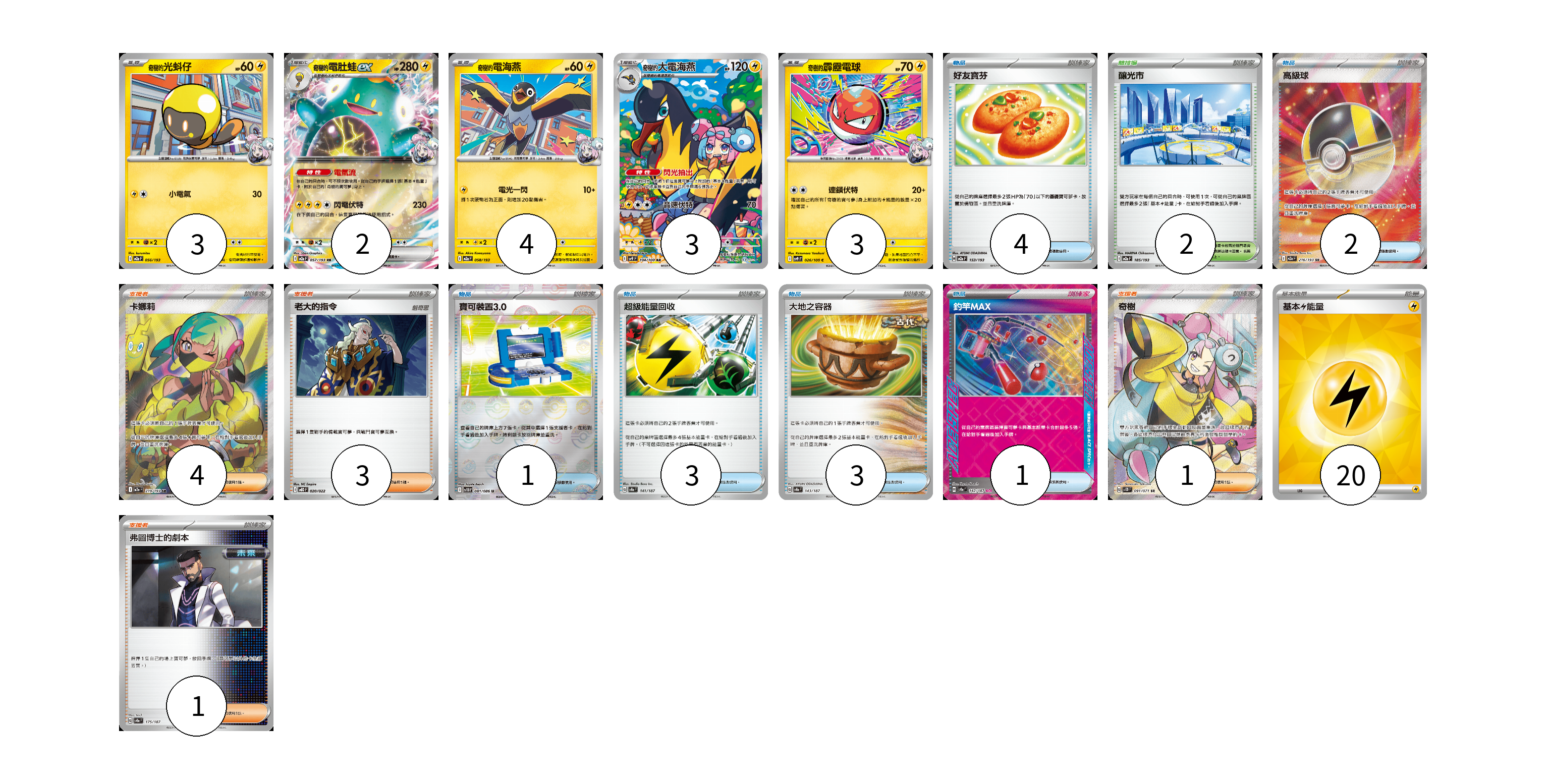 牌組構築方案 以此牌組為基礎新構築牌組 顯示卡面 顯示列表 寶可夢卡(15) 3 2 4 3 3 物品卡(14) 4 2 1 3 3 1 支援者卡(9) 4 3 1 1 競技場卡(2) 2 能量卡(20) 20 寶可夢卡(15) 卡牌名稱 張數 卡牌名稱 張數 奇樹的光蚪仔 M2a 056/193 03 奇樹的電肚蛙ex M2a 057/193 02 奇樹的電海燕 M2a 058/193 04 奇樹的大電海燕 SV9 104/100 03 奇樹的霹靂電球 SV9 026/100 03 物品卡(14) 卡牌名稱 張數 卡牌名稱 張數 好友寶芬 M2a 153/193 04 高級球 M2a 216/193 02 寶可裝置3.0 SV11B 081/086 01 超級能量回收 SV8a 141/187 03 大地之容器 SV8a 143/187 03 釣竿MAX SV8a 142/187 01 支援者卡(9) 卡牌名稱 張數 卡牌名稱 張數 卡娜莉 M2a 219/193 04 老大的指令 MBD 020/022 03 奇樹 SV2D 091/071 01 弗圖博士的劇本 SV8a 175/187 01 競技場卡(2) 卡牌名稱 張數 卡牌名稱 張數 釀光市 M2a 185/193 02 能量卡(20) 卡牌名稱 張數 卡牌名稱 張數 基本【雷】能量 SVQP LIG 20 以此牌組為基礎新構築牌組 牌組編碼 HlmQnR-abDZSZ-cMAeCj copy 列印牌組單 牌組編碼已複製 分享至SNS