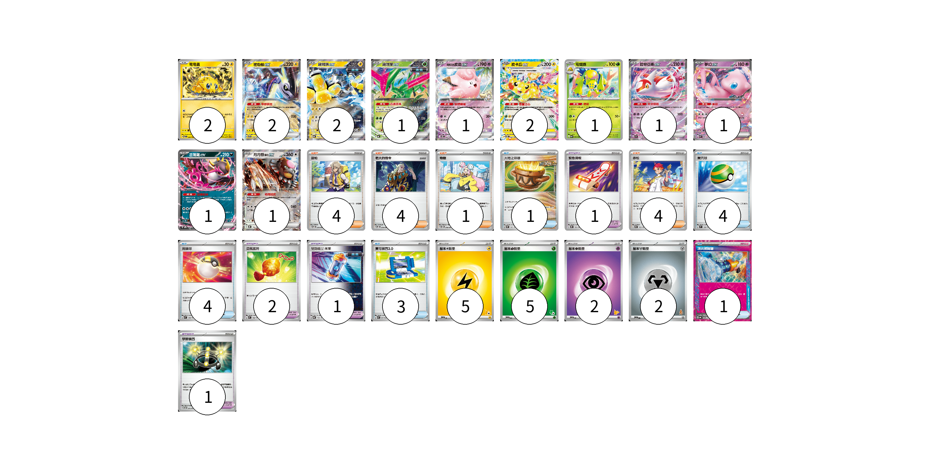 牌組構築方案 以此牌組為基礎新構築牌組 顯示卡面 顯示列表 寶可夢卡(15) 2 2 2 1 1 2 1 1 1 1 1 寶可夢道具(5) 1 2 1 1 物品卡(13) 1 4 4 3 1 支援者卡(13) 4 4 1 4 能量卡(14) 5 5 2 2 寶可夢卡(15) 卡牌名稱 張數 卡牌名稱 張數 電電蟲 SV7 032/102 02 密勒頓ex SVTR 008/021 02 鐵臂膀ex SV8a 054/187 02 鐵斑葉ex SV8a 016/187 01 莉莉艾的皮皮ex SV9 033/100 01 皮卡丘ex SV8 033/106 02 電蜘蛛 SV6a 002/064 01 拉帝亞斯ex SV7a 019/064 01 夢幻ex SVK 001/042 01 吉雉雞ex SVOD 004/020 01 月月熊 赫月ex SV8a 134/187 01 寶可夢道具(5) 卡牌名稱 張數 卡牌名稱 張數 緊急滑板 SV8a 153/187 01 勇氣護符 SVM 142/175 02 驅勁能量 未來 SV8a 158/187 01 學習裝置 SVTM 016/022 01 物品卡(13) 卡牌名稱 張數 卡牌名稱 張數 大地之容器 SV8a 143/187 01 巢穴球 SVM 133/175 04 高級球 SVM 134/175 04 寶可裝置3.0 SVK 021/042 03 頂尖捕捉器 SV8a 148/187 01 支援者卡(13) 卡牌名稱 張數 卡牌名稱 張數 派帕 SVOD 018/020 04 老大的指令 SVOD 019/020 04 奇樹 SVOM 018/021 01 赤松 SV8a 163/187 04 能量卡(14) 卡牌名稱 張數 卡牌名稱 張數 基本【雷】能量 SVI LIG 05 基本【草】能量 SVI GRA 05 基本【超】能量 SVI PSY 02 基本【鋼】能量 SVI MET 02 以此牌組為基礎新構築牌組 牌組編碼 HltaWi-tWmbXi-KjksvS copy 列印牌組單 牌組編碼已複製 分享至SNS