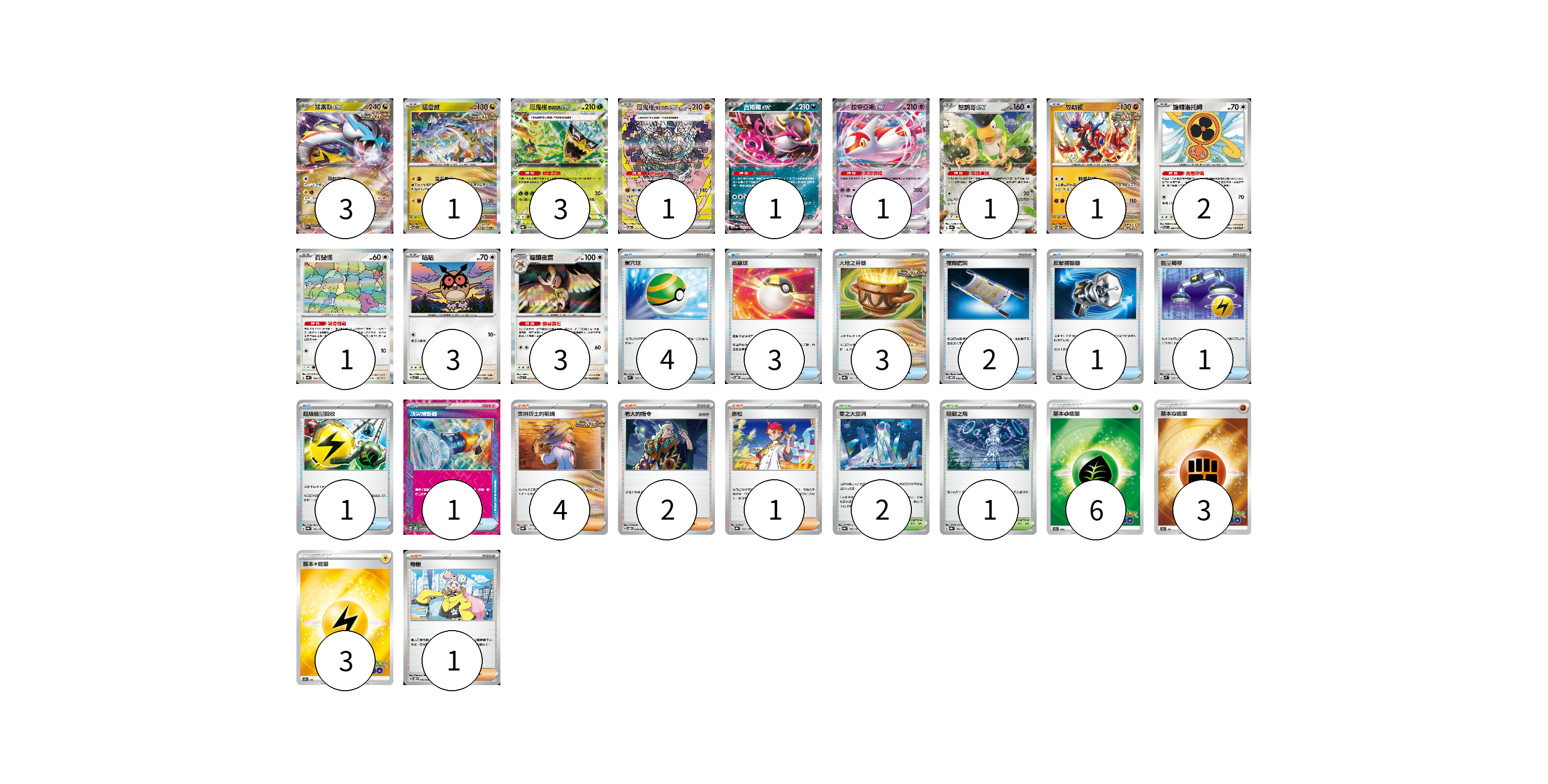 牌組構築方案 以此牌組為基礎新構築牌組 顯示卡面 顯示列表 寶可夢卡(21) 3 1 3 1 1 1 1 1 2 1 3 3 物品卡(16) 4 3 3 2 1 1 1 1 支援者卡(8) 4 2 1 1 競技場卡(3) 2 1 能量卡(12) 6 3 3 寶可夢卡(21) 卡牌名稱 張數 卡牌名稱 張數 猛雷鼓ex SV5K 053/071 03 猛雷鼓 SV7 075/102 01 厄鬼椪 碧草面具ex SV8a 020/187 03 厄鬼椪 礎石面具ex SV8a 216/187 01 吉雉雞ex SV6a 038/064 01 拉帝亞斯ex SV7a 019/064 01 怒鸚哥ex SV4a 154/190 01 故勒頓 SV8 069/106 01 旋轉洛托姆 SV7 080/102 02 百變怪 SV4a 144/190 01 咕咕 SV7 076/102 03 貓頭夜鷹 SV7 077/102 03 物品卡(16) 卡牌名稱 張數 卡牌名稱 張數 巢穴球 SVM 133/175 04 高級球 SVOD 012/020 03 大地之容器 SV8a 143/187 03 夜間擔架 SVOM 016/021 02 反擊捕捉器 SV8a 139/187 01 能量轉移 SVM 127/175 01 超級能量回收 SV8a 141/187 01 頂尖捕捉器 SV5M 062/071 01 支援者卡(8) 卡牌名稱 張數 卡牌名稱 張數 奧琳博士的氣魄 SV8a 167/187 04 老大的指令 SVOD 019/020 02 赤松 SV8a 163/187 01 奇樹 SVOD 016/020 01 競技場卡(3) 卡牌名稱 張數 卡牌名稱 張數 零之大空洞 SV8a 182/187 02 阻礙之塔 SV8a 181/187 01 能量卡(12) 卡牌名稱 張數 卡牌名稱 張數 基本草能量 S10b GRA 06 基本鬥能量 S10b FIG 03 基本雷能量 S10b LIG 03 以此牌組為基礎新構築牌組 牌組編碼 HmJjQG-ZIhBrs-nxaimc copy 列印牌組單 牌組編碼已複製 分享至SNS