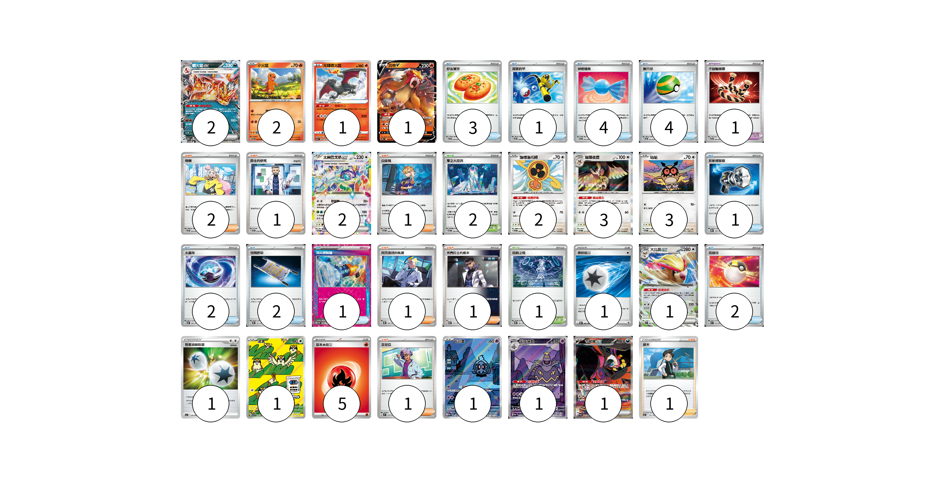 牌組構築方案 以此牌組為基礎新構築牌組 顯示卡面 顯示列表 寶可夢卡(21) 2 2 1 1 2 2 3 3 1 1 1 1 1 寶可夢道具(3) 1 2 物品卡(20) 3 1 4 4 1 2 2 1 2 支援者卡(6) 1 1 1 1 1 1 競技場卡(3) 2 1 能量卡(7) 1 1 5 寶可夢卡(21) 卡牌名稱 張數 卡牌名稱 張數 噴火龍ex SVTL 006/021 02 小火龍 SVTL 001/021 02 光輝噴火龍 SVTL 003/021 01 炎帝V SVTL 005/021 01 太樂巴戈斯ex SV7 088/102 02 旋轉洛托姆 SV7 080/102 02 貓頭夜鷹 SV7 077/102 03 咕咕 SV7 076/102 03 大比鳥ex SVK 005/042 01 波波 SV3 118/108 01 夜巡靈 SV6a 068/064 01 黑夜魔靈 SV6a 070/064 01 吉雉雞ex SV6a 089/064 01 寶可夢道具(3) 卡牌名稱 張數 卡牌名稱 張數 不服輸頭帶 SVTL 016/021 01 奇樹 SVTL 018/021 02 物品卡(20) 卡牌名稱 張數 卡牌名稱 張數 好友寶芬 SVTL 010/021 03 厲害釣竿 SVTL 009/021 01 神奇糖果 SVTL 013/021 04 巢穴球 SVTL 011/021 04 反擊捕捉器 SV8a 139/187 01 太晶珠 SV8a 145/187 02 夜間擔架 SV8a 151/187 02 頂尖捕捉器 SV8a 148/187 01 高級球 SVK 018/042 02 支援者卡(6) 卡牌名稱 張數 卡牌名稱 張數 博士的研究 SVTL 019/021 01 白蕾雅 SV7 100/102 01 阿克羅瑪的執著 SV8a 164/187 01 弗圖博士的劇本 SV8a 175/187 01 吉尼亞 SV1S 074/078 01 捩木 S11 097/100 01 競技場卡(3) 卡牌名稱 張數 卡牌名稱 張數 零之大空洞 SV7 102/102 02 阻礙之塔 SV8a 181/187 01 能量卡(7) 卡牌名稱 張數 卡牌名稱 張數 噴射能量 SV8a 185/187 01 雙重渦輪能量 S11a 067/068 01 基本火能量 sv-p FIR 05 以此牌組為基礎新構築牌組 牌組編碼 HmxXgi-twposl-ljatSp copy 列印牌組單 牌組編碼已複製 分享至SNS