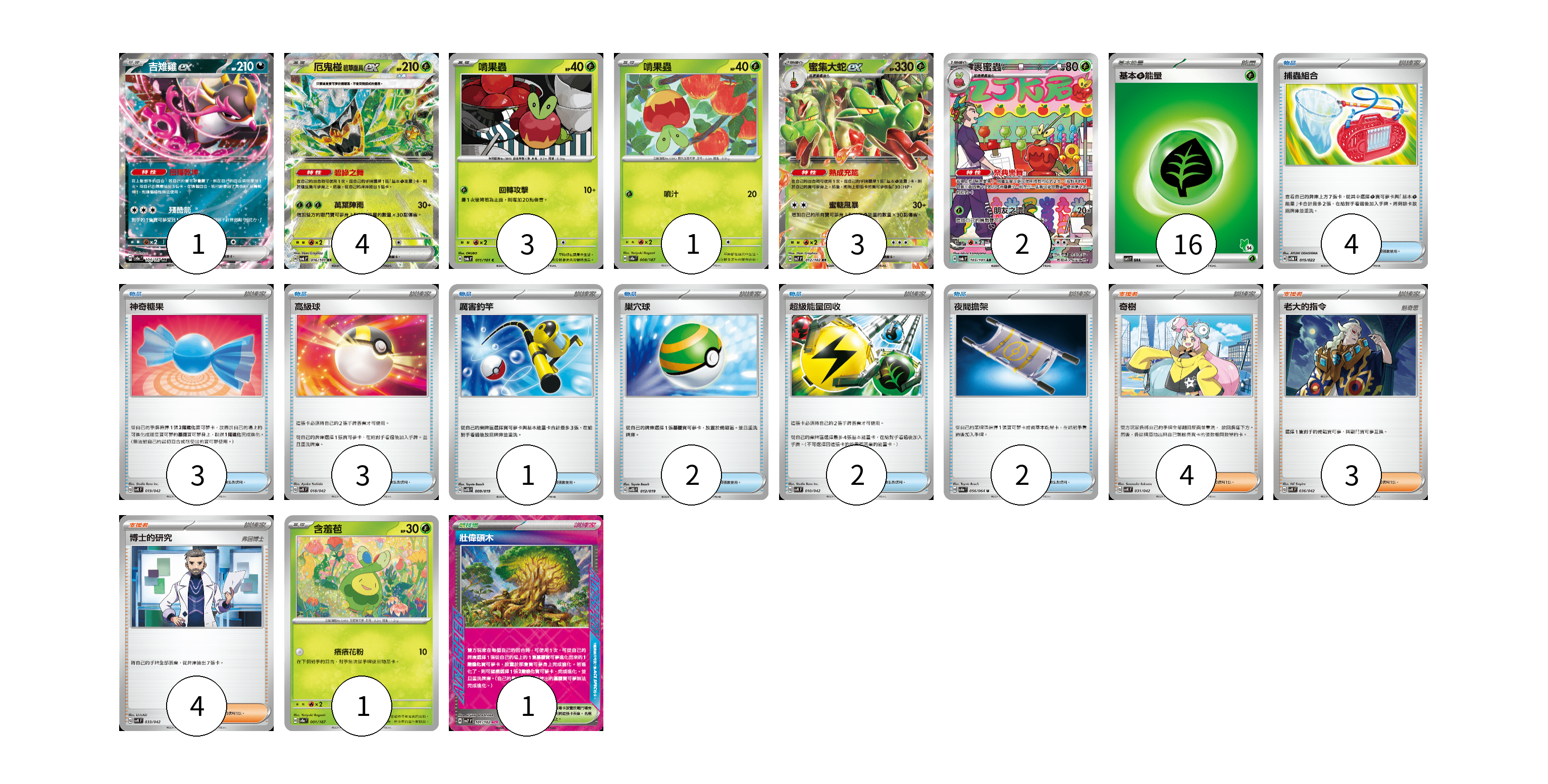 牌組構築方案 以此牌組為基礎新構築牌組 顯示卡面 顯示列表 寶可夢卡(15) 1 4 3 1 3 2 1 物品卡(17) 4 3 3 1 2 2 2 支援者卡(11) 4 3 4 競技場卡(1) 1 能量卡(16) 16 寶可夢卡(15) 卡牌名稱 張數 卡牌名稱 張數 吉雉雞ex SV8a 104/187 01 厄鬼椪 碧草面具ex SV6 016/101 04 啃果蟲 SV6 011/101 03 啃果蟲 SV8a 008/187 01 蜜集大蛇ex SV7 012/102 03 裹蜜蟲 SV6 103/101 02 含羞苞 SV8a 001/187 01 物品卡(17) 卡牌名稱 張數 卡牌名稱 張數 捕蟲組合 SVTM 015/022 04 神奇糖果 SVK 019/042 03 高級球 SVK 018/042 03 厲害釣竿 SVTG 009/019 01 巢穴球 SVTG 012/019 02 超級能量回收 SVK 010/042 02 夜間擔架 SV6a 056/064 02 支援者卡(11) 卡牌名稱 張數 卡牌名稱 張數 奇樹 SVK 031/042 04 老大的指令 SVK 036/042 03 博士的研究 SVK 033/042 04 競技場卡(1) 卡牌名稱 張數 卡牌名稱 張數 壯偉碩木 SV7 101/102 01 能量卡(16) 卡牌名稱 張數 卡牌名稱 張數 基本【草】能量 SVI GRA 16 以此牌組為基礎新構築牌組 牌組編碼 HnAFKB-OgUxnJ-JanxlS copy 列印牌組單 牌組編碼已複製 分享至SNS