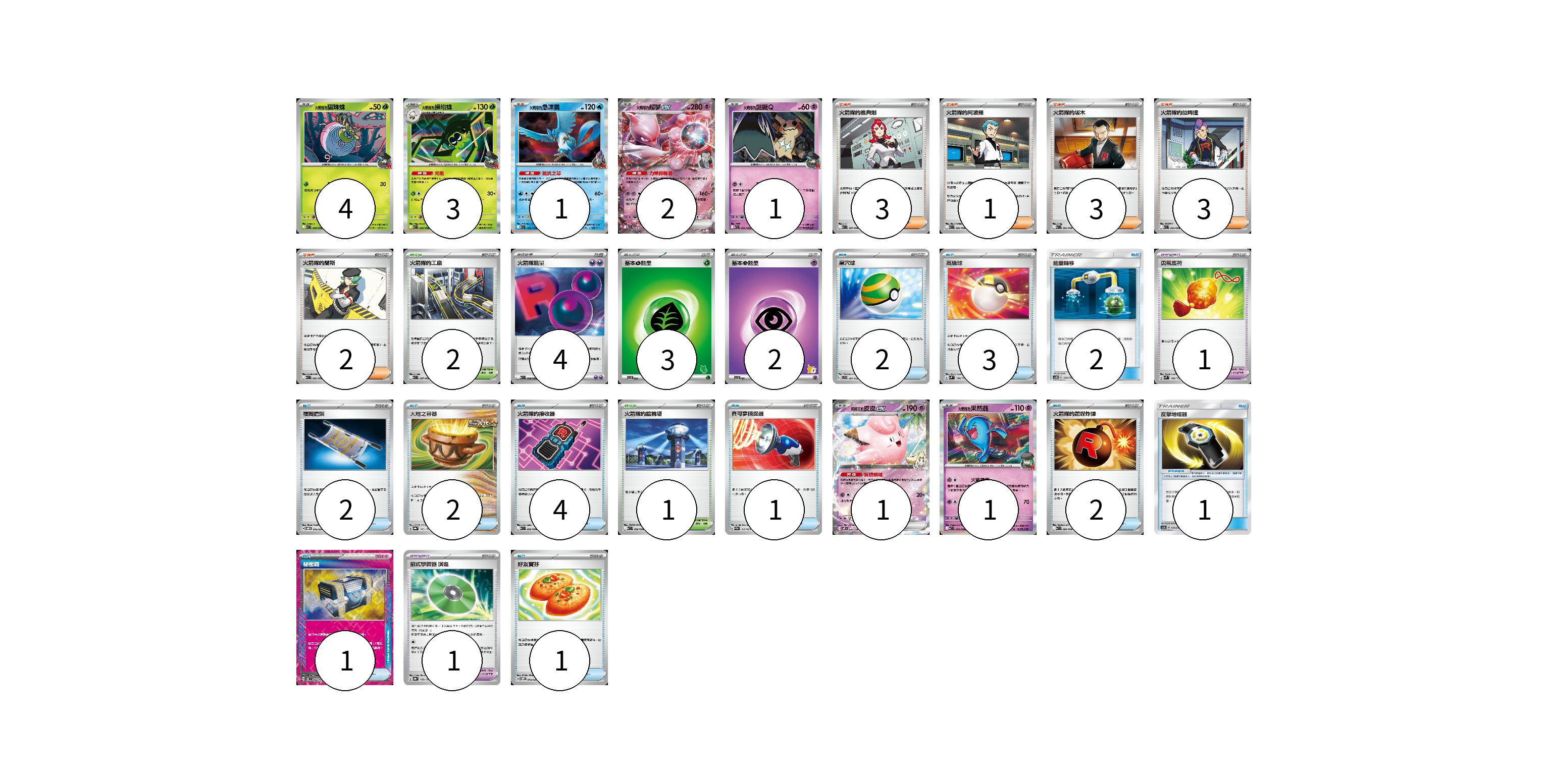 牌組構築方案 以此牌組為基礎新構築牌組 顯示卡面 顯示列表 寶可夢卡(13) 4 3 1 2 1 1 1 寶可夢道具(3) 1 1 1 物品卡(20) 2 3 2 2 2 4 1 2 1 1 支援者卡(12) 3 1 3 3 2 競技場卡(3) 2 1 能量卡(9) 4 3 2 寶可夢卡(13) 卡牌名稱 張數 卡牌名稱 張數 <火箭隊的>團珠蛛 SV10 008/098 04 <火箭隊的>操陷蛛 SV10 009/098 03 <火箭隊的>急凍鳥 SV10 022/098 01 <火箭隊的>超夢ex SV10 039/098 02 <火箭隊的>謎擬Q SV10 042/098 01 莉莉艾的皮皮ex SV9 033/100 01 <火箭隊的>果然翁 SV10 040/098 01 寶可夢道具(3) 卡牌名稱 張數 卡牌名稱 張數 勇氣護符 SVM 142/175 01 反擊增幅器 AC2a 170/200 01 招式學習器 演進 SV8a 160/187 01 物品卡(20) 卡牌名稱 張數 卡牌名稱 張數 巢穴球 SVB 001/028 02 高級球 SVM 134/175 03 能量轉移 AC2D 139/176 02 夜間擔架 SVOM 016/021 02 大地之容器 SV8a 143/187 02 火箭隊的接收器 SV10 090/098 04 寶可夢捕捉器 SVAM 019/023 01 火箭隊的驚嚇炸彈 SV10 089/098 02 秘密箱 SV6 092/101 01 好友寶芬 SVOM 012/021 01 支援者卡(12) 卡牌名稱 張數 卡牌名稱 張數 火箭隊的雅典娜 SV10 091/098 03 火箭隊的阿波羅 SV10 092/098 01 火箭隊的坂木 SV10 093/098 03 火箭隊的拉姆達 SV10 094/098 03 火箭隊的蘭斯 SV10 095/098 02 競技場卡(3) 卡牌名稱 張數 卡牌名稱 張數 火箭隊的工廠 SV10 097/098 02 火箭隊的監視塔 SV10 096/098 01 能量卡(9) 卡牌名稱 張數 卡牌名稱 張數 火箭隊能量 SV10 098/098 04 基本【草】能量 SVI GRA 03 基本【超】能量 SVI PSY 02 以此牌組為基礎新構築牌組 牌組編碼 HnaPRy-NKJiGj-zBniXT copy 列印牌組單 牌組編碼已複製 分享至SNS