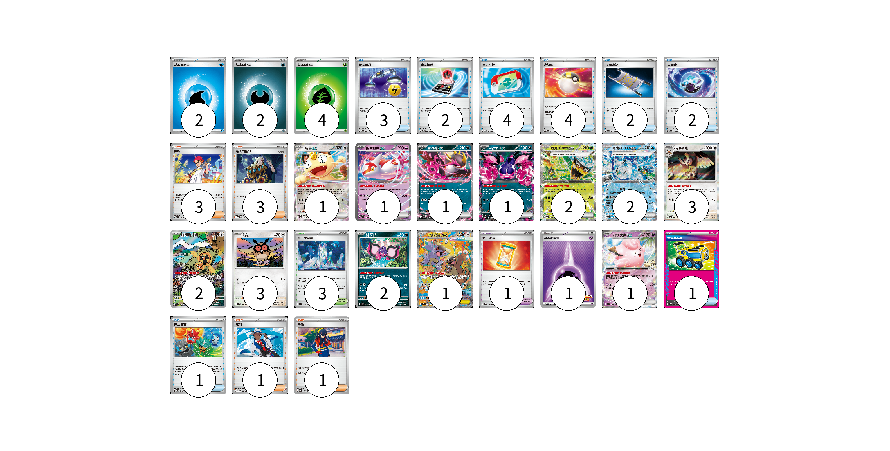牌組構築方案 以此牌組為基礎新構築牌組 顯示卡面 顯示列表 寶可夢卡(20) 1 1 1 1 2 2 3 2 3 2 1 1 寶可夢道具(1) 1 物品卡(19) 3 2 4 4 2 2 1 1 支援者卡(8) 3 3 1 1 競技場卡(3) 3 能量卡(9) 2 2 4 1 寶可夢卡(20) 卡牌名稱 張數 卡牌名稱 張數 喵喵ex M3 061/080 01 拉帝亞斯ex MC 312/742 01 吉雉雞ex MC 489/742 01 桃歹郎ex MBG 009/022 01 厄鬼椪 碧草面具ex SV8a 020/187 02 厄鬼椪 水井面具ex SV8a 050/187 02 貓頭夜鷹 SV8a 128/187 03 旋轉洛托姆 M2a 213/193 02 咕咕 MC 572/742 03 桃歹郎 SV8 075/106 02 超級袋獸ex M1S 089/063 01 莉莉艾的皮皮ex M2a 060/193 01 寶可夢道具(1) 卡牌名稱 張數 卡牌名稱 張數 力之沙漏 MC 683/742 01 物品卡(19) 卡牌名稱 張數 卡牌名稱 張數 能量轉移 MC 638/742 03 能量輸送 MC 639/742 02 寶可平板 M3 070/080 04 高級球 MC 651/742 04 夜間擔架 MC 670/742 02 太晶珠 M2a 152/193 02 貴重手推車 MC 658/742 01 鬼之假面 MC 641/742 01 支援者卡(8) 卡牌名稱 張數 卡牌名稱 張數 赤松 MC 696/742 03 老大的指令 MBD 020/022 03 席藍 SV8 102/106 01 丹瑜 SV8a 170/187 01 競技場卡(3) 卡牌名稱 張數 卡牌名稱 張數 零之大空洞 M2a 184/193 03 能量卡(9) 卡牌名稱 張數 卡牌名稱 張數 基本【水】能量 MC WAT 02 基本【惡】能量 MBG DAR 02 基本【草】能量 M-P GRA 04 基本【超】能量 SV-P 261/SV-P 01 以此牌組為基礎新構築牌組 牌組編碼 HpKpea-tSIhZG-yVqqfi copy 列印牌組單 牌組編碼已複製 分享至SNS