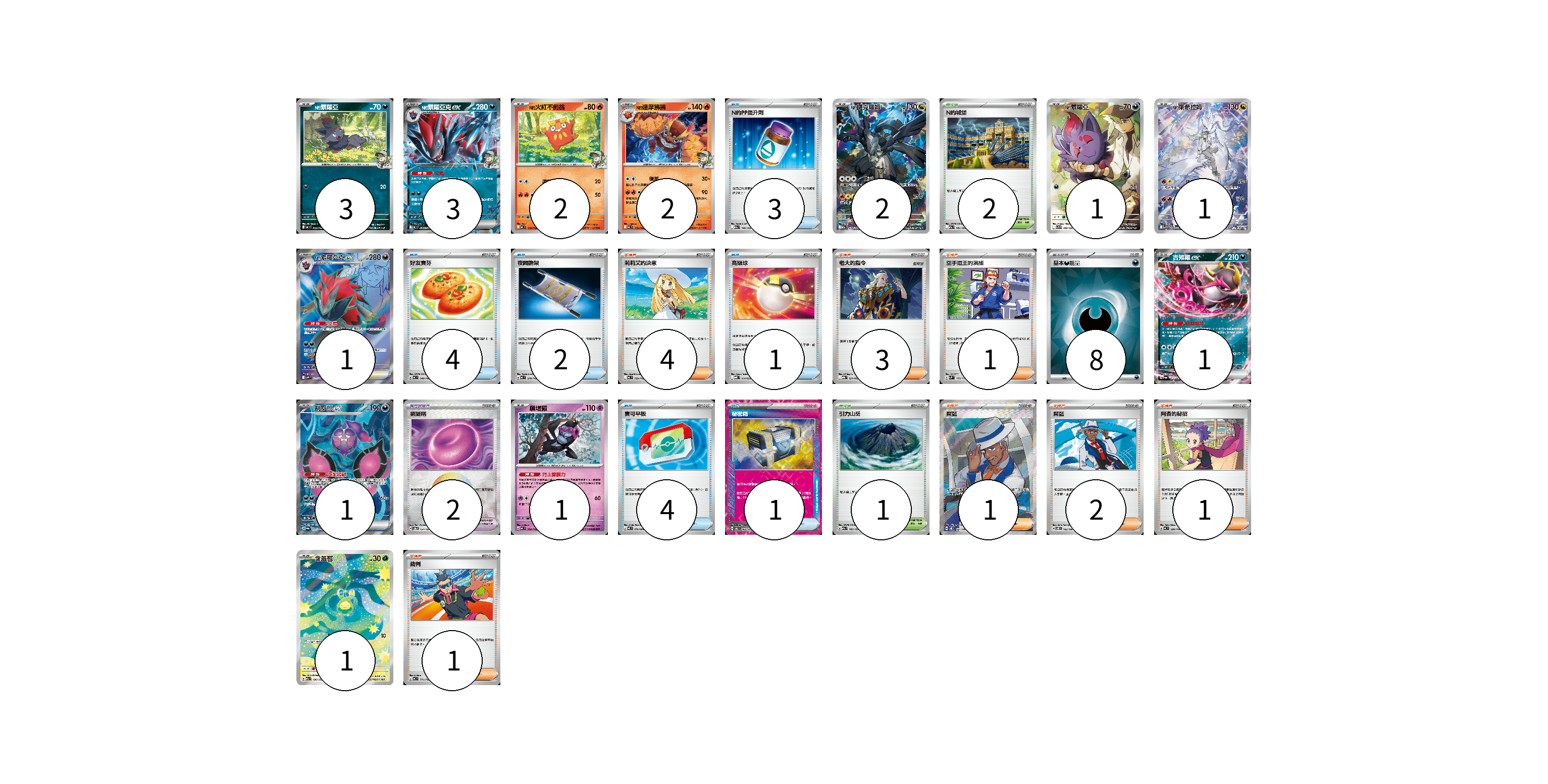 牌組構築方案 以此牌組為基礎新構築牌組 顯示卡面 顯示列表 寶可夢卡(19) 3 3 2 2 2 1 1 1 1 1 1 1 寶可夢道具(2) 2 物品卡(15) 3 4 2 1 4 1 支援者卡(13) 4 3 1 1 2 1 1 競技場卡(3) 2 1 能量卡(8) 8 寶可夢卡(19) 卡牌名稱 張數 卡牌名稱 張數 N的索羅亞 MC 469/742 03 N的索羅亞克ex MC 470/742 03 N的火紅不倒翁 MC 118/742 02 N的達摩狒狒 MC 119/742 02 N的捷克羅姆 M2a 210/193 02 N的索羅亞 SV9 108/100 01 N的萊希拉姆 SV9 109/100 01 N的索羅亞克ex SV9 117/100 01 吉雉雞ex SV6a 038/064 01 桃歹郎ex SV6a 082/064 01 願增猿 MC 358/742 01 含羞苞 M2a 196/193 01 寶可夢道具(2) 卡牌名稱 張數 卡牌名稱 張數 鎖鏈糬 SV8a 154/187 02 物品卡(15) 卡牌名稱 張數 卡牌名稱 張數 N的PP提升劑 M2a 146/193 03 好友寶芬 MC 648/742 04 夜間擔架 MC 670/742 02 高級球 MBD 014/022 01 寶可平板 M3 070/080 04 秘密箱 SV6 092/101 01 支援者卡(13) 卡牌名稱 張數 卡牌名稱 張數 莉莉艾的決意 MC 729/742 04 老大的指令 MBG 021/022 03 空手道王的演練 SVM 150/175 01 席藍 SV8 127/106 01 席藍 SV8 102/106 02 阿杏的秘招 MC 699/742 01 裁判 MC 711/742 01 競技場卡(3) 卡牌名稱 張數 卡牌名稱 張數 N的城堡 M2a 181/193 02 引力山岳 M2a 183/193 01 能量卡(8) 卡牌名稱 張數 卡牌名稱 張數 基本【惡】能量 SVM DAR 08 以此牌組為基礎新構築牌組 牌組編碼 HqQrUU-jaLCwq-TsMtri copy 列印牌組單 牌組編碼已複製 分享至SNS