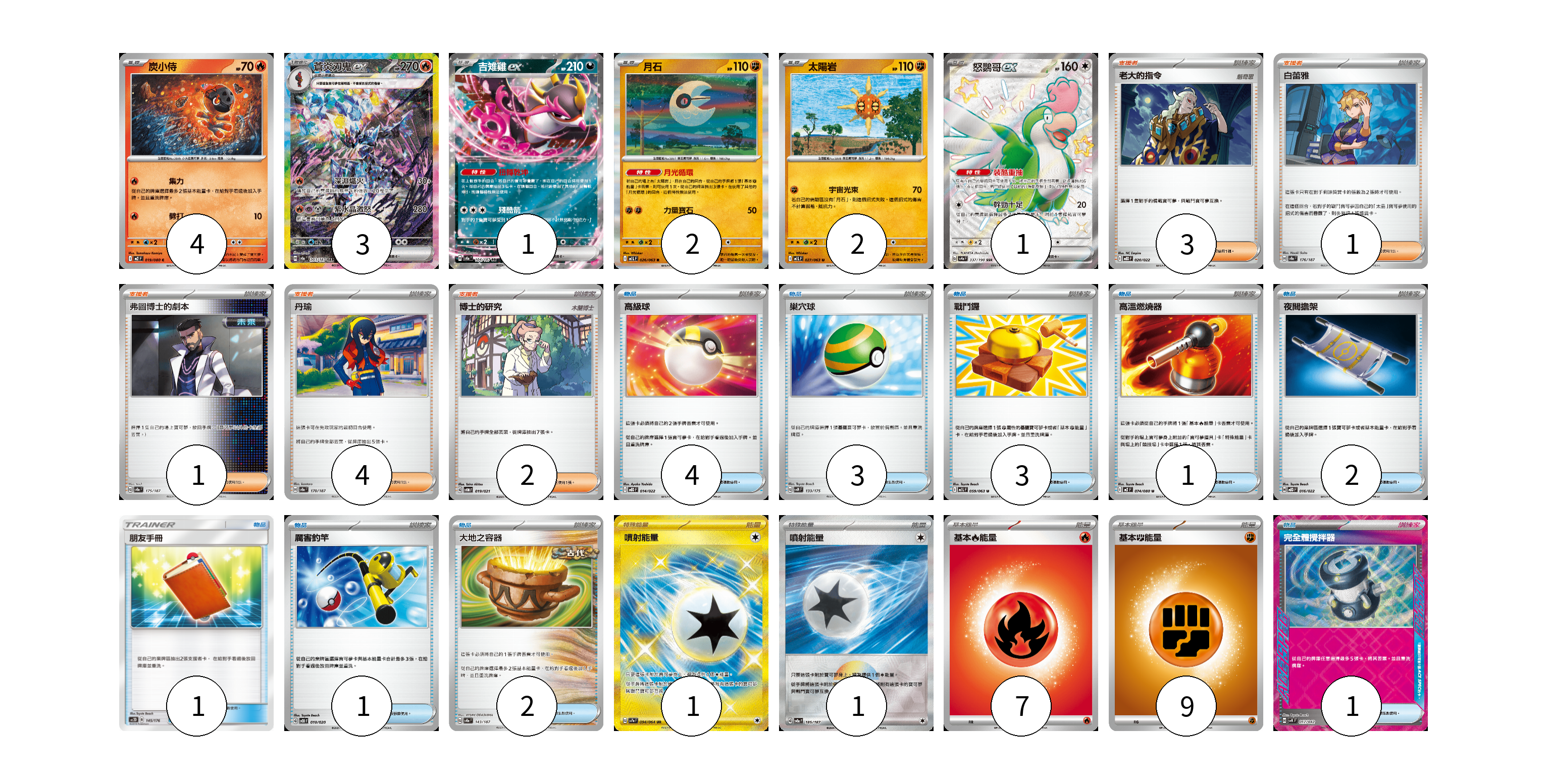 牌組構築方案 以此牌組為基礎新構築牌組 顯示卡面 顯示列表 寶可夢卡(13) 4 3 1 2 2 1 物品卡(18) 4 3 3 1 2 1 1 2 1 支援者卡(11) 3 1 1 4 2 能量卡(18) 1 1 7 9 寶可夢卡(13) 卡牌名稱 張數 卡牌名稱 張數 炭小侍 M2 019/080 04 蒼炎刃鬼ex SV8a 203/187 03 吉雉雞ex SV8a 104/187 01 月石 M1L 026/063 02 太陽岩 M1L 027/063 02 怒鸚哥ex SV4a 337/190 01 物品卡(18) 卡牌名稱 張數 卡牌名稱 張數 高級球 MBD 014/022 04 巢穴球 SVM 133/175 03 戰鬥鑼 M1L 059/063 03 高溫燃燒器 M2 074/080 01 夜間擔架 MBD 016/022 02 朋友手冊 AC2D 145/176 01 厲害釣竿 SVOD 010/020 01 大地之容器 SV8a 143/187 02 完全體攪拌器 SVK 017/042 01 支援者卡(11) 卡牌名稱 張數 卡牌名稱 張數 老大的指令 MBD 020/022 03 白蕾雅 SV8a 176/187 01 弗圖博士的劇本 SV8a 175/187 01 丹瑜 SV8a 170/187 04 博士的研究 SVOM 019/021 02 能量卡(18) 卡牌名稱 張數 卡牌名稱 張數 噴射能量 SV7a 094/064 01 噴射能量 SV8a 185/187 01 基本【火】能量 M-P FIR 07 基本【鬥】能量 M-P FIG 09 以此牌組為基礎新構築牌組 牌組編碼 HsKMST-SMlDHK-BupeLs copy 列印牌組單 牌組編碼已複製 分享至SNS