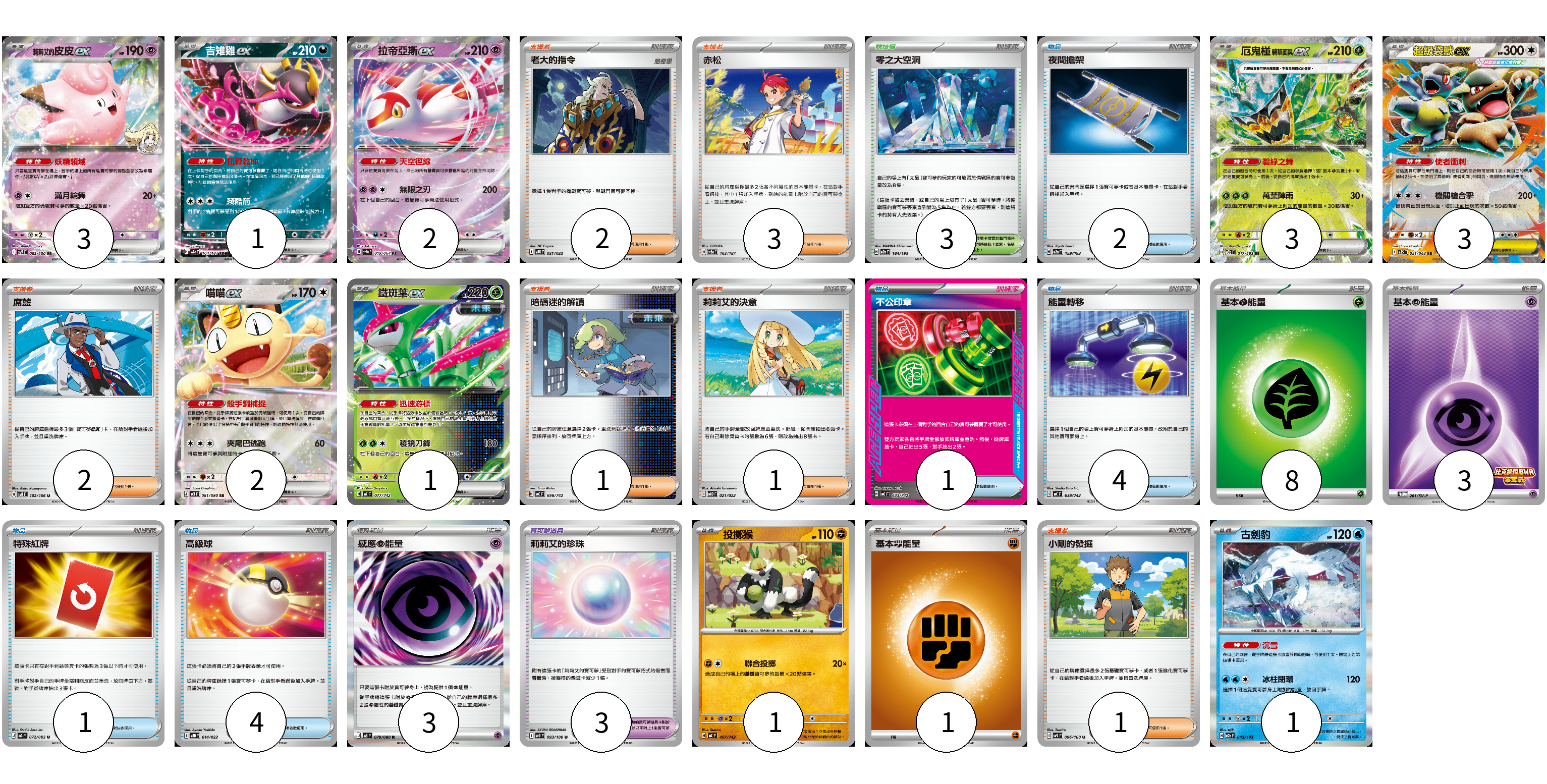 牌組構築方案 以此牌組為基礎新構築牌組 顯示卡面 顯示列表 寶可夢卡(17) 3 1 2 3 3 2 1 1 1 寶可夢道具(3) 3 物品卡(12) 2 1 4 1 4 支援者卡(10) 2 3 2 1 1 1 競技場卡(3) 3 能量卡(15) 8 3 3 1 寶可夢卡(17) 卡牌名稱 張數 卡牌名稱 張數 莉莉艾的皮皮ex SV9 033/100 03 吉雉雞ex SV8a 104/187 01 拉帝亞斯ex SV7a 019/064 02 厄鬼椪 碧草面具ex M2a 017/193 03 超級袋獸ex M1S 051/063 03 喵喵ex M3 061/080 02 鐵斑葉ex MC 077/742 01 投擲猴 MC 407/742 01 古劍豹 M2a 043/193 01 寶可夢道具(3) 卡牌名稱 張數 卡牌名稱 張數 莉莉艾的珍珠 SV9 093/100 03 物品卡(12) 卡牌名稱 張數 卡牌名稱 張數 夜間擔架 M2a 159/193 02 不公印章 MC 633/742 01 能量轉移 MC 638/742 04 特殊紅牌 M4 072/083 01 高級球 MBD 014/022 04 支援者卡(10) 卡牌名稱 張數 卡牌名稱 張數 老大的指令 MBG 021/022 02 赤松 SV8a 163/187 03 席藍 SV8 102/106 02 暗碼迷的解讀 MC 698/742 01 莉莉艾的決意 MBD 021/022 01 小剛的發掘 SV9 096/100 01 競技場卡(3) 卡牌名稱 張數 卡牌名稱 張數 零之大空洞 M2a 184/193 03 能量卡(15) 卡牌名稱 張數 卡牌名稱 張數 基本【草】能量 MJ GRA 08 基本【超】能量 SV-P 261/SV-P 03 感應【超】能量 M3 079/080 03 基本【鬥】能量 MC FIG 01 以此牌組為基礎新構築牌組 牌組編碼 HsNnUc-eNLvUW-aIMGdg copy 列印牌組單 牌組編碼已複製 分享至SNS