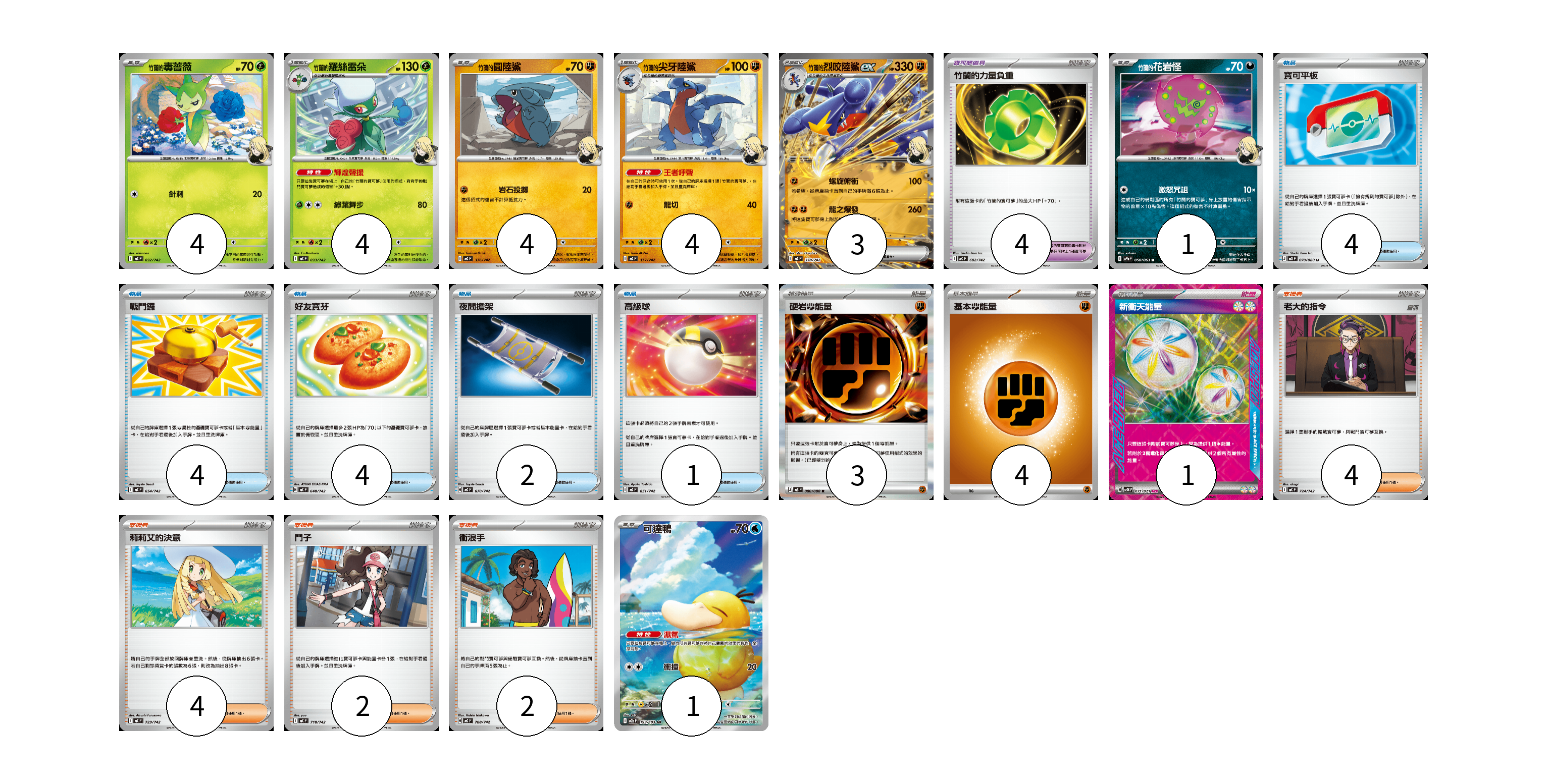牌組構築方案 以此牌組為基礎新構築牌組 顯示卡面 顯示列表 寶可夢卡(21) 4 4 4 4 3 1 1 寶可夢道具(4) 4 物品卡(15) 4 4 4 2 1 支援者卡(12) 4 4 2 2 能量卡(8) 3 4 1 寶可夢卡(21) 卡牌名稱 張數 卡牌名稱 張數 竹蘭的毒薔薇 MC 032/742 04 <竹蘭的>羅絲雷朵 MC 033/742 04 竹蘭的圓陸鯊 MC 376/742 04 竹蘭的尖牙陸鯊 MC 377/742 04 <竹蘭的>烈咬陸鯊ex MC 378/742 03 <竹蘭的>花岩怪 SV9a 050/063 01 可達鴨 M2a 199/193 01 寶可夢道具(4) 卡牌名稱 張數 卡牌名稱 張數 竹蘭的力量負重 MC 682/742 04 物品卡(15) 卡牌名稱 張數 卡牌名稱 張數 寶可平板 M3 070/080 04 戰鬥鑼 MC 654/742 04 好友寶芬 MC 648/742 04 夜間擔架 MC 670/742 02 高級球 MC 651/742 01 支援者卡(12) 卡牌名稱 張數 卡牌名稱 張數 老大的指令 MC 724/742 04 莉莉艾的決意 MC 729/742 04 鬥子 MC 718/742 02 衝浪手 MC 708/742 02 能量卡(8) 卡牌名稱 張數 卡牌名稱 張數 硬岩【鬥】能量 M3 080/080 03 基本【鬥】能量 MC FIG 04 新衝天能量 SV5K 071/071 01 以此牌組為基礎新構築牌組 牌組編碼 HwSQPH-vPKucw-akJgrA copy 列印牌組單 牌組編碼已複製 分享至SNS