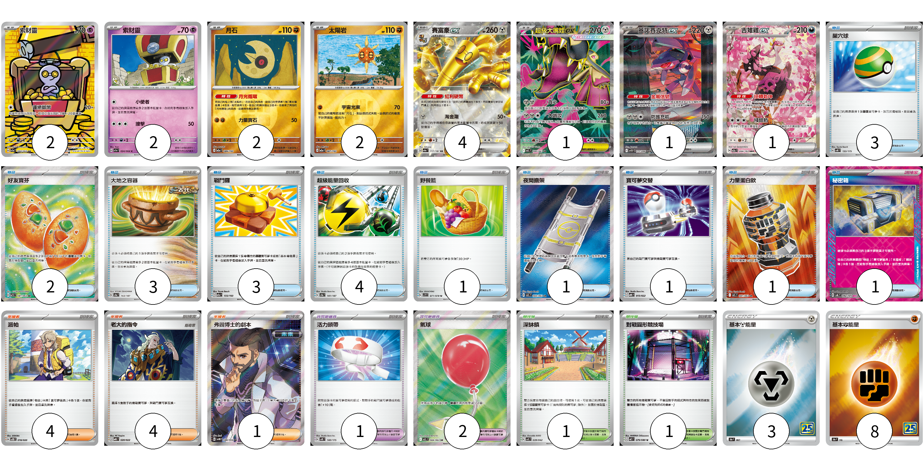 牌組構築方案 以此牌組為基礎新構築牌組 顯示卡面 顯示列表 寶可夢卡(15) 2 2 2 2 4 1 1 1 寶可夢道具(3) 1 2 物品卡(20) 3 2 3 3 4 1 1 1 1 1 支援者卡(9) 4 4 1 競技場卡(2) 1 1 能量卡(11) 3 8 寶可夢卡(15) 卡牌名稱 張數 卡牌名稱 張數 索財靈 SV3a 068/062 02 索財靈 SV7a 024/064 02 月石 M2a 086/193 02 太陽岩 M2a 087/193 02 賽富豪ex SV8a 117/187 04 超級大嘴娃ex M1L 080/063 01 蓋諾賽克特ex SV11B 172/086 01 吉雉雞ex M2a 244/193 01 寶可夢道具(3) 卡牌名稱 張數 卡牌名稱 張數 活力頭帶 SVM 140/175 01 氣球 M1L 084/063 02 物品卡(20) 卡牌名稱 張數 卡牌名稱 張數 巢穴球 SVM 133/175 03 好友寶芬 M1S 081/063 02 大地之容器 SV8a 143/187 03 戰鬥鑼 M2a 155/193 03 超級能量回收 SV8a 141/187 04 野餐籃 SV1V 071/078 01 夜間擔架 M1L 083/063 01 寶可夢交替 MBG 015/022 01 力量蛋白飲 M1L 081/063 01 秘密箱 SV6 092/101 01 支援者卡(9) 卡牌名稱 張數 卡牌名稱 張數 派帕 SVOD 018/020 04 老大的指令 MBD 020/022 04 弗圖博士的劇本 SV4M 086/066 01 競技場卡(2) 卡牌名稱 張數 卡牌名稱 張數 深缽鎮 SVK 039/042 01 對戰圓形競技場 M2 079/080 01 能量卡(11) 卡牌名稱 張數 卡牌名稱 張數 基本鋼能量 S8a MET 03 基本鬥能量 S8a FIG 08 以此牌組為基礎新構築牌組 牌組編碼 IBWzhZ-bNXMDQ-anzcDJ copy 列印牌組單 牌組編碼已複製 分享至SNS
