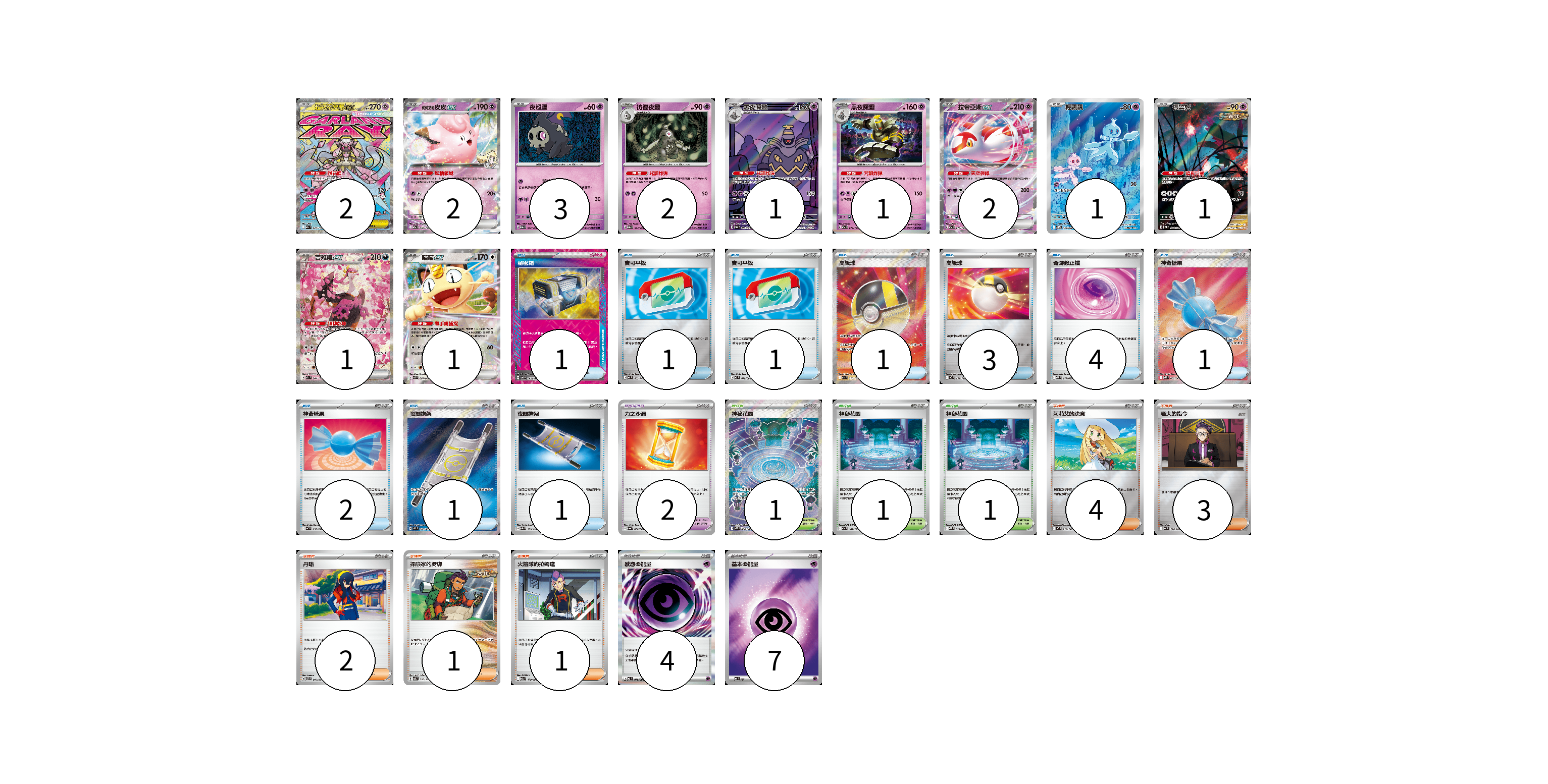 牌組構築方案 以此牌組為基礎新構築牌組 顯示卡面 顯示列表 寶可夢卡(17) 2 2 3 2 1 1 2 1 1 1 1 寶可夢道具(2) 2 物品卡(16) 1 1 1 1 3 4 1 2 1 1 支援者卡(11) 4 3 2 1 1 競技場卡(3) 1 1 1 能量卡(11) 4 7 寶可夢卡(17) 卡牌名稱 張數 卡牌名稱 張數 超級蒂安希ex M2a 227/193 02 莉莉艾的皮皮ex M2a 060/193 02 夜巡靈 M2a 072/193 03 彷徨夜靈 M2a 073/193 02 黑夜魔靈 SV6a 070/064 01 黑夜魔靈 M2a 074/193 01 拉帝亞斯ex M2a 075/193 02 輕飄飄 SV11W 124/086 01 振翼髮 SV5K 076/071 01 吉雉雞ex M2a 244/193 01 喵喵ex M3 061/080 01 寶可夢道具(2) 卡牌名稱 張數 卡牌名稱 張數 力之沙漏 SV6a 058/064 02 物品卡(16) 卡牌名稱 張數 卡牌名稱 張數 秘密箱 SV6 092/101 01 寶可平板 MC 662/742 01 寶可平板 M3 070/080 01 高級球 M2a 216/193 01 高級球 MC 651/742 03 奇跡修正檔 MBD 017/022 04 神奇糖果 M1S 082/063 01 神奇糖果 MC 655/742 02 夜間擔架 M1L 083/063 01 夜間擔架 M2a 159/193 01 支援者卡(11) 卡牌名稱 張數 卡牌名稱 張數 莉莉艾的決意 MC 729/742 04 老大的指令 MC 724/742 03 丹瑜 SVTR 016/021 02 探險家的嚮導 SV5K 067/071 01 火箭隊的拉姆達 M2a 179/193 01 競技場卡(3) 卡牌名稱 張數 卡牌名稱 張數 神秘花園 M1S 086/063 01 神秘花園 M2a 187/193 01 神秘花園 MBD 022/022 01 能量卡(11) 卡牌名稱 張數 卡牌名稱 張數 感應【超】能量 M3 079/080 04 基本【超】能量 MC PSY 07 以此牌組為基礎新構築牌組 牌組編碼 IEPNoZ-TOFpWx-wPcCSl copy 列印牌組單 牌組編碼已複製 分享至SNS