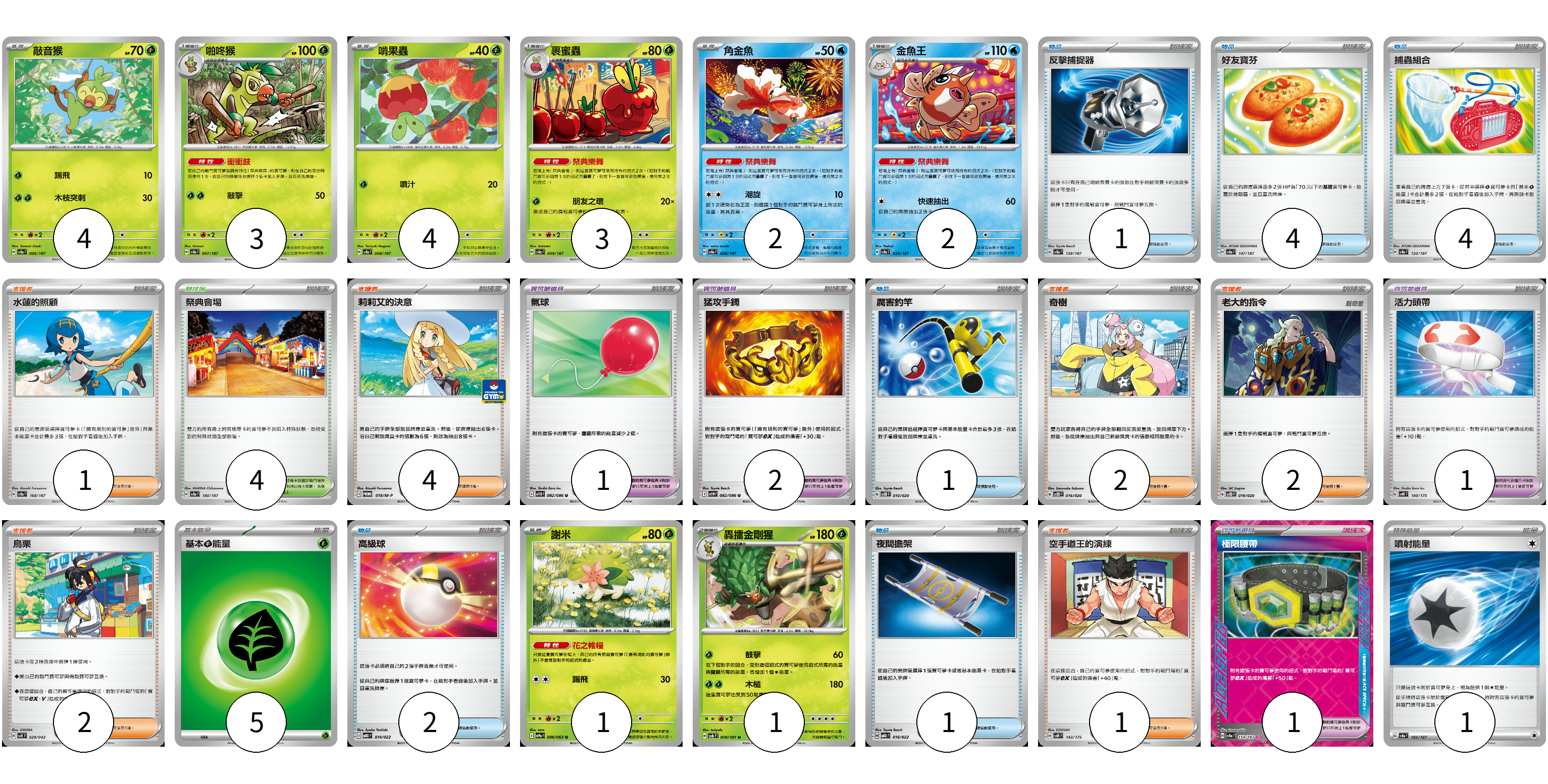 牌組構築方案 以此牌組為基礎新構築牌組 顯示卡面 顯示列表 寶可夢卡(20) 4 3 4 3 2 2 1 1 寶可夢道具(5) 1 2 1 1 物品卡(13) 1 4 4 1 2 1 支援者卡(12) 1 4 2 2 2 1 競技場卡(4) 4 能量卡(6) 5 1 寶可夢卡(20) 卡牌名稱 張數 卡牌名稱 張數 敲音猴 SV8a 006/187 04 啪咚猴 SV8a 007/187 03 啃果蟲 SV8a 008/187 04 裹蜜蟲 SV8a 009/187 03 角金魚 SV8a 028/187 02 金魚王 SV8a 029/187 02 謝米 SV9a 006/063 01 轟擂金剛猩 SV6 010/101 01 寶可夢道具(5) 卡牌名稱 張數 卡牌名稱 張數 氣球 SV11B 082/086 01 猛攻手鐲 SV11W 082/086 02 活力頭帶 SVM 140/175 01 極限腰帶 SV8a 159/187 01 物品卡(13) 卡牌名稱 張數 卡牌名稱 張數 反擊捕捉器 SV8a 139/187 01 好友寶芬 SV8a 147/187 04 捕蟲組合 SV8a 150/187 04 厲害釣竿 SVOD 010/020 01 高級球 MBD 014/022 02 夜間擔架 MBD 016/022 01 支援者卡(12) 卡牌名稱 張數 卡牌名稱 張數 水蓮的照顧 SV8a 168/187 01 莉莉艾的決意 M-P 018/M-P 04 奇樹 SVOD 016/020 02 老大的指令 SVOD 019/020 02 烏栗 SVK 029/042 02 空手道王的演練 SVM 143/175 01 競技場卡(4) 卡牌名稱 張數 卡牌名稱 張數 祭典會場 SV8a 180/187 04 能量卡(6) 卡牌名稱 張數 卡牌名稱 張數 基本【草】能量 SVF GRA 05 噴射能量 SV8a 185/187 01 以此牌組為基礎新構築牌組 牌組編碼 IFBYhP-HOvFPw-kwhtlv copy 列印牌組單 牌組編碼已複製 分享至SNS