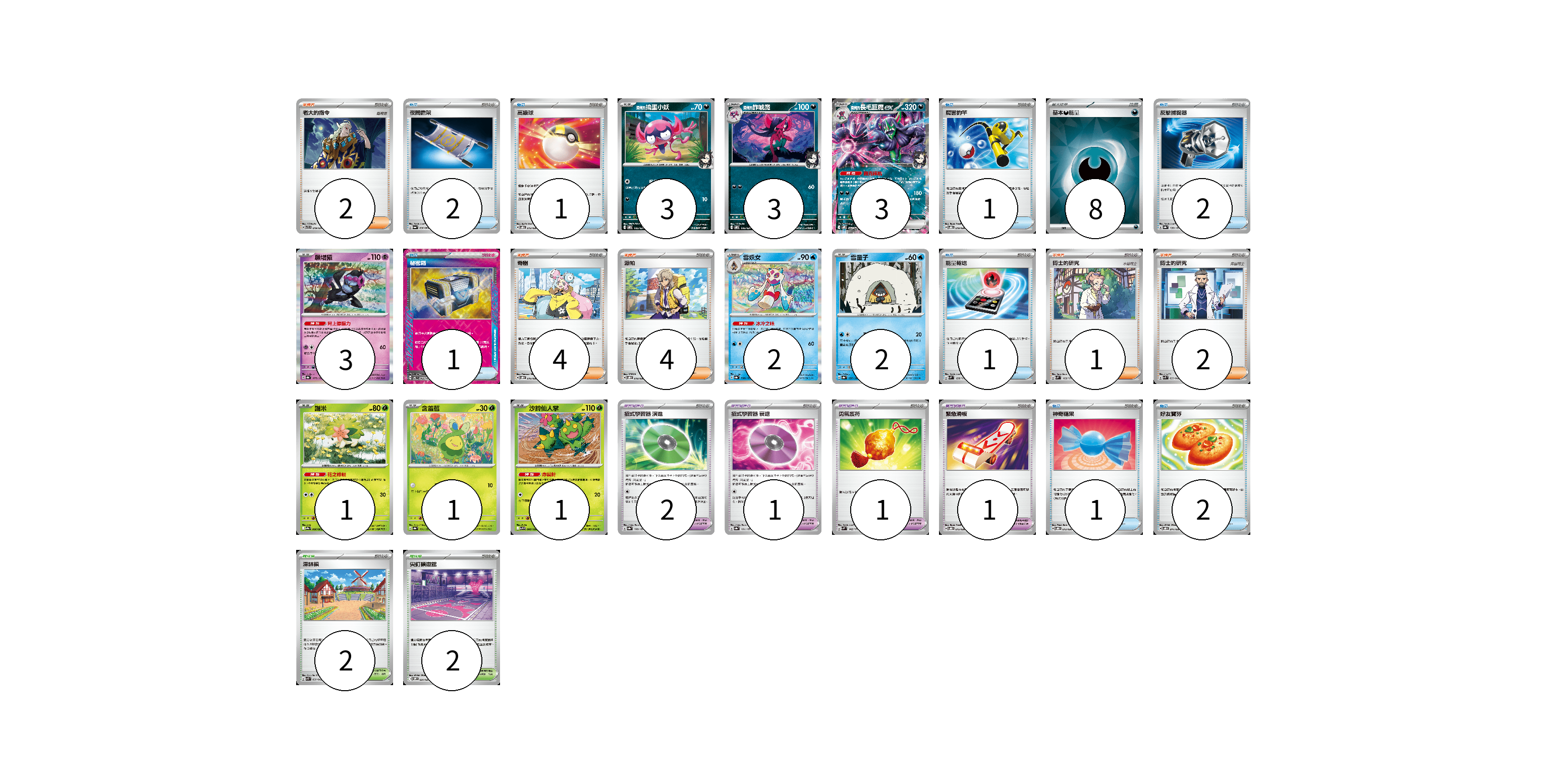 牌組構築方案 以此牌組為基礎新構築牌組 顯示卡面 顯示列表 寶可夢卡(19) 3 3 3 3 2 2 1 1 1 寶可夢道具(5) 2 1 1 1 物品卡(11) 2 1 1 2 1 1 1 2 支援者卡(13) 2 4 4 1 2 競技場卡(4) 2 2 能量卡(8) 8 寶可夢卡(19) 卡牌名稱 張數 卡牌名稱 張數 <瑪俐的>搗蛋小妖 SVOM 005/021 03 <瑪俐的>詐唬魔 SVOM 006/021 03 <瑪俐的>長毛巨魔ex SVOM 007/021 03 願增猿 SV8a 075/187 03 雪妖女 SV8a 038/187 02 雪童子 SV8a 037/187 02 謝米 SV9a 006/063 01 含羞苞 SV8a 001/187 01 沙鈴仙人掌 SV9 006/100 01 寶可夢道具(5) 卡牌名稱 張數 卡牌名稱 張數 招式學習器 演進 SV8a 160/187 02 招式學習器 衰退 SV8a 161/187 01 勇氣護符 SVM 142/175 01 緊急滑板 SVOD 015/020 01 物品卡(11) 卡牌名稱 張數 卡牌名稱 張數 夜間擔架 SV6a 056/064 02 高級球 SVOD 012/020 01 厲害釣竿 SVOD 010/020 01 反擊捕捉器 SV8a 139/187 02 秘密箱 SV6 092/101 01 能量輸送 SVM 128/175 01 神奇糖果 SVOD 013/020 01 好友寶芬 SVOD 011/020 02 支援者卡(13) 卡牌名稱 張數 卡牌名稱 張數 老大的指令 SVTR 019/021 02 奇樹 SVOD 016/020 04 派帕 SVOD 018/020 04 博士的研究 SVM 169/175 01 博士的研究 SVK 033/042 02 競技場卡(4) 卡牌名稱 張數 卡牌名稱 張數 深缽鎮 SVK 039/042 02 尖釘鎮道館 SVOM 021/021 02 能量卡(8) 卡牌名稱 張數 卡牌名稱 張數 基本【惡】能量 SVOM DAR 08 以此牌組為基礎新構築牌組 牌組編碼 IHyRwy-ItQhIi-vhijNk copy 列印牌組單 牌組編碼已複製 分享至SNS