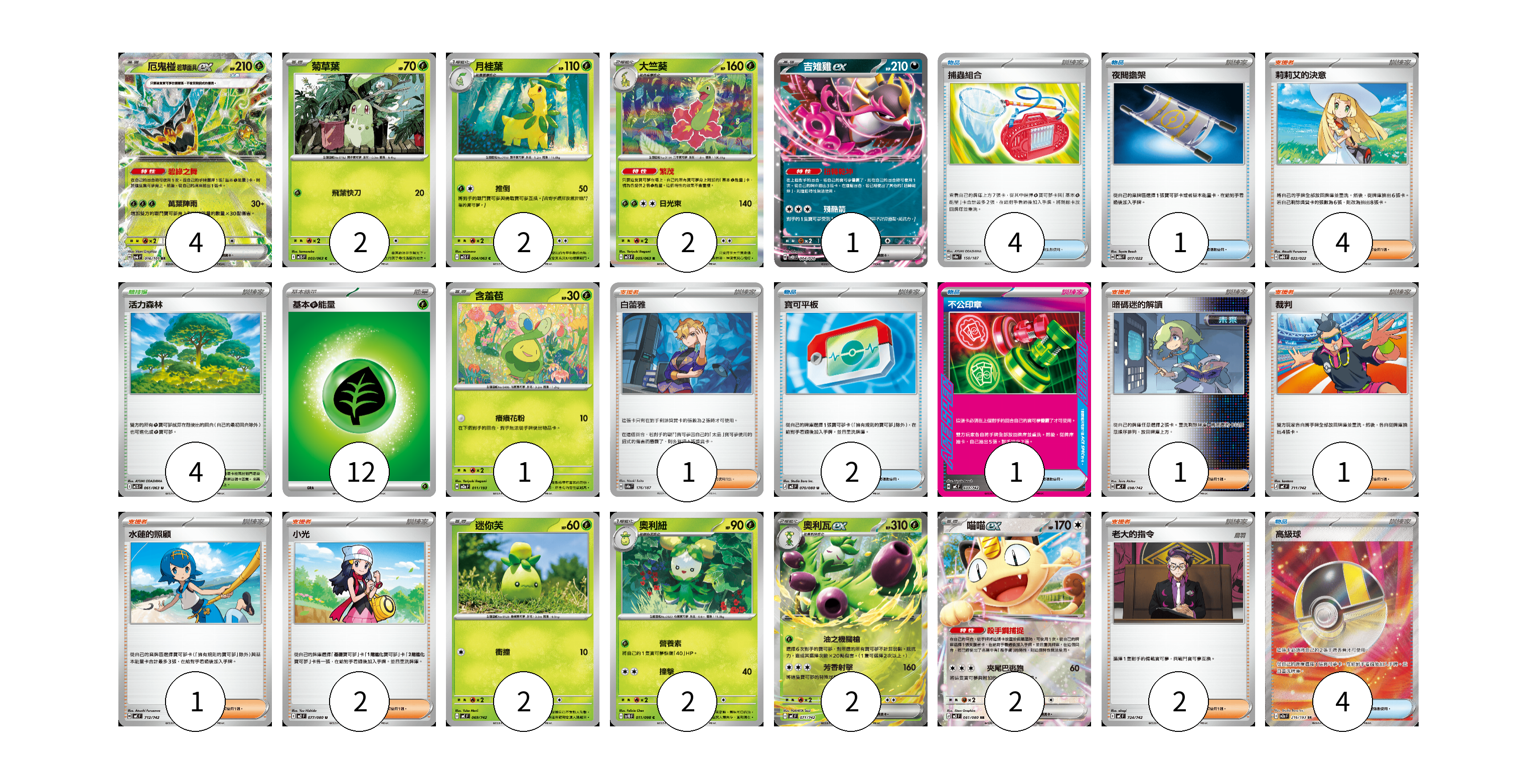 牌組構築方案 以此牌組為基礎新構築牌組 顯示卡面 顯示列表 寶可夢卡(20) 4 2 2 2 1 1 2 2 2 2 物品卡(12) 4 1 2 1 4 支援者卡(12) 4 1 1 1 1 2 2 競技場卡(4) 4 能量卡(12) 12 寶可夢卡(20) 卡牌名稱 張數 卡牌名稱 張數 厄鬼椪 碧草面具ex SV6 016/101 04 菊草葉 M1S 003/063 02 月桂葉 M1S 004/063 02 大竺葵 M1S 005/063 02 吉雉雞ex SVOD 004/020 01 含羞苞 M2a 011/193 01 迷你芙 MC 069/742 02 奧利紐 SV10 011/098 02 奧利瓦ex MC 071/742 02 喵喵ex M3 061/080 02 物品卡(12) 卡牌名稱 張數 卡牌名稱 張數 捕蟲組合 SV8a 150/187 04 夜間擔架 MBG 017/022 01 寶可平板 M3 070/080 02 不公印章 MC 633/742 01 高級球 M2a 216/193 04 支援者卡(12) 卡牌名稱 張數 卡牌名稱 張數 莉莉艾的決意 MBG 022/022 04 白蕾雅 SV8a 176/187 01 暗碼迷的解讀 MC 698/742 01 裁判 MC 711/742 01 水蓮的照顧 MC 712/742 01 小光 M2 077/080 02 老大的指令 MC 724/742 02 競技場卡(4) 卡牌名稱 張數 卡牌名稱 張數 活力森林 M1S 061/063 04 能量卡(12) 卡牌名稱 張數 卡牌名稱 張數 基本【草】能量 M-P GRA 12 以此牌組為基礎新構築牌組 牌組編碼 IHzjLj-rWBWLD-mjafPP copy 列印牌組單 牌組編碼已複製 分享至SNS