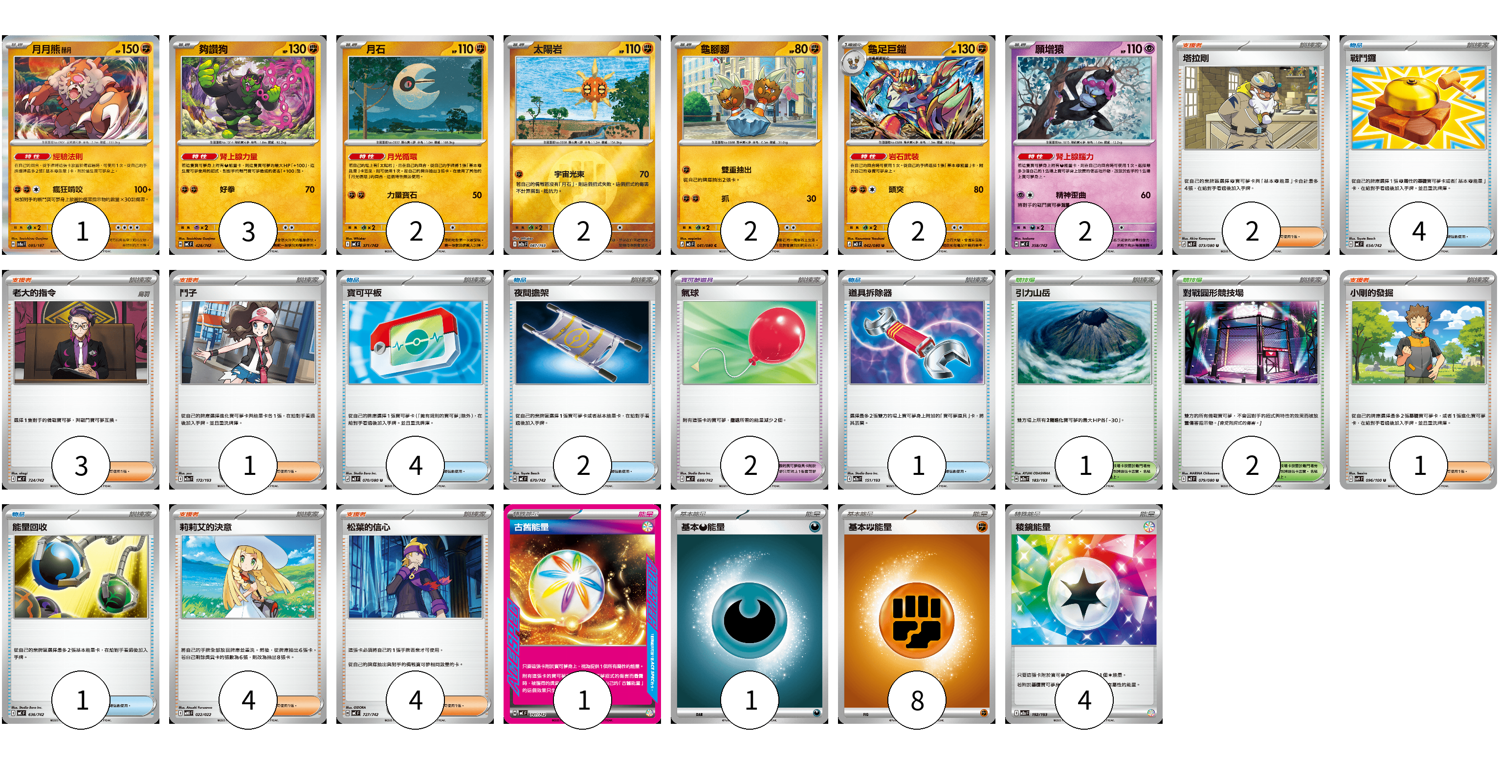 牌組構築方案 以此牌組為基礎新構築牌組 顯示卡面 顯示列表 寶可夢卡(14) 1 3 2 2 2 2 2 寶可夢道具(2) 2 物品卡(12) 4 4 2 1 1 支援者卡(15) 2 3 1 1 4 4 競技場卡(3) 1 2 能量卡(14) 1 1 8 4 寶可夢卡(14) 卡牌名稱 張數 卡牌名稱 張數 月月熊 赫月 SV8a 085/187 01 夠讚狗 MC 426/742 03 月石 MC 371/742 02 太陽岩 M2a 087/193 02 龜腳腳 M3 041/080 02 龜足巨鎧 M3 042/080 02 願增猿 MC 358/742 02 寶可夢道具(2) 卡牌名稱 張數 卡牌名稱 張數 氣球 MC 688/742 02 物品卡(12) 卡牌名稱 張數 卡牌名稱 張數 戰鬥鑼 MC 654/742 04 寶可平板 M3 070/080 04 夜間擔架 MC 670/742 02 道具拆除器 M2a 151/193 01 能量回收 MC 636/742 01 支援者卡(15) 卡牌名稱 張數 卡牌名稱 張數 塔拉剛 M3 073/080 02 老大的指令 MC 724/742 03 鬥子 M2a 172/193 01 小剛的發掘 SV9 096/100 01 莉莉艾的決意 MBG 022/022 04 松葉的信心 MC 727/742 04 競技場卡(3) 卡牌名稱 張數 卡牌名稱 張數 引力山岳 M2a 183/193 01 對戰圓形競技場 M2 079/080 02 能量卡(14) 卡牌名稱 張數 卡牌名稱 張數 古舊能量 MC 741/742 01 基本【惡】能量 MC DAR 01 基本【鬥】能量 MC FIG 08 稜鏡能量 M2a 192/193 04 以此牌組為基礎新構築牌組 牌組編碼 ILKbPG-bLrAjn-cJKBff copy 列印牌組單 牌組編碼已複製 分享至SNS