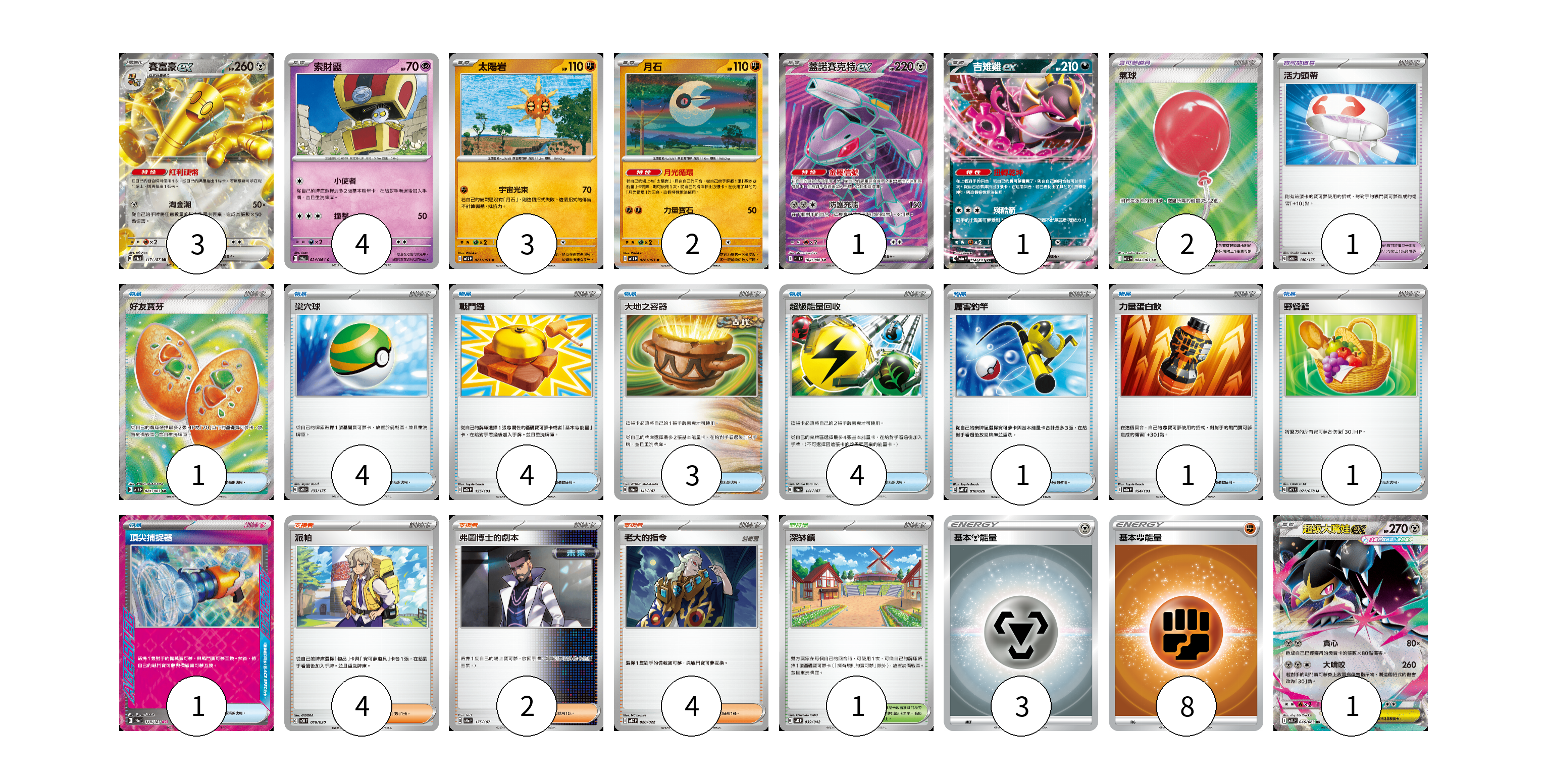 牌組構築方案 以此牌組為基礎新構築牌組 顯示卡面 顯示列表 寶可夢卡(15) 3 4 3 2 1 1 1 寶可夢道具(3) 2 1 物品卡(20) 1 4 4 3 4 1 1 1 1 支援者卡(10) 4 2 4 競技場卡(1) 1 能量卡(11) 3 8 寶可夢卡(15) 卡牌名稱 張數 卡牌名稱 張數 賽富豪ex SV8a 117/187 03 索財靈 SV7a 024/064 04 太陽岩 M1L 027/063 03 月石 M1L 026/063 02 蓋諾賽克特ex SV11B 164/086 01 吉雉雞ex M2a 114/193 01 超級大嘴娃ex M1L 046/063 01 寶可夢道具(3) 卡牌名稱 張數 卡牌名稱 張數 氣球 M1L 084/063 02 活力頭帶 SVM 140/175 01 物品卡(20) 卡牌名稱 張數 卡牌名稱 張數 好友寶芬 M1S 081/063 01 巢穴球 SVM 133/175 04 戰鬥鑼 M2a 155/193 04 大地之容器 SV8a 143/187 03 超級能量回收 SV8a 141/187 04 厲害釣竿 SVOD 010/020 01 力量蛋白飲 M2a 154/193 01 野餐籃 SV1V 071/078 01 頂尖捕捉器 SV8a 148/187 01 支援者卡(10) 卡牌名稱 張數 卡牌名稱 張數 派帕 SVOD 018/020 04 弗圖博士的劇本 SV8a 175/187 02 老大的指令 MBD 020/022 04 競技場卡(1) 卡牌名稱 張數 卡牌名稱 張數 深缽鎮 SVK 039/042 01 能量卡(11) 卡牌名稱 張數 卡牌名稱 張數 基本【鋼】能量 SI MET 03 基本【鬥】能量 SI FIG 08 以此牌組為基礎新構築牌組 牌組編碼 INItzd-tVVFIE-HBACUb copy 列印牌組單 牌組編碼已複製 分享至SNS