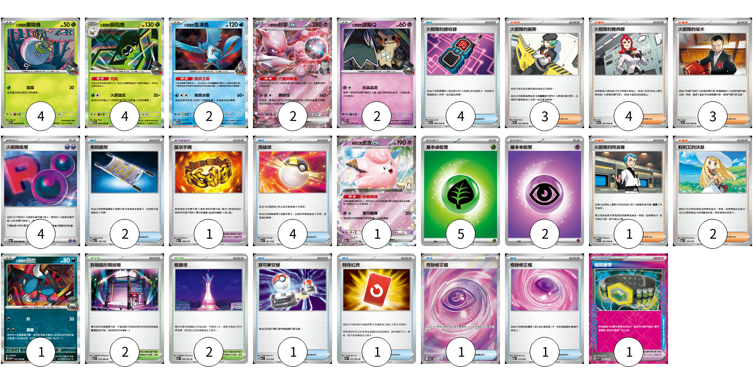 牌組構築方案 以此牌組為基礎新構築牌組 顯示卡面 顯示列表 寶可夢卡(16) 4 4 2 2 2 1 1 寶可夢道具(2) 1 1 物品卡(14) 4 2 4 1 1 1 1 支援者卡(13) 3 4 3 1 2 競技場卡(4) 2 2 能量卡(11) 4 5 2 寶可夢卡(16) 卡牌名稱 張數 卡牌名稱 張數 <火箭隊的>團珠蛛 SV10 008/098 04 <火箭隊的>操陷蛛 SV10 009/098 04 <火箭隊的>急凍鳥 SV10 022/098 02 <火箭隊的>超夢ex SV10 039/098 02 <火箭隊的>謎擬Q M2a 079/193 02 莉莉艾的皮皮ex M2a 060/193 01 <火箭隊的>狃拉 SV10 072/098 01 寶可夢道具(2) 卡牌名稱 張數 卡牌名稱 張數 猛攻手鐲 MC 689/742 01 極限腰帶 SV5K 066/071 01 物品卡(14) 卡牌名稱 張數 卡牌名稱 張數 火箭隊的接收器 SV10 090/098 04 夜間擔架 M2a 159/193 02 高級球 MC 651/742 04 寶可夢交替 MJ 019/022 01 特殊紅牌 M4 072/083 01 奇跡修正檔 M3 104/080 01 奇跡修正檔 MBD 017/022 01 支援者卡(13) 卡牌名稱 張數 卡牌名稱 張數 火箭隊的蘭斯 SV10 095/098 03 火箭隊的雅典娜 SV10 091/098 04 火箭隊的坂木 SV10 093/098 03 火箭隊的阿波羅 SV10 092/098 01 莉莉艾的決意 M2a 175/193 02 競技場卡(4) 卡牌名稱 張數 卡牌名稱 張數 對戰圓形競技場 M2 079/080 02 稜鏡塔 M4 080/083 02 能量卡(11) 卡牌名稱 張數 卡牌名稱 張數 火箭隊能量 SV10 098/098 04 基本【草】能量 MJ GRA 05 基本【超】能量 M-P PSY 02 以此牌組為基礎新構築牌組 牌組編碼 IQLQbs-sHavyd-NnCiya copy 列印牌組單 牌組編碼已複製 分享至SNS