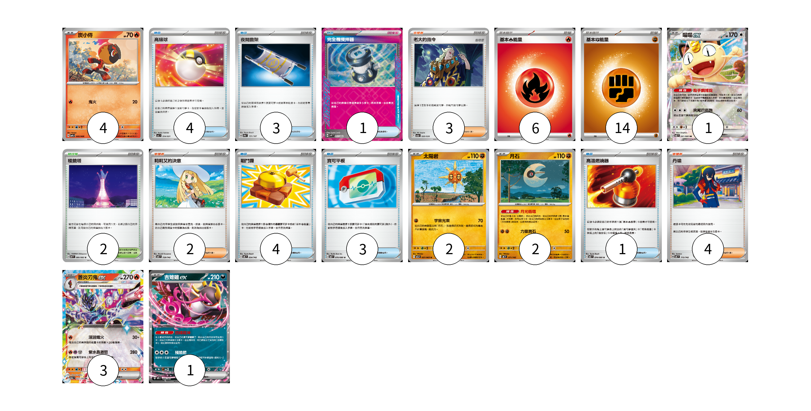 牌組構築方案 以此牌組為基礎新構築牌組 顯示卡面 顯示列表 寶可夢卡(13) 4 1 2 2 3 1 物品卡(16) 4 3 1 4 3 1 支援者卡(9) 3 2 4 競技場卡(2) 2 能量卡(20) 6 14 寶可夢卡(13) 卡牌名稱 張數 卡牌名稱 張數 炭小侍 SVPS 005/008 04 喵喵ex M3 061/080 01 太陽岩 M1L 027/063 02 月石 MC 371/742 02 蒼炎刃鬼ex M2a 031/193 03 吉雉雞ex MC 489/742 01 物品卡(16) 卡牌名稱 張數 卡牌名稱 張數 高級球 SVC 014/021 04 夜間擔架 SV8a 151/187 03 完全體攪拌器 SVK 017/042 01 戰鬥鑼 MC 654/742 04 寶可平板 M3 070/080 03 高溫燃燒器 M2 074/080 01 支援者卡(9) 卡牌名稱 張數 卡牌名稱 張數 老大的指令 SVEM 020/020 03 莉莉艾的決意 MC 729/742 02 丹瑜 MC 715/742 04 競技場卡(2) 卡牌名稱 張數 卡牌名稱 張數 稜鏡塔 M4 080/083 02 能量卡(20) 卡牌名稱 張數 卡牌名稱 張數 基本【火】能量 MC FIR 06 基本【鬥】能量 MC FIG 14 以此牌組為基礎新構築牌組 牌組編碼 IRhAwY-XgTBkU-dlzbgk copy 列印牌組單 牌組編碼已複製 分享至SNS