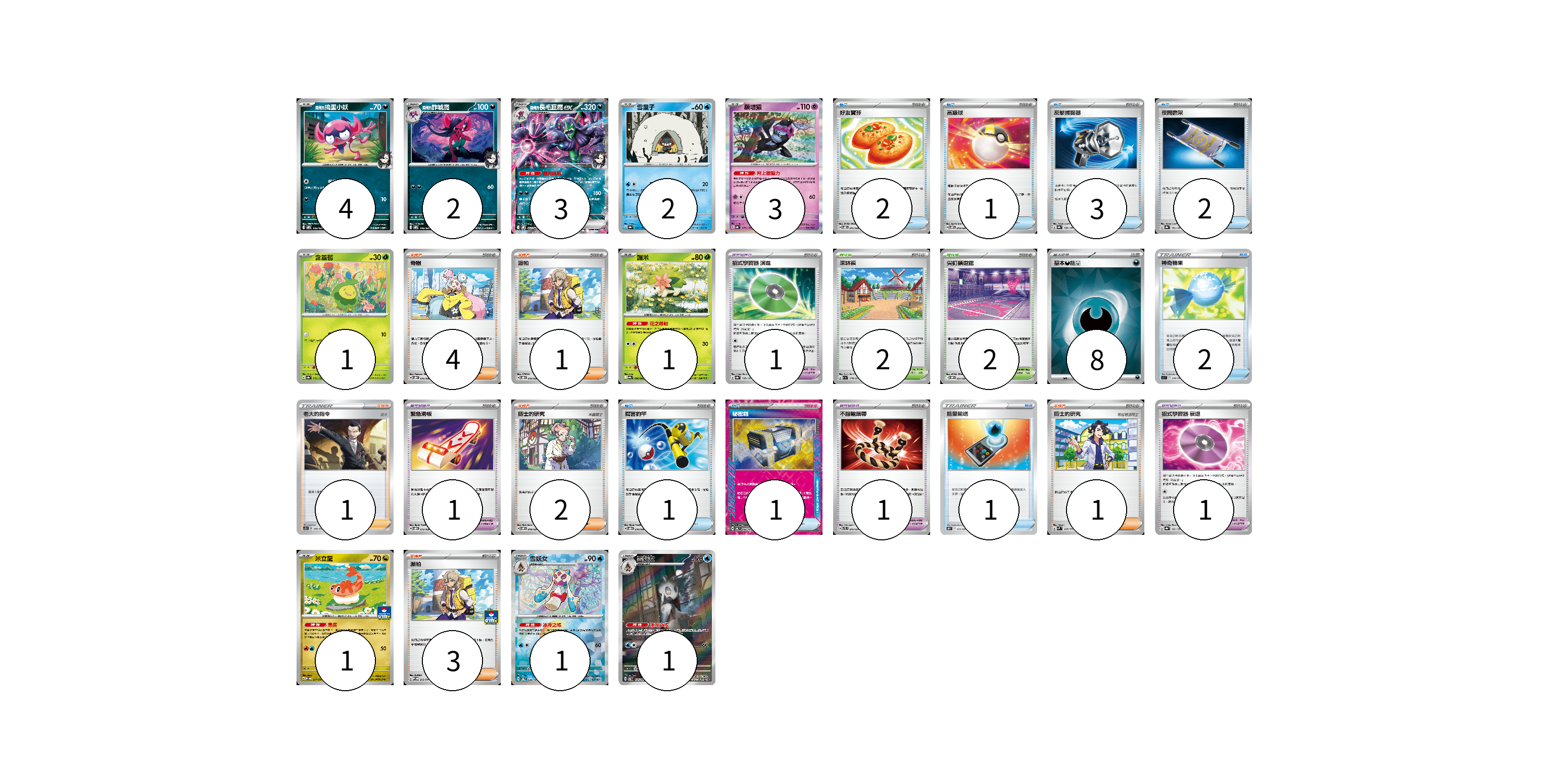 牌組構築方案 以此牌組為基礎新構築牌組 顯示卡面 顯示列表 寶可夢卡(19) 4 2 3 2 3 1 1 1 1 1 寶可夢道具(4) 1 1 1 1 物品卡(13) 2 1 3 2 2 1 1 1 支援者卡(12) 4 1 1 2 1 3 競技場卡(4) 2 2 能量卡(8) 8 寶可夢卡(19) 卡牌名稱 張數 卡牌名稱 張數 <瑪俐的>搗蛋小妖 SVOM 005/021 04 <瑪俐的>詐唬魔 SVOM 006/021 02 <瑪俐的>長毛巨魔ex SVOM 007/021 03 雪童子 SV8a 037/187 02 願增猿 SV8a 075/187 03 含羞苞 SV8a 001/187 01 謝米 SV9a 006/063 01 米立龍 SV-P 211/SV-P 01 雪妖女 SV8a 038/187 01 雪妖女 SV6 104/101 01 寶可夢道具(4) 卡牌名稱 張數 卡牌名稱 張數 招式學習器 演進 SV8a 160/187 01 緊急滑板 SVOD 015/020 01 不服輸頭帶 SVTL 016/021 01 招式學習器 衰退 SV8a 161/187 01 物品卡(13) 卡牌名稱 張數 卡牌名稱 張數 好友寶芬 SVOD 011/020 02 高級球 SVOM 013/021 01 反擊捕捉器 SV8a 139/187 03 夜間擔架 SV8a 151/187 02 神奇糖果 SI 376/414 02 厲害釣竿 SVOD 010/020 01 秘密箱 SV6 092/101 01 能量輸送 SN 013/024 01 支援者卡(12) 卡牌名稱 張數 卡牌名稱 張數 奇樹 SVOD 016/020 04 派帕 SVOD 018/020 01 老大的指令(坂木) SC1b 148/153 01 博士的研究 SVOM 019/021 02 博士的研究 SVM 167/175 01 派帕 SV-P 213/SV-P 03 競技場卡(4) 卡牌名稱 張數 卡牌名稱 張數 深缽鎮 SV1a 070/073 02 尖釘鎮道館 SVOM 021/021 02 能量卡(8) 卡牌名稱 張數 卡牌名稱 張數 基本【惡】能量 SVOM DAR 08 以此牌組為基礎新構築牌組 牌組編碼 ITwtPl-ZCJuFI-osDGQx copy 列印牌組單 牌組編碼已複製 分享至SNS