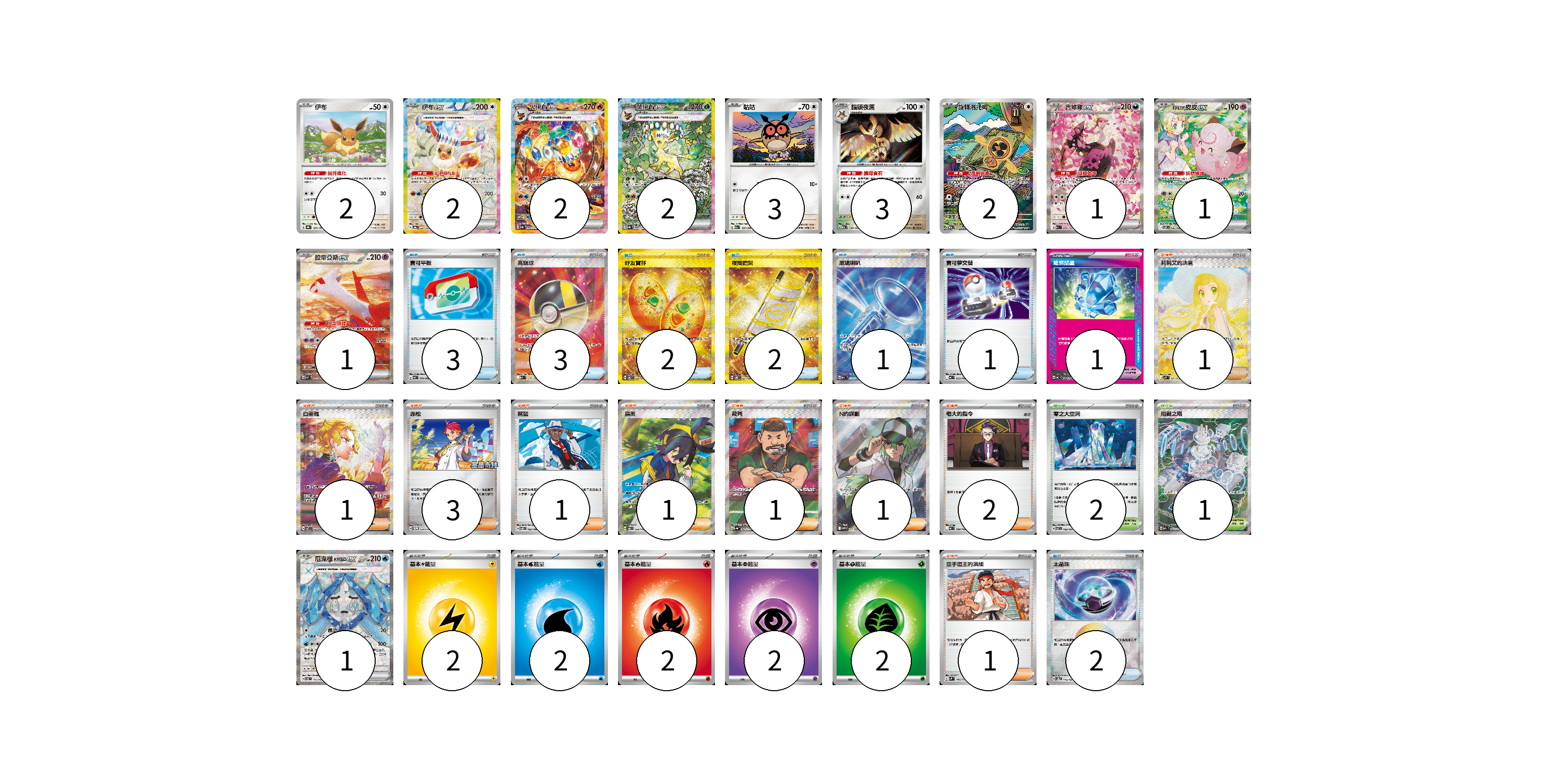 牌組構築方案 以此牌組為基礎新構築牌組 顯示卡面 顯示列表 寶可夢卡(20) 2 2 2 2 3 3 2 1 1 1 1 寶可夢道具(1) 1 物品卡(14) 3 3 2 2 1 1 2 支援者卡(12) 1 1 3 1 1 1 1 2 1 競技場卡(3) 2 1 能量卡(10) 2 2 2 2 2 寶可夢卡(20) 卡牌名稱 張數 卡牌名稱 張數 伊布 SV8a 125/187 02 伊布ex SV8a 223/187 02 火伊布ex SV8a 202/187 02 葉伊布ex SV8a 200/187 02 咕咕 M2a 137/193 03 貓頭夜鷹 M2a 138/193 03 旋轉洛托姆 M2a 213/193 02 吉雉雞ex M2a 244/193 01 莉莉艾的皮皮ex SV9 126/100 01 拉帝亞斯ex SV7a 087/064 01 厄鬼椪 水井面具ex SV6 117/101 01 寶可夢道具(1) 卡牌名稱 張數 卡牌名稱 張數 璀璨結晶 MC 680/742 01 物品卡(14) 卡牌名稱 張數 卡牌名稱 張數 寶可平板 M3 070/080 03 高級球 M2a 216/193 03 好友寶芬 SV6 133/101 02 夜間擔架 SV8 137/106 02 玻璃喇叭 M2a 215/193 01 寶可夢交替 MC 663/742 01 太晶珠 SV8a 145/187 02 支援者卡(12) 卡牌名稱 張數 卡牌名稱 張數 莉莉艾的決意 M1L 091/063 01 白蕾雅 SV7 132/102 01 赤松 SV-P 150/SV-P 03 席藍 SV8 102/106 01 烏栗 SV6 122/101 01 裁判 SV4a 342/190 01 N的謀劃 SV11B 165/086 01 老大的指令 MC 724/742 02 空手道王的演練 SVM 146/175 01 競技場卡(3) 卡牌名稱 張數 卡牌名稱 張數 零之大空洞 SV7 102/102 02 阻礙之塔 M2a 222/193 01 能量卡(10) 卡牌名稱 張數 卡牌名稱 張數 基本【雷】能量 MC LIG 02 基本【水】能量 MC WAT 02 基本【火】能量 MC FIR 02 基本【超】能量 MC PSY 02 基本【草】能量 MC GRA 02 以此牌組為基礎新構築牌組 牌組編碼 IUAZOA-RpAFdp-jLblQg copy 列印牌組單 牌組編碼已複製 分享至SNS