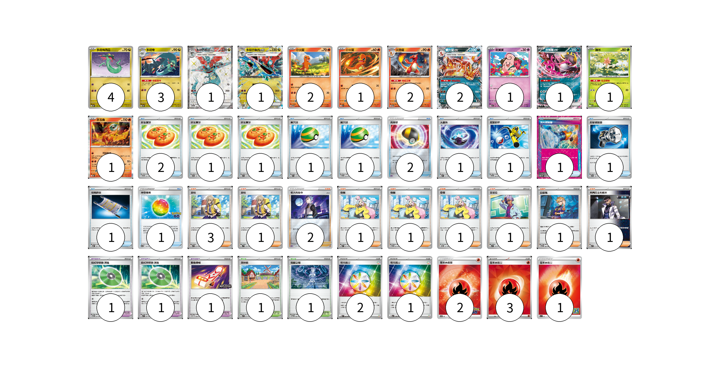 牌組構築方案 以此牌組為基礎新構築牌組 顯示卡面 顯示列表 寶可夢卡(20) 4 3 1 1 2 1 2 2 1 1 1 1 寶可夢道具(3) 1 1 1 物品卡(14) 2 1 1 1 1 2 1 1 1 1 1 1 支援者卡(12) 3 1 2 1 1 1 1 1 1 競技場卡(2) 1 1 能量卡(9) 2 1 2 3 1 寶可夢卡(20) 卡牌名稱 張數 卡牌名稱 張數 多龍梅西亞 SV8a 118/187 04 多龍奇 SV8a 119/187 03 多龍巴魯托ex SV6 120/101 01 多龍巴魯托ex SV8a 120/187 01 小火龍 SVTL 001/021 02 小火龍 SV3 012/108 01 火恐龍 SVTL 002/021 02 噴火龍ex SVTL 006/021 02 皮寶寶 SV3 042/108 01 吉雉雞ex SV8a 104/187 01 謝米 SV9a 006/063 01 古玉魚 SV8a 025/187 01 寶可夢道具(3) 卡牌名稱 張數 卡牌名稱 張數 招式學習器 演進 SVTL 017/021 01 招式學習器 演進 SVK 025/042 01 緊急滑板 SV-P 140/SV-P 01 物品卡(14) 卡牌名稱 張數 卡牌名稱 張數 好友寶芬 SVTG 011/019 02 好友寶芬 SV8a 147/187 01 好友寶芬 SVK 015/042 01 巢穴球 SVK 016/042 01 巢穴球 SVTR 013/021 01 高級球 SPD 010/020 02 太晶珠 SVK 013/042 01 厲害釣竿 SVTL 009/021 01 頂尖捕捉器 SV8a 148/187 01 反擊捕捉器 SV8a 139/187 01 夜間擔架 SV8a 151/187 01 神奇糖果 S10b 066/071 01 支援者卡(12) 卡牌名稱 張數 卡牌名稱 張數 派帕 SVK 035/042 03 派帕 SV1V 076/078 01 老大的指令(赤日) SPD 020/020 02 奇樹 SVK 031/042 01 奇樹 SVTR 017/021 01 奇樹 SVEM 017/020 01 吉尼亞 SV1S 074/078 01 白蕾雅 SV7 100/102 01 弗圖博士的劇本 SVK 034/042 01 競技場卡(2) 卡牌名稱 張數 卡牌名稱 張數 深缽鎮 SVK 039/042 01 阻礙之塔 SV6 100/101 01 能量卡(9) 卡牌名稱 張數 卡牌名稱 張數 夜光能量 SVK 042/042 02 夜光能量 SV4a 190/190 01 基本火能量 S10b FIR 02 基本【火】能量 SVM FIR 03 基本火能量 S8a FIR 01 以此牌組為基礎新構築牌組 牌組編碼 IVaqKB-BKiryx-RECdZt copy 列印牌組單 牌組編碼已複製 分享至SNS