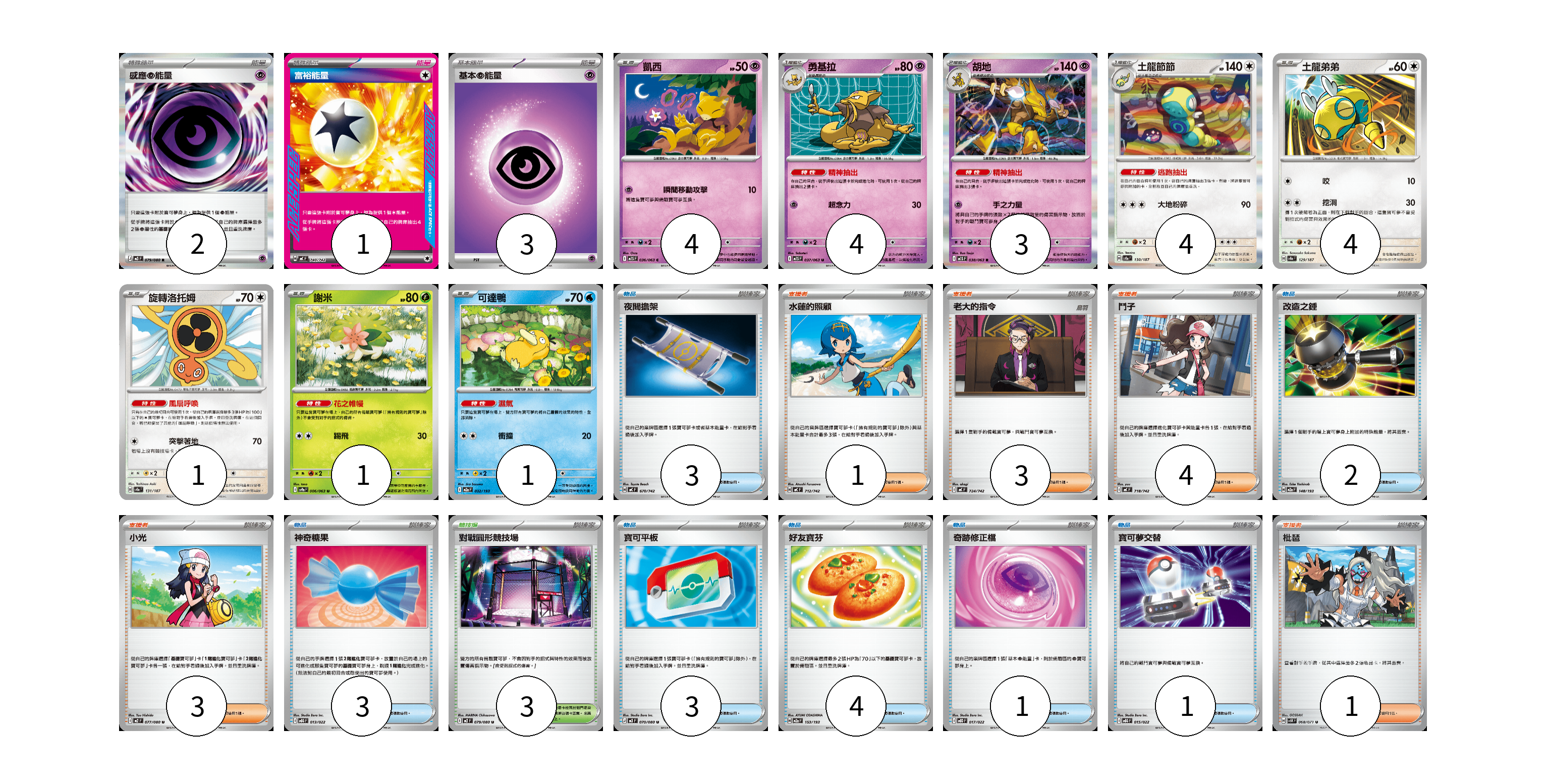 牌組構築方案 以此牌組為基礎新構築牌組 顯示卡面 顯示列表 寶可夢卡(22) 4 4 3 4 4 1 1 1 物品卡(17) 3 2 3 3 4 1 1 支援者卡(12) 1 3 4 3 1 競技場卡(3) 3 能量卡(6) 2 1 3 寶可夢卡(22) 卡牌名稱 張數 卡牌名稱 張數 凱西 M1S 036/063 04 勇基拉 M1S 037/063 04 胡地 M1S 038/063 03 土龍節節 SV8a 130/187 04 土龍弟弟 SV8a 129/187 04 旋轉洛托姆 SV8a 131/187 01 謝米 SV9a 006/063 01 可達鴨 M2a 032/193 01 物品卡(17) 卡牌名稱 張數 卡牌名稱 張數 夜間擔架 MC 670/742 03 改造之錘 M2a 148/193 02 神奇糖果 MBG 013/022 03 寶可平板 M3 070/080 03 好友寶芬 M2a 153/193 04 奇跡修正檔 MBD 017/022 01 寶可夢交替 MBG 015/022 01 支援者卡(12) 卡牌名稱 張數 卡牌名稱 張數 水蓮的照顧 MC 712/742 01 老大的指令 MC 724/742 03 鬥子 MC 718/742 04 小光 M2 077/080 03 枇琶 SV5K 068/071 01 競技場卡(3) 卡牌名稱 張數 卡牌名稱 張數 對戰圓形競技場 M2 079/080 03 能量卡(6) 卡牌名稱 張數 卡牌名稱 張數 感應【超】能量 M3 079/080 02 富裕能量 MC 740/742 01 基本【超】能量 MC PSY 03 以此牌組為基礎新構築牌組 牌組編碼 IWbeDK-QIkyvb-gwkxJS copy 列印牌組單 牌組編碼已複製 分享至SNS