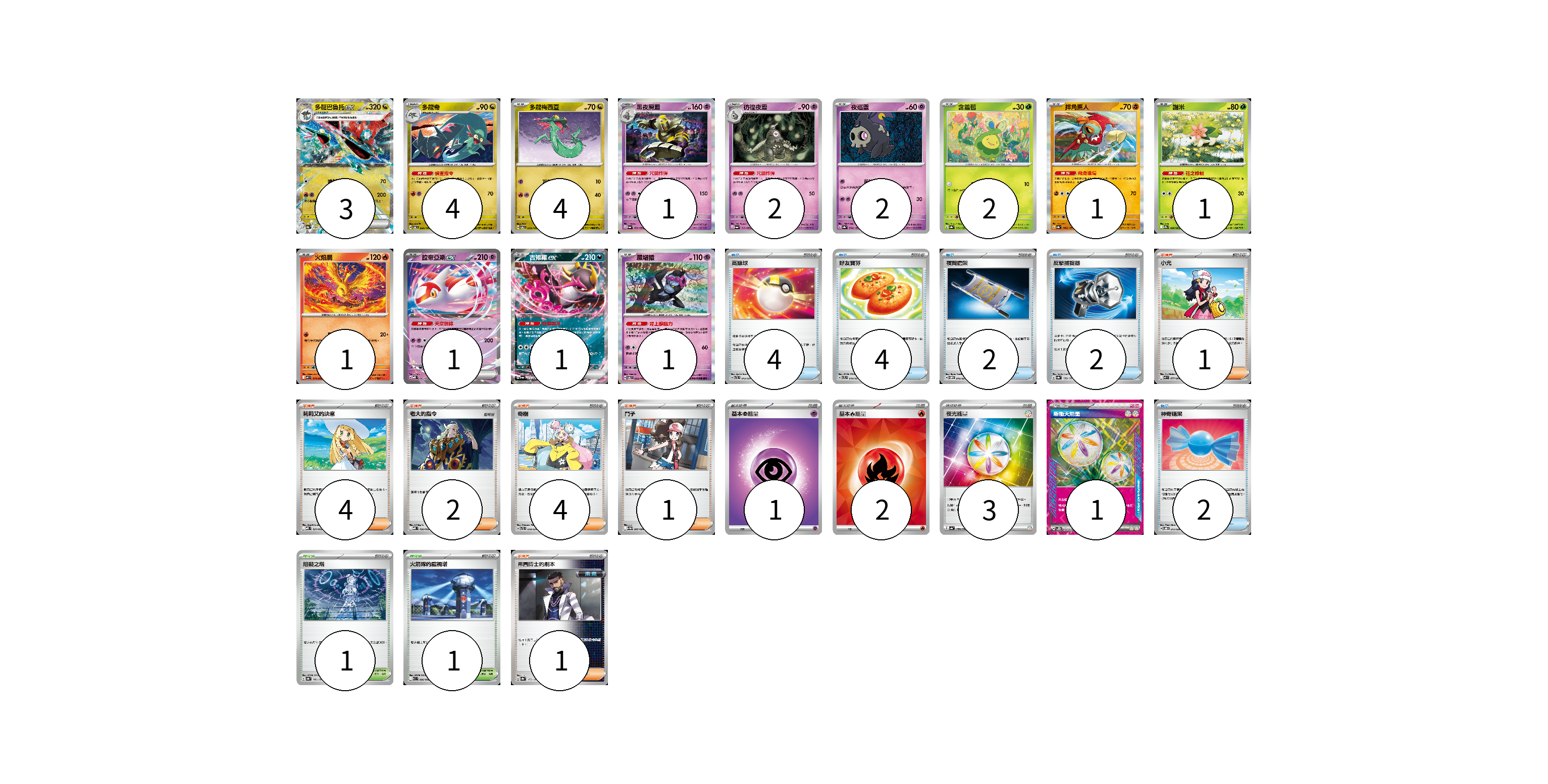 牌組構築方案 以此牌組為基礎新構築牌組 顯示卡面 顯示列表 寶可夢卡(24) 3 4 4 1 2 2 2 1 1 1 1 1 1 寶可夢道具(4) 4 物品卡(14) 4 4 2 2 2 支援者卡(9) 1 4 2 1 1 競技場卡(2) 1 1 能量卡(7) 1 2 3 1 寶可夢卡(24) 卡牌名稱 張數 卡牌名稱 張數 多龍巴魯托ex SV8a 120/187 03 多龍奇 SV6 080/101 04 多龍梅西亞 SV6 079/101 04 黑夜魔靈 SV6a 020/064 01 彷徨夜靈 SV6a 019/064 02 夜巡靈 SV8a 064/187 02 含羞苞 SV8a 001/187 02 摔角鷹人 SV8a 084/187 01 謝米 SV9a 006/063 01 火焰鳥 M2 014/080 01 拉帝亞斯ex MBD 003/022 01 吉雉雞ex SV6a 038/064 01 願增猿 SV6 055/101 01 寶可夢道具(4) 卡牌名稱 張數 卡牌名稱 張數 奇樹 SVTL 018/021 04 物品卡(14) 卡牌名稱 張數 卡牌名稱 張數 高級球 SVTL 012/021 04 好友寶芬 SVTL 010/021 04 夜間擔架 SVOM 016/021 02 反擊捕捉器 SV8a 139/187 02 神奇糖果 SVOD 013/020 02 支援者卡(9) 卡牌名稱 張數 卡牌名稱 張數 小光 M2 077/080 01 莉莉艾的決意 MBD 021/022 04 老大的指令 MBD 020/022 02 鬥子 SV11W 085/086 01 弗圖博士的劇本 SV8a 175/187 01 競技場卡(2) 卡牌名稱 張數 卡牌名稱 張數 阻礙之塔 SV8a 181/187 01 火箭隊的監視塔 SV10 096/098 01 能量卡(7) 卡牌名稱 張數 卡牌名稱 張數 基本【超】能量 M-P PSY 01 基本【火】能量 SVQL FIR 02 夜光能量 SV4a 190/190 03 新衝天能量 SV5K 071/071 01 以此牌組為基礎新構築牌組 牌組編碼 IYPRVn-FWQBjQ-gEXXBh copy 列印牌組單 牌組編碼已複製 分享至SNS