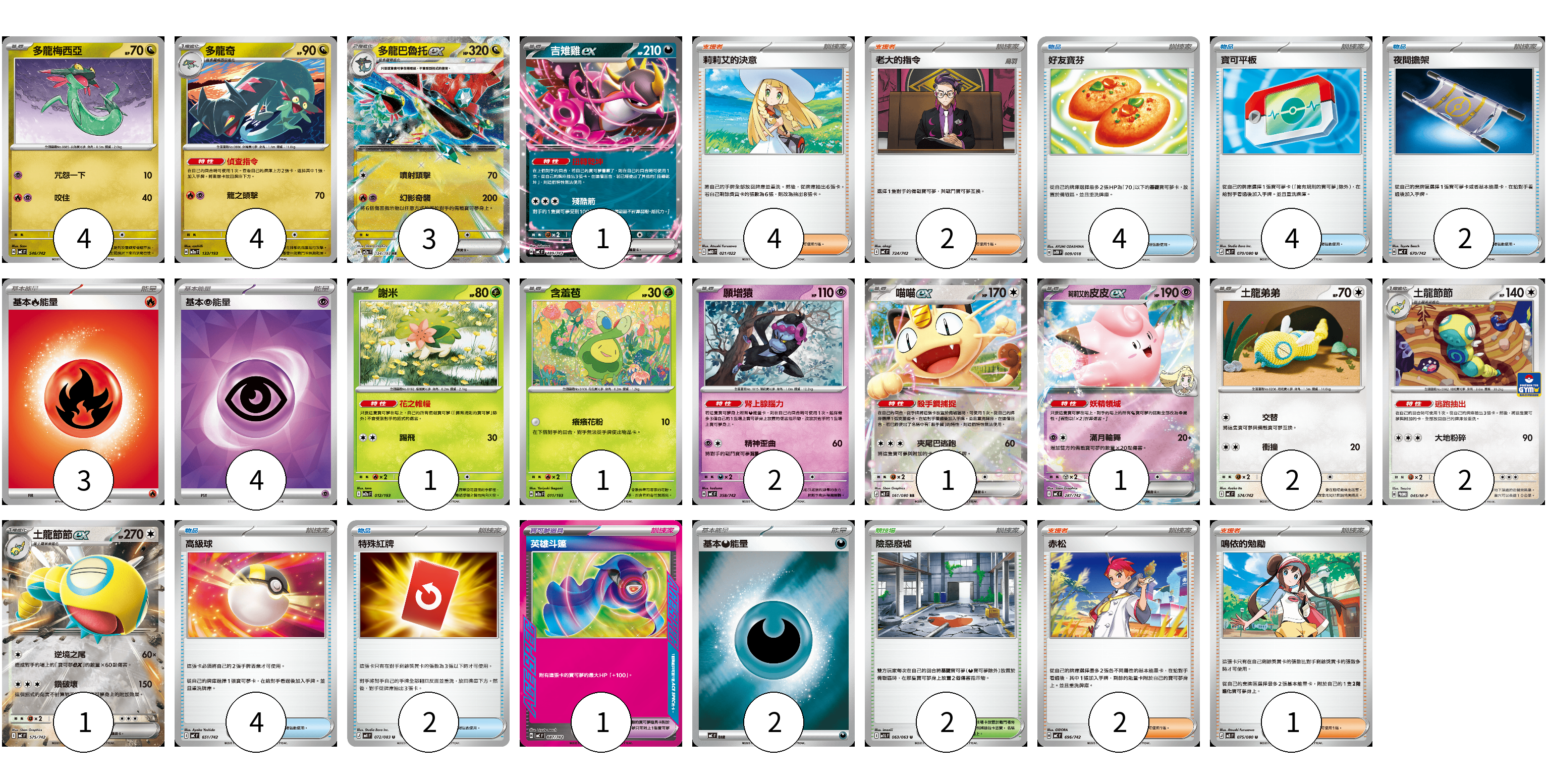 牌組構築方案 以此牌組為基礎新構築牌組 顯示卡面 顯示列表 寶可夢卡(23) 4 4 3 1 1 1 2 1 1 2 2 1 寶可夢道具(1) 1 物品卡(16) 4 4 2 4 2 支援者卡(9) 4 2 2 1 競技場卡(2) 2 能量卡(9) 3 4 2 寶可夢卡(23) 卡牌名稱 張數 卡牌名稱 張數 多龍梅西亞 MC 546/742 04 多龍奇 M2a 133/193 04 多龍巴魯托ex M2a 134/193 03 吉雉雞ex MC 489/742 01 謝米 M2a 012/193 01 含羞苞 M2a 011/193 01 願增猿 MC 358/742 02 喵喵ex M3 061/080 01 莉莉艾的皮皮ex MC 287/742 01 土龍弟弟 MC 574/742 02 土龍節節 M-P 045/M-P 02 土龍節節ex MC 575/742 01 寶可夢道具(1) 卡牌名稱 張數 卡牌名稱 張數 英雄斗篷 MC 687/742 01 物品卡(16) 卡牌名稱 張數 卡牌名稱 張數 好友寶芬 SVTH 009/018 04 寶可平板 M3 070/080 04 夜間擔架 MC 670/742 02 高級球 MC 651/742 04 特殊紅牌 M4 072/083 02 支援者卡(9) 卡牌名稱 張數 卡牌名稱 張數 莉莉艾的決意 MBD 021/022 04 老大的指令 MC 724/742 02 赤松 MC 696/742 02 鳴依的勉勵 M3 075/080 01 競技場卡(2) 卡牌名稱 張數 卡牌名稱 張數 險惡廢墟 M1L 063/063 02 能量卡(9) 卡牌名稱 張數 卡牌名稱 張數 基本【火】能量 MC FIR 03 基本【超】能量 SVOD PSY 04 基本【惡】能量 MC DAR 02 以此牌組為基礎新構築牌組 牌組編碼 IbCbnd-RzewnK-GgNjtN copy 列印牌組單 牌組編碼已複製 分享至SNS