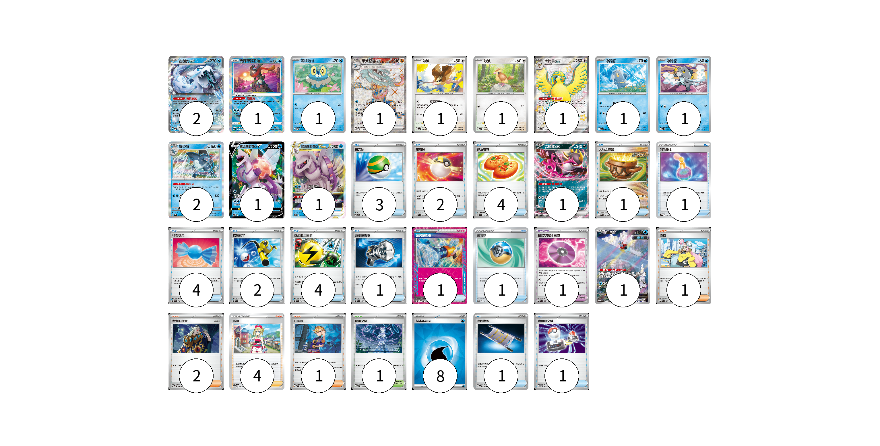 牌組構築方案 以此牌組為基礎新構築牌組 顯示卡面 顯示列表 寶可夢卡(16) 2 1 1 1 1 1 1 1 1 2 1 1 1 1 寶可夢道具(1) 1 物品卡(26) 3 2 4 1 1 4 2 4 1 1 1 1 1 支援者卡(8) 1 2 4 1 競技場卡(1) 1 能量卡(8) 8 寶可夢卡(16) 卡牌名稱 張數 卡牌名稱 張數 古劍豹ex SV2P 028/071 02 光輝甲賀忍蛙 SVF 004/038 01 呱呱泡蛙 SVD 027/139 01 甲賀忍蛙ex SV5a 083/066 01 波波 SV4a 137/190 01 波波 SV3 087/108 01 大比鳥ex SV4a 335/190 01 涼脊龍 SV4a 051/190 01 涼脊龍 SV2P 024/071 01 戟脊龍 SV2P 027/071 02 起源帕路奇亞V S12a 027/172 01 起源帕路奇亞VSTAR S10P 023/067 01 吉雉雞ex SV6a 038/064 01 鐵包袱 SV4M 071/066 01 寶可夢道具(1) 卡牌名稱 張數 卡牌名稱 張數 招式學習器 衰退 SVK 026/042 01 物品卡(26) 卡牌名稱 張數 卡牌名稱 張數 巢穴球 SVD 118/139 03 高級球 SVK 018/042 02 好友寶芬 SVK 015/042 04 大地之容器 SVK 012/042 01 消除香水 SVF 011/038 01 神奇糖果 SVK 019/042 04 厲害釣竿 SVK 011/042 02 超級能量回收 SVK 010/042 04 反擊捕捉器 SVK 009/042 01 頂尖捕捉器 SV5M 062/071 01 飛羽球 S10D 063/067 01 夜間擔架 SV6a 056/064 01 寶可夢交替 SVTH 012/018 01 支援者卡(8) 卡牌名稱 張數 卡牌名稱 張數 奇樹 SVK 031/042 01 老大的指令 SVK 036/042 02 珠貝 SVTG 016/019 04 白蕾雅 SV7 100/102 01 競技場卡(1) 卡牌名稱 張數 卡牌名稱 張數 阻礙之塔 SV6 100/101 01 能量卡(8) 卡牌名稱 張數 卡牌名稱 張數 基本【水】能量 SVK WAT 08 以此牌組為基礎新構築牌組 牌組編碼 IbsSjc-jcBeon-nzpLdq copy 列印牌組單 牌組編碼已複製 分享至SNS