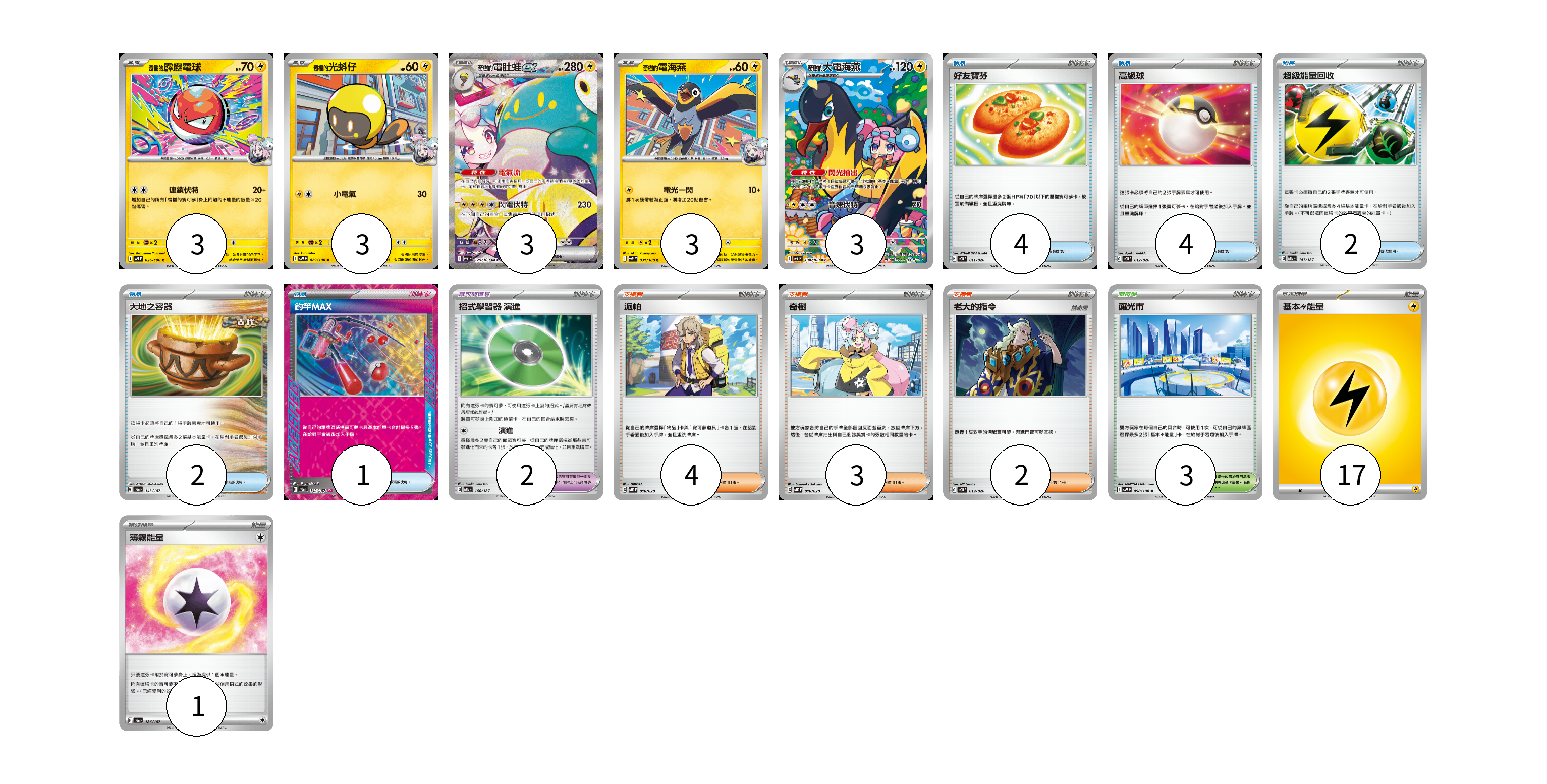牌組構築方案 以此牌組為基礎新構築牌組 顯示卡面 顯示列表 寶可夢卡(15) 3 3 3 3 3 寶可夢道具(2) 2 物品卡(13) 4 4 2 2 1 支援者卡(9) 4 3 2 競技場卡(3) 3 能量卡(18) 17 1 寶可夢卡(15) 卡牌名稱 張數 卡牌名稱 張數 奇樹的霹靂電球 SV9 026/100 03 奇樹的光蚪仔 SV9 029/100 03 奇樹的電肚蛙ex SV9 125/100 03 奇樹的電海燕 SV9 031/100 03 奇樹的大電海燕 SV9 104/100 03 寶可夢道具(2) 卡牌名稱 張數 卡牌名稱 張數 招式學習器 演進 SV8a 160/187 02 物品卡(13) 卡牌名稱 張數 卡牌名稱 張數 好友寶芬 SVOD 011/020 04 高級球 SVOD 012/020 04 超級能量回收 SV8a 141/187 02 大地之容器 SV8a 143/187 02 釣竿MAX SV8a 142/187 01 支援者卡(9) 卡牌名稱 張數 卡牌名稱 張數 派帕 SVOD 018/020 04 奇樹 SVOD 016/020 03 老大的指令 SVOD 019/020 02 競技場卡(3) 卡牌名稱 張數 卡牌名稱 張數 釀光市 SV9 098/100 03 能量卡(18) 卡牌名稱 張數 卡牌名稱 張數 基本【雷】能量 SVTR LIG 17 薄霧能量 SV8a 186/187 01 以此牌組為基礎新構築牌組 牌組編碼 IbuVUp-wDPWSq-MANyGN copy 列印牌組單 牌組編碼已複製 分享至SNS