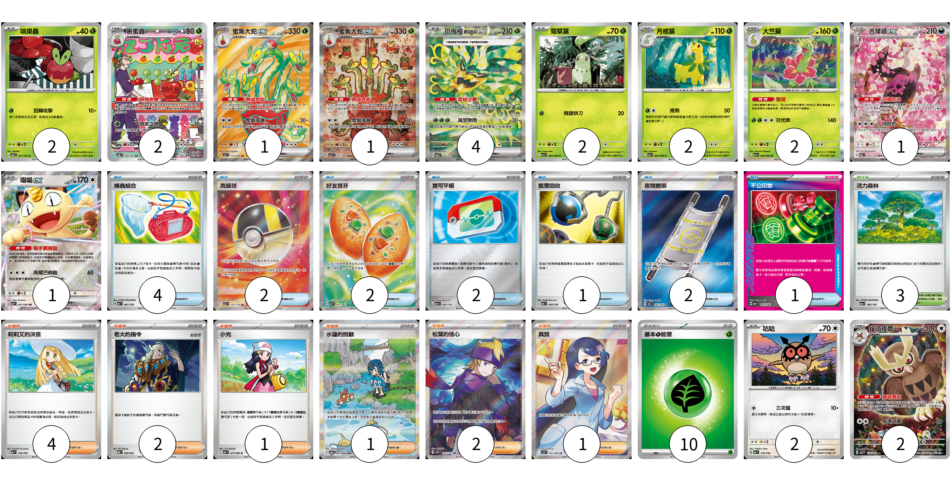 牌組構築方案 以此牌組為基礎新構築牌組 顯示卡面 顯示列表 寶可夢卡(22) 2 2 1 1 4 2 2 2 1 1 2 2 物品卡(14) 4 2 2 2 1 2 1 支援者卡(11) 4 2 1 1 2 1 競技場卡(3) 3 能量卡(10) 10 寶可夢卡(22) 卡牌名稱 張數 卡牌名稱 張數 啃果蟲 SV6 011/101 02 裹蜜蟲 SV6 103/101 02 蜜集大蛇ex SV7 115/102 01 蜜集大蛇ex SV7 127/102 01 厄鬼椪 碧草面具ex SV6 125/101 04 菊草葉 M1S 003/063 02 月桂葉 M1S 004/063 02 大竺葵 M1S 005/063 02 吉雉雞ex M2a 244/193 01 喵喵ex M3 061/080 01 咕咕 MC 572/742 02 貓頭夜鷹 SV7 114/102 02 物品卡(14) 卡牌名稱 張數 卡牌名稱 張數 捕蟲組合 MC 667/742 04 高級球 M2a 216/193 02 好友寶芬 M1S 081/063 02 寶可平板 MC 662/742 02 能量回收 MC 636/742 01 夜間擔架 M1L 083/063 02 不公印章 MC 633/742 01 支援者卡(11) 卡牌名稱 張數 卡牌名稱 張數 莉莉艾的決意 MC 729/742 04 老大的指令 MBD 020/022 02 小光 M2 077/080 01 水蓮的照顧 SV5a 093/066 01 松葉的信心 SV5K 092/071 02 真菰 SV11B 166/086 01 競技場卡(3) 卡牌名稱 張數 卡牌名稱 張數 活力森林 M2a 182/193 03 能量卡(10) 卡牌名稱 張數 卡牌名稱 張數 基本【草】能量 MJ GRA 10 以此牌組為基礎新構築牌組 牌組編碼 Ifzaeg-ZRdwen-FeiMXt copy 列印牌組單 牌組編碼已複製 分享至SNS