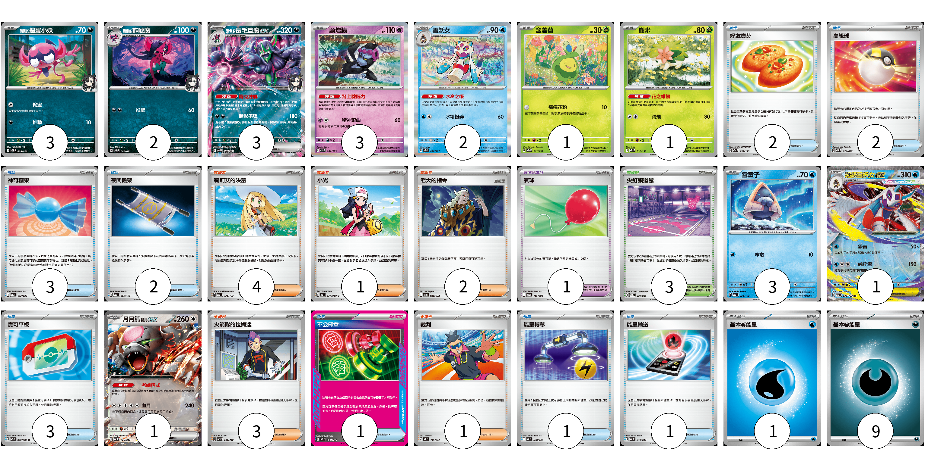 牌組構築方案 以此牌組為基礎新構築牌組 顯示卡面 顯示列表 寶可夢卡(20) 3 2 3 3 2 1 1 3 1 1 寶可夢道具(1) 1 物品卡(15) 2 2 3 2 3 1 1 1 支援者卡(11) 4 1 2 3 1 競技場卡(3) 3 能量卡(10) 1 9 寶可夢卡(20) 卡牌名稱 張數 卡牌名稱 張數 <瑪俐的>搗蛋小妖 SVOM 005/021 03 <瑪俐的>詐唬魔 SVOM 006/021 02 <瑪俐的>長毛巨魔ex SVOM 007/021 03 願增猿 M2a 081/193 03 雪妖女 SV8a 038/187 02 含羞苞 M2a 011/193 01 謝米 M2a 012/193 01 雪童子 M2a 035/193 03 超級雪妖女ex M2a 036/193 01 月月熊 赫月 ex MC 625/742 01 寶可夢道具(1) 卡牌名稱 張數 卡牌名稱 張數 氣球 M2a 165/193 01 物品卡(15) 卡牌名稱 張數 卡牌名稱 張數 好友寶芬 M2a 153/193 02 高級球 MBD 014/022 02 神奇糖果 MBG 013/022 03 夜間擔架 M2a 159/193 02 寶可平板 M3 070/080 03 不公印章 MC 633/742 01 能量轉移 MC 638/742 01 能量輸送 MC 639/742 01 支援者卡(11) 卡牌名稱 張數 卡牌名稱 張數 莉莉艾的決意 M2a 175/193 04 小光 M2 077/080 01 老大的指令 MBD 020/022 02 火箭隊的拉姆達 MC 734/742 03 裁判 MC 711/742 01 競技場卡(3) 卡牌名稱 張數 卡牌名稱 張數 尖釘鎮道館 SVOM 021/021 03 能量卡(10) 卡牌名稱 張數 卡牌名稱 張數 基本【水】能量 MC WAT 01 基本【惡】能量 MC DAR 09 以此牌組為基礎新構築牌組 牌組編碼 InRScq-dXUlmV-twnppT copy 列印牌組單 牌組編碼已複製 分享至SNS