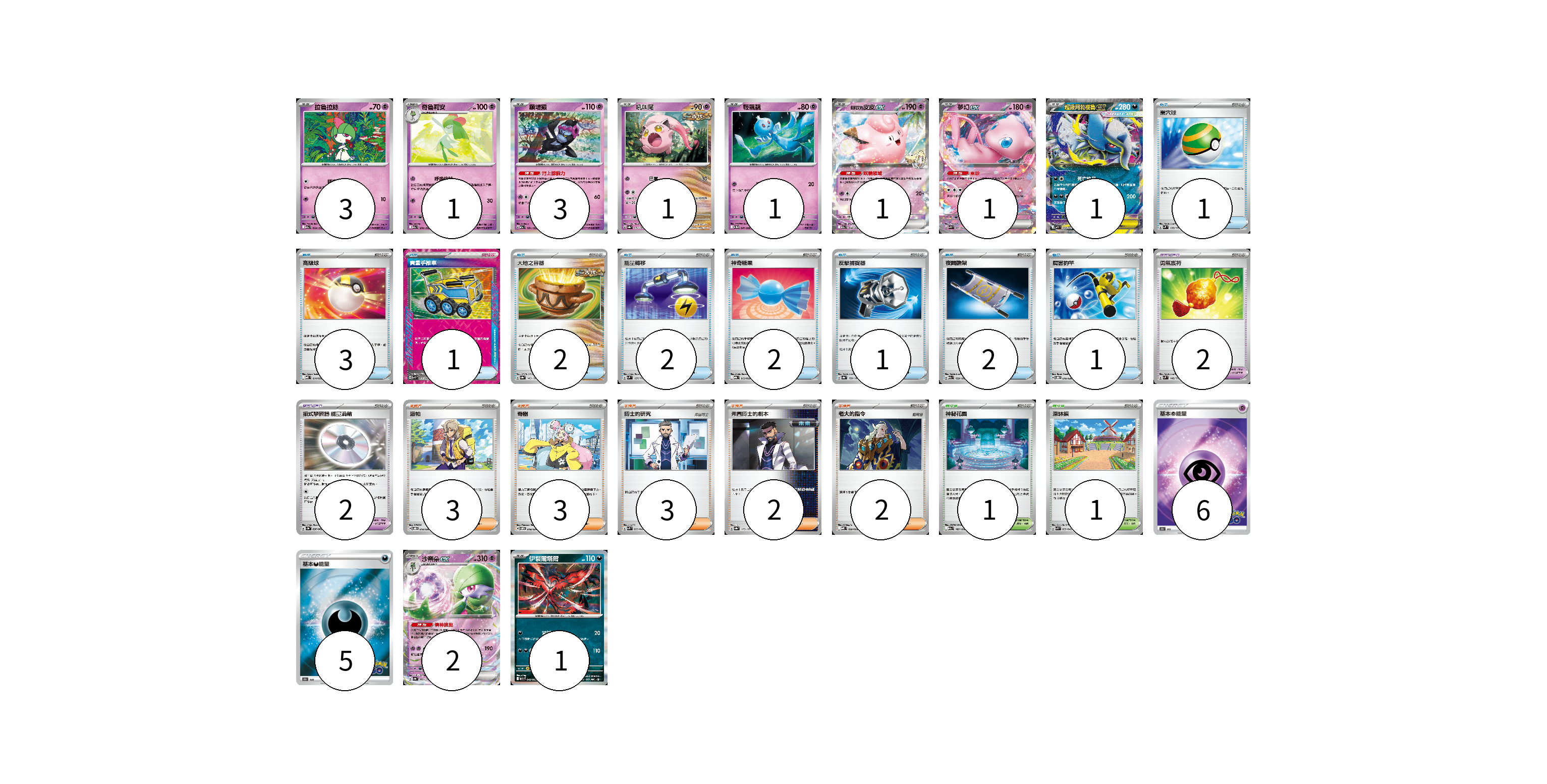 牌組構築方案 以此牌組為基礎新構築牌組 顯示卡面 顯示列表 寶可夢卡(15) 3 1 3 1 1 1 1 1 2 1 寶可夢道具(4) 2 2 物品卡(15) 1 3 1 2 2 2 1 2 1 支援者卡(13) 3 3 3 2 2 競技場卡(2) 1 1 能量卡(11) 6 5 寶可夢卡(15) 卡牌名稱 張數 卡牌名稱 張數 拉魯拉絲 M2a 069/193 03 奇魯莉安 M2a 070/193 01 願增猿 M2a 081/193 03 吼叫尾 SV8a 071/187 01 輕飄飄 SV11W 041/086 01 莉莉艾的皮皮ex M2a 060/193 01 夢幻ex SVK 001/042 01 超級阿勃梭魯ex M1L 038/063 01 沙奈朵ex SV4a 082/190 02 伊裴爾塔爾 M1L 040/063 01 寶可夢道具(4) 卡牌名稱 張數 卡牌名稱 張數 勇氣護符 SVM 142/175 02 招式學習器 能量渦輪 SV3a 056/062 02 物品卡(15) 卡牌名稱 張數 卡牌名稱 張數 巢穴球 SVM 133/175 01 高級球 MBD 014/022 03 貴重手推車 SVK 020/042 01 大地之容器 SV8a 143/187 02 能量轉移 SVM 127/175 02 神奇糖果 MBG 013/022 02 反擊捕捉器 SV8a 139/187 01 夜間擔架 M2a 159/193 02 厲害釣竿 SVOD 010/020 01 支援者卡(13) 卡牌名稱 張數 卡牌名稱 張數 派帕 SVOD 018/020 03 奇樹 SVOM 018/021 03 博士的研究 SVK 033/042 03 弗圖博士的劇本 SV8a 175/187 02 老大的指令 MBD 020/022 02 競技場卡(2) 卡牌名稱 張數 卡牌名稱 張數 神秘花園 M2a 187/193 01 深缽鎮 SVK 039/042 01 能量卡(11) 卡牌名稱 張數 卡牌名稱 張數 基本超能量 S10b PSY 06 基本惡能量 S10b DAR 05 以此牌組為基礎新構築牌組 牌組編碼 IoBXRQ-XAwpij-WsnkXi copy 列印牌組單 牌組編碼已複製 分享至SNS