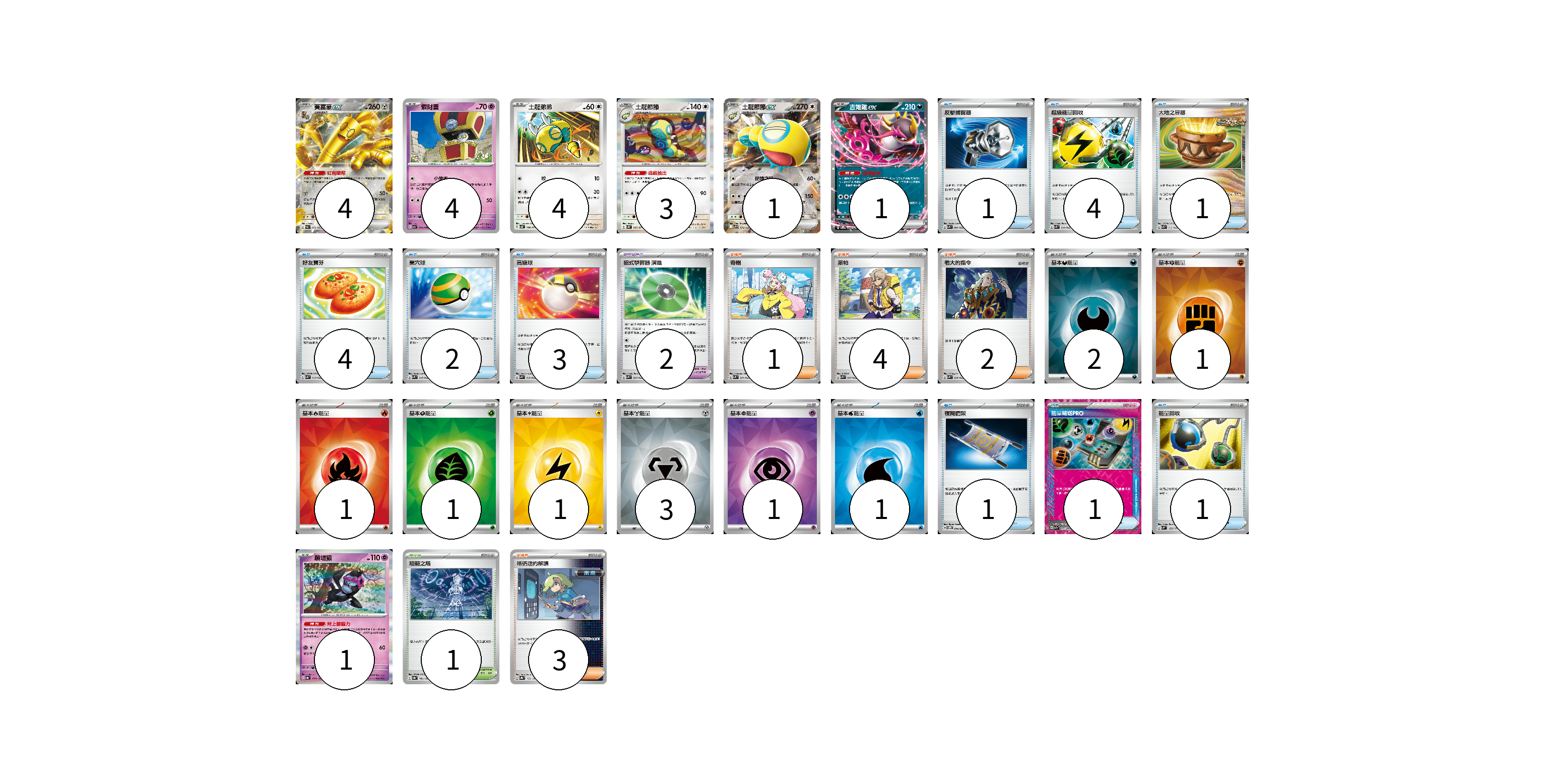 牌組構築方案 以此牌組為基礎新構築牌組 顯示卡面 顯示列表 寶可夢卡(18) 4 4 4 3 1 1 1 寶可夢道具(2) 2 物品卡(18) 1 4 1 4 2 3 1 1 1 支援者卡(10) 1 4 2 3 競技場卡(1) 1 能量卡(11) 2 1 1 1 1 3 1 1 寶可夢卡(18) 卡牌名稱 張數 卡牌名稱 張數 賽富豪ex SV3a 050/062 04 索財靈 SV7a 024/064 04 土龍弟弟 SV5K 056/071 04 土龍節節 SV5K 057/071 03 土龍節節ex SV9 079/100 01 吉雉雞ex SVOM 009/021 01 願增猿 SV8a 075/187 01 寶可夢道具(2) 卡牌名稱 張數 卡牌名稱 張數 招式學習器 演進 SVK 025/042 02 物品卡(18) 卡牌名稱 張數 卡牌名稱 張數 反擊捕捉器 SVK 009/042 01 超級能量回收 SVK 010/042 04 大地之容器 SVK 012/042 01 好友寶芬 SVK 015/042 04 巢穴球 SVK 016/042 02 高級球 SVK 018/042 03 夜間擔架 SVOM 016/021 01 能量輸送PRO SV7a 052/064 01 能量回收 SVM 125/175 01 支援者卡(10) 卡牌名稱 張數 卡牌名稱 張數 奇樹 SVK 031/042 01 派帕 SVK 035/042 04 老大的指令 SVK 036/042 02 暗碼迷的解讀 SV8a 165/187 03 競技場卡(1) 卡牌名稱 張數 卡牌名稱 張數 阻礙之塔 SV8a 181/187 01 能量卡(11) 卡牌名稱 張數 卡牌名稱 張數 基本【惡】能量 SVK DAR 02 基本【鬥】能量 SVK FIG 01 基本【火】能量 SVK FIR 01 基本【草】能量 SVK GRA 01 基本【雷】能量 SVK LIG 01 基本【鋼】能量 SVK MET 03 基本【超】能量 SVK PSY 01 基本【水】能量 SVK WAT 01 以此牌組為基礎新構築牌組 牌組編碼 IsGnEl-jIDQYu-VPNOjF copy 列印牌組單 牌組編碼已複製 分享至SNS