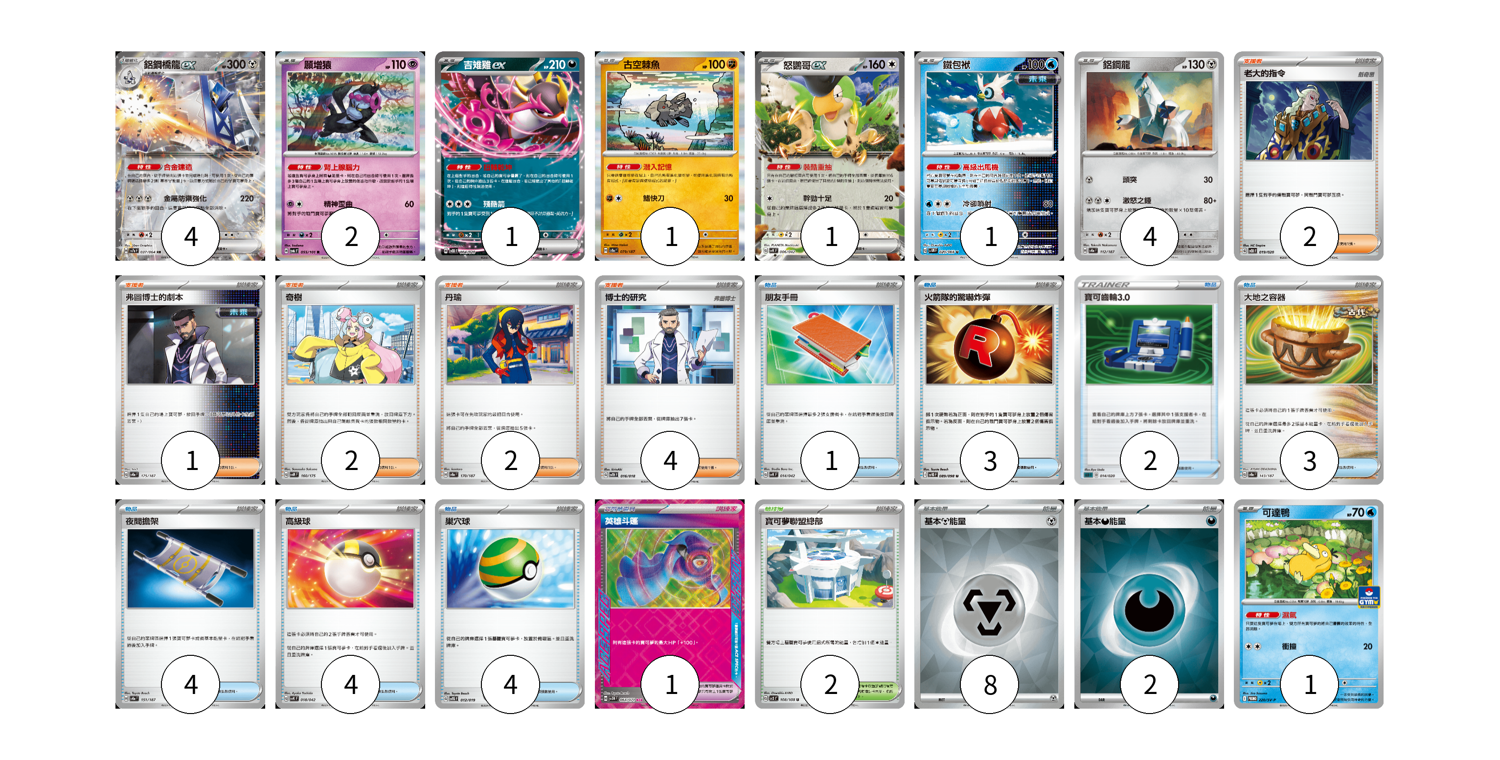 牌組構築方案 以此牌組為基礎新構築牌組 顯示卡面 顯示列表 寶可夢卡(15) 4 2 1 1 1 1 4 1 寶可夢道具(1) 1 物品卡(21) 1 3 2 3 4 4 4 支援者卡(11) 2 1 2 2 4 競技場卡(2) 2 能量卡(10) 8 2 寶可夢卡(15) 卡牌名稱 張數 卡牌名稱 張數 鋁鋼橋龍ex SV7a 037/064 04 願增猿 SV6 055/101 02 吉雉雞ex SVOD 004/020 01 古空棘魚 SV8a 079/187 01 怒鸚哥ex SVK 006/042 01 鐵包袱 SV4M 020/066 01 鋁鋼龍 SV8a 112/187 04 可達鴨 SV-P 220/SV-P 01 寶可夢道具(1) 卡牌名稱 張數 卡牌名稱 張數 英雄斗篷 SV5M 064/071 01 物品卡(21) 卡牌名稱 張數 卡牌名稱 張數 朋友手冊 SVK 014/042 01 火箭隊的驚嚇炸彈 SV10 089/098 03 寶可齒輪3.0 SLD 014/020 02 大地之容器 SV8a 143/187 03 夜間擔架 SV8a 151/187 04 高級球 SVK 018/042 04 巢穴球 SVTG 012/019 04 支援者卡(11) 卡牌名稱 張數 卡牌名稱 張數 老大的指令 SVOD 019/020 02 弗圖博士的劇本 SV8a 175/187 01 奇樹 SVM 160/175 02 丹瑜 SV8a 170/187 02 博士的研究 SVTH 016/018 04 競技場卡(2) 卡牌名稱 張數 卡牌名稱 張數 寶可夢聯盟總部 SV3 108/108 02 能量卡(10) 卡牌名稱 張數 卡牌名稱 張數 基本【鋼】能量 SVOD MET 08 基本【惡】能量 SVOM DAR 02 以此牌組為基礎新構築牌組 牌組編碼 IvAiIa-XwgHrS-ZbhwAJ copy 列印牌組單 牌組編碼已複製 分享至SNS